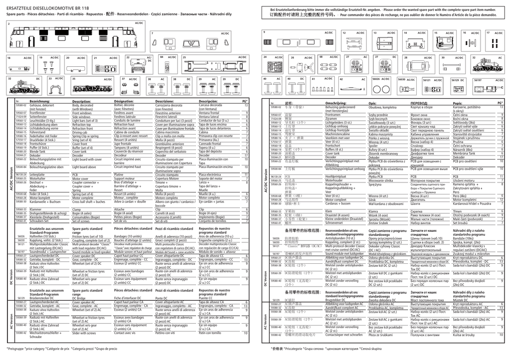 ERSATZTEILE DIESELLOKOMOTIVE BR 118 Bei Ersatzteilanforderung bitte immer die vollständige Ersatzteil-Nr. angeben. · Please order the wanted spare part with the complete spare part item number. Spare parts · Pièces détachées · Parti di ricambio · Repuestos · 配件 · Reserveonderdelen · Części zamienne · Запасные части · Náhradní díly 订购配件时请附上完整的配件号码。· Pour commander des pièces de rechange, ne pas oublier de donner le Numéro d’Article de la pièce demandée. AC/DC AC/DC 32 DC AC/DC Version 33 20 AC/DC AC/DC 21 35 22 AC/DC 37 AC/DC AC/ DC 84 38 AC AC/DC AC/DC 38 AC/DC 25 DC 39 AC 39 DC Description: Body, decorated (with Windows) Front windows Side windows Light bars (set of 3) Refraction top Refraction front Driving cab Spring Clip w spring Sring (set of 4) Cover front Buffer (set of 4) Cover tank Decoder Light board with cover Light board above Dèsignation: Boîtier, décorée (avec Fênetres) Fenêtres avant Fenêtres latérale Conduits de lumière Réfraction haut Réfraction avant Cabine de conduite Clip à ressort avec ressort Ressort (4 unités) Jupe frontale Tampons (4 unités) Couvercle du réservoir Decodeur Circuit imprimé avec barrière Circuit imprimé haut 59500-68 59560-28 59580-30 Leiterplatte Motorhalter Deichsel + Abdeckung + Feder Feder (4 Stck.) Motor komplett Kardanwelle + Buchsen PCB Motor cover Coupler connector + Coupler cover + Spring Spring (set of 4) Motor complete Cross ball shaft + buches Platine Support moteur Bras d’attelage + Barrière d’attelage + Resort Resort (4 unités) Moteur , complète Arbre à cardan + douille 59560-33 59580-35 59580-37 59560-41 Klammer Drehgestellblende (6 achsig) Kleinteile (Drehgestell) Schrauben-Set Clamp Bogie (4 axles) Consumables (Bogie) Set of screws Attache Bogie (4 axial) Petites pièces (Bogie) Set de vis Ersatzteile aus unserem Standard-Programm Haftreifen (10 Stck.) Kupplung, vollst. (2 Stck.) Multiprotokolldecoder Classic mit Lastregelung (DC/AC) Soundmodul + Lautsprecher Lautsprecherdeckel DC Getriebe, komplett - DC Spare parts standard range Friction tyres (set of 10) Coupling, complete (set of 2) Pièces détachées standard Pezzi di ricambio standard Bandages (10 unités) Boucles d’attelage (2 unités) Anelli di aderenza (10 pezzi) Gnaci completi (2 pezzi) Repuestos de nuestro programa standard Aros de adherencia (10 u.) Enganche completo (2 u.) Multi protocol decoder ”Classic” with load regulator (DC/AC) Sound module w loud-speaker Décodeur multi protocoles “Classic”avec régulation de charge Multi protocollo Classic con regolatore di carico (DC/AC) Decoder multiprotocolo Classic con regulación de carga (CC/CA) Module sonore et haut parleur Capot haut parleur CC Engrenage, complète - CC Essieux (2 unités) CC Modulo del Sound + casse acustiche Cover speaker DC Gear, complete - DC Wheelset (set of 2) DC Radsatz mit Haftreifen (2 Stck.) DC Radsatz ohne Zahnrad (2 Stck.) DC Wheelset w friction tyres (set of 2) DC Wheelset w/o gear (set of 2) DC Essieux avex bandages (2 unités) CC Essieux sans équipement (2 unités) CC Módulo de sonido + altavoz Tapa de altavoz CC Engranajes, completo - CC Eje sin aros de adherencia (2 u.) CC Eje con aros de adherencia (2 u.) CC Eje sin equipo (2 u.) CC Ersatzteile aus unserem Standard-Programm Brückenstecker DC Lautsprecherdeckel AC Getriebe, komplett - AC Spare parts standard range DC Bridge Cover speaker AC Gear, complete - AC Wheelset (set of 2) AC Pièces détachées standard Pezzi di ricambio standard Wheelset w friction tyres (set of 2) AC Wheelset w/o gear (set of 2) AC Slider with screws Essieux avex bandages (2 unités) CA Essieux sans équipement (2 unités) CA Contact avec vis 59560-07 71024-09 59560-12 59560-13 59560-14 59560-15 59580-16 57550-17 59560-18 59560-19 59580-20 59344-21 59560-22 59500-84 96130-24 59560-25 59560-26 56026 56030 56121 56197 59560-27 59580-32 59560-38 DC Version AC/DC Bezeichnung: Gehäuse, dekoriert (mit Fenster) Frontfenster Seitenfenster Leuchtstäbe (3-tlg.) Lichtabdeckung oben Lichtabdeckung vorne Führerstand Federhalter mit Feder Druckfeder (4 Stck.) Frontschürze Puffer (4 Stck.) Blende Tank Dekoder Beleuchtungsplatine mit Abdeckung Beleuchtungsplatine oben Nr: 59580-02 59560-39 59580-40 56129 59360-27 59380-32 59360-38 AC Version 19 59360-39 59380-40 59380-42 Radsatz ohne Haftreifen (2 Stck.) DC Radsatz ohne Haftreifen (2 Stck.) AC Radsatz mit Haftreifen (2 Stck.) AC Radsatz ohne Zahnrad (2 Stck.) AC Wechselstromschleifer + Schraube Fiche d’interfacer DC Capot haut parleur CA Engrenage, complète - CA Essieux (2 unités) CA *Preisgruppe *price category *Catégorie de prix *Categoria prezzi *Grupo de precio Descrizione: Carrozzeria decorata (con Finestre) Finestrino anteriore Finestrini laterali Condutture per luci (3 pezzi) Cover per illuminazione sopra Cover per illuminazione frontale Cabina maccinista Clip a molla con molla Molla (4 pezzi) Grembiulino anteriore Respingenti (4 pezzi) Coperchio del serbatoio Decoder Circuito stampato per illuminazione con Copertura Circuito stampato per illuminazione sopra Circuito stampato Copertura Motore Timone + Copertura timone + Molla Molla (4 pezzi) Motore completo Albero con giunto / cardanico / boccole Clip Carrelli (4 assi) Accessorio (Carrelli) Set di viti Cover altoparlante DC Ingranaggio, completto - DC Ruote senza anelli di aderenza (2 pezzi) DC Ruote con anelli di aderenza (2 pezzi) DC Ruote senza ingranaggio (2 pezzi) DC Ponte DC Cover altoparlante AC Ingranaggio, completto - AC Ruote senza anelli di aderenza (2 pezzi) AC Ruote con anelli di aderenza (2 pezzi) AC Ruote senza ingranaggio (2 pezzi) AC Pattino con viti Descripción: Carcasa decorada (con Ventana) Ventana frontal Ventana lateral Conductor de luz (3 u.) Tapa de luces encima Tapa de luces delanteros Cabina Primavera clip con resorte Primavera (4u.) Carenado frontal Topera (4 u.) Tapa del depósito Decoder Placa illuminación con Tapa Plac