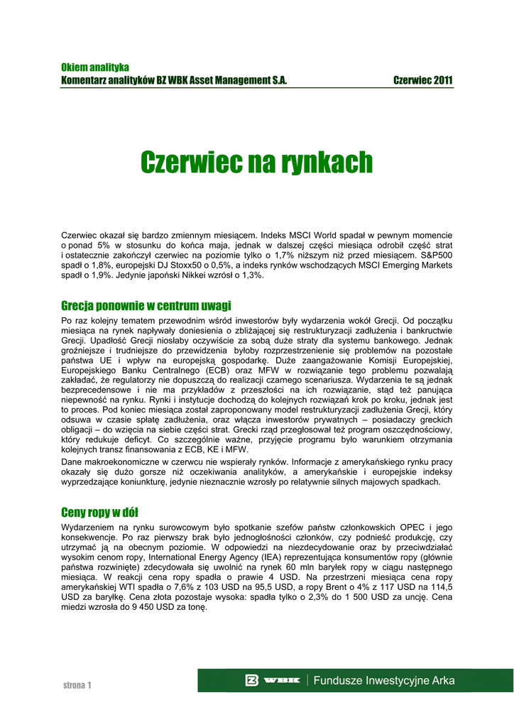 Okiem analityka Komentarz analityków BZ WBK Asset Management S.A. Czerwiec 2011 Czerwiec na rynkach Czerwiec okazał się bardzo zmiennym miesiącem. Indeks MSCI World spadał w pewnym momencie o ponad 5% w stosunku do końca maja, jednak w dalszej części miesiąca odrobił część strat i ostatecznie zakończył czerwiec na poziomie tylko o 1,7% niższym niż przed miesiącem. S&P500 spadł o 1,8%, europejski DJ Stoxx50 o 0,5%, a indeks rynków wschodzących MSCI Emerging Markets spadł o 1,9%. Jedynie japoński Nikkei wzrósł o 1,3%. Grecja ponownie w centrum uwagi Po raz kolejny tematem przewodnim wśród inwestorów były wydarzenia wokół Grecji. Od początku miesiąca na rynek napływały doniesienia o zbliżającej się restrukturyzacji zadłużenia i bankructwie Grecji. Upadłość Grecji niosłaby oczywiście za sobą duże straty dla systemu bankowego. Jednak groźniejsze i trudniejsze do przewidzenia byłoby rozprzestrzenienie się problemów na pozostałe państwa UE i wpływ na europejską gospodarkę. Duże zaangażowanie Komisji Europejskiej, Europejskiego Banku Centralnego (ECB) oraz MFW w rozwiązanie tego problemu pozwalają zakładać, że regulatorzy nie dopuszczą do realizacji czarnego scenariusza. Wydarzenia te są jednak bezprecedensowe i nie ma przykładów z przeszłości na ich rozwiązanie, stąd też panująca niepewność na rynku. Rynki i instytucje dochodzą do kolejnych rozwiązań krok po kroku, jednak jest to proces. Pod koniec miesiąca został zaproponowany model restrukturyzacji zadłużenia Grecji, który odsuwa w czasie spłatę zadłużenia, oraz włącza inwestorów prywatnych – posiadaczy greckich obligacji – do wzięcia na siebie części strat. Grecki rząd przegłosował też program oszczędnościowy, który redukuje deficyt. Co szczególnie ważne, przyjęcie programu było warunkiem otrzymania kolejnych transz finansowania z ECB, KE i MFW. Dane makroekonomiczne w czerwcu nie wspierały rynków. Informacje z amerykańskiego rynku pracy okazały się dużo gorsze niż oczekiwania analityków, a amerykańskie i europejskie indeksy wyprzedzające koniunkturę, jedynie nieznacznie wzrosły po relatywnie silnych majowych spadkach. Ceny ropy w dół Wydarzeniem na rynku surowcowym było spotkanie szefów państw członkowskich OPEC i jego konsekwencje. Po raz pierwszy brak było jednogłośności członków, czy podnieść produkcję, czy utrzymać ją na obecnym poziomie. W odpowiedzi na niezdecydowanie oraz by przeciwdziałać wysokim cenom ropy, International Energy Agency (IEA) reprezentująca konsumentów ropy (głównie państwa rozwinięte) zdecydowała się uwolnić na rynek 60 mln baryłek ropy w ciągu następnego miesiąca. W reakcji cena ropy spadła o prawie 4 USD. Na przestrzeni miesiąca cena ropy amerykańskiej WTI spadła o 7,6% z 103 USD na 95,5 USD, a ropy Brent o 4% z 117 USD na 114,5 USD za baryłkę. Cena złota pozostaje wysoka: spadła tylko o 2,3% do 1 500 USD za uncję. Cena miedzi wzrosła do 9 450 USD za tonę. strona 1 Okiem Analityka Komentarz analityków BZ WBK Asset Management S.A. W regionie spokojniej Po silnych spadkach w maju (między innymi w Turcji i w Rosji), czerwiec przyniósł lekkie uspokojenie. Zarówno giełda turecka jak i rosyjska nie odnotowały większych zmian m/m. Nieco słabiej radziły sobie giełdy w Czechach i na Węgrzech, które spadły o odpowiednio 1,9% i 2,9%. W Turcji wyniki wyborów okazały się w zasadzie zgodne z oczekiwaniami. Wygrała je rządząca dotychczas Partia Sprawiedliwości i Rozwoju (AKP) premiera Recepa Erdogana. Partia ta zdobyła 326 miejsc w 550 osobowym parlamencie. Rynki cały czas czekają co zrobi rząd, aby nieco przyhamować bardzo silnie pędzącą gospodarkę. PKB w Turcji w pierwszym kwartale wzrósł aż o 11% rok do roku, przy oczekiwaniach na poziomie 9,5%. W Polsce dominował kolor czerwony Liczby czerwca Dynamika lub wartość Kraj / Dane za Czerwiec przyniósł kontynuację Dane region okres: minorowych nastrojów na waraktualna poprzednia szawskim parkiecie. Dalsze Wskaźnik aktywności na obawy o stan finansów Grecji oraz rynku usług (ISM)* USA Maj 54,6 52,8 nie najlepsze informacje dotyczące perspektyw sytuacji Indeks PMI przemysłu Euroland Czerwiec 52,00 54,80 gospodarczej zarówno w ujęciu Sprzedaż domów na globalnym, jak i lokalnym wygerynku wtórnym USA Maj 4,81 mln 5,00 mln nerowały kolejny impuls zwiększaIndeks zaufania jący awersję do ryzyka. Jednakże, konsumentów** USA Czerwiec 58,50 60,80 końcowa faza miesiąca przyniosła odreagowanie i pozwoliła indeSprzedaż detaliczna Polska Maj 13,8% 18,6% ksom na odrobienie części strat. * Wskaźnik mierzący bieżącą aktywność działów zakupów w przedsiębiorstwach Było to konsekwencją przenieprodukcyjnych. Wartość wskaźnika powyżej 50 oznacza wzrost aktywności głosowania przez grecki przedsiębiorstw w sferze zakupów, natomiast wartość poniżej 50 oznacza jej spadek. W parlament programu oszczędnoefekcie, wartość wskaźnika na poziomie przekraczającym 50 może sugerować, że ściowego i tym samym zażeggospodarka wejdzie lub będzie utrzymywać się na ścieżce wzrostowej, a wartość poniżej nania obaw co do rozprze50 może sugerować początek (lub odpowiednio kontynuację) recesji w nadchodzących miesiącach. strzenienia się kryzysu na kolejne kraje Unii Europejskiej w naj** Indeks zaufania konsumentów (The Conference Board Consumer Confidence Index) – bliższym czasie. wskaźnik obliczany na podstawie comiesięcznej ankiety wśród gospodarstw domowych; obejmuje ocenę bieżącej kondycji gospodarstwa domowego oraz oczekiwań co do jej W ostatecznym rozrachunku zmiany za 6 miesięcy (rok 1985 = 100). wszystkie podstawowe indeksy GPW straciły w czerwcu na wartości. Największa przecena sięgnęła indeksu małych spółek, sWIG80, który zanurkował o 5,4%. Indeks WIG20 oraz mWIG40 spadły o odpowiednio 3,5% i 3,7%, z kolei wskazania indek