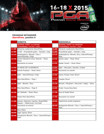 PROGRAM WYDARZEŃ Stars4Fans, pawilon 6 SOBOTA NIEDZIELA Rozkład JAZDY na sobotę! Prowadzący: Karolek / neqs Rozkład JAZDY na niedzielę! Prowadzący: Karolek / neqs 11.00 Otwarcie wydarzenia Stars4Fans 11.00 Otwarcie wydarzenia Stars4Fans 12.00 12:00 – Przywitanie gości – Karolek / neqs 12.00 Przywitanie gości – Karolek / neqs 12:15 Ambasadorzy: Blowek / Stuu / IsamuXPompa / Rojo 12:15 Ambasadorzy: Blowek, Stuu, IsamuXPompa, Rojo 12:45 Jeremi Sikorski & Artur Sikorski – Music Show 12:45 Sylwia Lipka – Music Show 13:15 Wyzwanie na scenie 12:55 Radek Tarach – Music Show 13:30 DJ REMO SET & BOMBSITE 13:05 Q&A – Naruciak / Karolek / Dubiel 14:00 Sylwia Przybysz – Music Show 13:25 Wyzwania na scenie! 14:30 Q&A - IsamuXPompa / Rojo 14:00 Isamu Pompa Team Show! 15:00 Miss Stars4Fans – Etap I 14:40 Cosplay Show! 15:30 Q&A - Blowek / Stuu 15:20 Blowek / Merghani / Naruciak / Vojtaz - Show 16:00 Miss Stars4Fans – Etap II 16:00 Finały Young Sing Stars 16:20 MC Sobieski – Music Show 17:20 Stuu & Dubiel Show 16:40 Finały Miss Stars4Fans 17:40 Wyzwanie na scenie! 17:00 Adryan, Dziarnoś, Cyprian, iSuperMWK, Requer – Młoda krew YouTube! 18:00 Tajemniczy punkt programu 17:30 Wyzwania na scenie! 18:40 Pożegnanie Blowek / Stuu / IsamuXPompa / Rojo 17:45 Stuu Show 18:00 Ajgor Ignacy Show 18:40 Pożegnanie Blowek / Stuu / IsamuXPompa / Rojo PROGRAM strefy zdjęć i autografów Stars4Fans, pawilon 6 WAŻNE! Sam bilet na targi PGA nie upoważnia do wejścia na halę YouTuberów. Bilety na wydarzenie Stars4Fans są także biletami na całe targi PGA.
