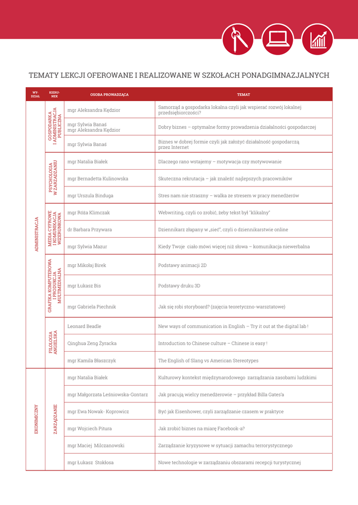 TEMATY LEKCJI OFEROWANE I REALIZOWANE W SZKOŁACH PONADGIMNAZJALNYCH GOSPODARKA I ADMINISTRACJA PUBLICZNA Samorząd a gospodarka lokalna czyli jak wspierać rozwój lokalnej przedsiębiorczości? mgr Sylwia Banaś mgr Aleksandra Kędzior Dobry biznes – optymalne formy prowadzenia działalności gospodarczej mgr Sylwia Banaś Biznes w dobrej formie czyli jak założyć działalność gospodarczą przez Internet PSYCHOLOGIA W ZARZADZANIU Temat mgr Aleksandra Kędzior mgr Natalia Białek Dlaczego rano wstajemy – motywacja czy motywowanie mgr Bernadetta Kulinowska Skuteczna rekrutacja – jak znaleźć najlepszych pracowników mgr Urszula Binduga Stres nam nie straszny – walka ze stresem w pracy menedżerów mgr Róża Klimczak Webwriting, czyli co zrobić, żeby tekst był "klikalny" dr Barbara Przywara Dziennikarz złapany w „sieć”, czyli o dziennikarstwie online mgr Sylwia Mazur Kiedy Twoje ciało mówi więcej niż słowa – komunikacja niewerbalna mgr Mikołaj Birek Podstawy animacji 2D mgr Łukasz Bis Podstawy druku 3D mgr Gabriela Piechnik Jak się robi storyboard? (zajęcia teoretyczno-warsztatowe) Leonard Beadle New ways of communication in English – Try it out at the digital lab ! Qinghua Zeng Żyracka Introduction to Chinese culture – Chinese is easy ! mgr Kamila Błaszczyk The English of Slang vs American Stereotypes mgr Natalia Białek Kulturowy kontekst międzynarodowego zarządzania zasobami ludzkimi mgr Małgorzata Leśniowska-Gontarz Jak pracują wielcy menedżerowie – przykład Billa Gates’a mgr Ewa Nowak- Koprowicz Być jak Eisenhower, czyli zarządzanie czasem w praktyce mgr Wojciech Pitura Jak zrobić biznes na miarę Facebook-a? mgr Maciej Milczanowski Zarządzanie kryzysowe w sytuacji zamachu terrorystycznego mgr Łukasz Stokłosa Nowe technologie w zarządzaniu obszarami recepcji turystycznej FILOLOGIA ANGIELSKA ZARZĄDZANIE EKONIMICZNY OSOBA PROWADZĄCA MEDIA CYFROWE I KOMUNIKACJA WIZERUNKOWA KIERUNEK GRAFIKA KOMPUTEROWA I PRODUKCJA MULTIMEDIALNA Administracja WYDZIAŁ TEMATY LEKCJI OFEROWANE I REALIZOWANE W SZKOŁACH PONADGIMNAZJALNYCH WYDZIAŁ KIERUNEK OSOBA PROWADZĄCA EKONIMICZNY LOGISTYKA dr Grzegorz Wróbel Temat FlexSim – poznaj oprogramowanie i rozpocznij proces produkcyjny Zbieraj, segreguj i usuwaj – Ekologistyka w praktyce mgr Kateryna Lysenko Temat na zamówienie Ścieżki Anglojęzyczne INFORMATYKA KOSMETOLOGIA MEDYCZNY DIETETYKA FIZJOTERAPIA INFORMATYKI STOSOWANEJ AVIATION MANAGEMENT Toyota – ucz się zarządzania logistycznego od najlepszych mgr Michał Nędza Ciekawostki lotnicze, czyli czego na pewno nie wiecie o lataniu Praca menedżera linii lotniczej – z jakimi wyzwaniami i problemami muszą się zmierzyć w dzisiejszym świecie linie lotnicze studenci Aviation Management Club Linie lotnicze cargo – jak organizowany jest transport samolotem drogą powietrzną dr inż. Janusz Kolbusz mgr inż. Jacek Jamiński dr inż. Janusz Korniak Konfiguracja i zarządzanie sieciami komputerowymi oraz ich bezpieczeństwem mgr Paweł Cudek dr inż. Paweł Różycki Programowanie serwisów internetowych i urządzeń mobilnych dr Marek Jaszuk dr inż. Leszek Puzio Tworzenie gier z wykorzystaniem silników gier komputerowych mgr Weronika Cyganik Skuteczny trening – jak wyrzeźbić swoje ciało mgr Marzena Mańdziuk Pokonaj stres – poznaj techniki relaksacji i masażu mgr Blanka Kaszuba Pierwsza pomoc po urazach dr Barbara Piekło mgr Urszula Binduga Czy wiesz co jesz? Chemiczne rozterki, czyli niebezpieczne dodatki do żywności mgr Urszula Binduga Tabletka cud – fakty i mity na temat suplementów diety dr Konrad Szychowski Aspiryna, paracetamol, alkohol i cukier – paradoks trucizn mgr Paweł Osika Detergenty, kosmetyki – przyszłość chemii praktycznej dr inż. Zofia Nizioł- Łukaszewska Substancje chemiczne jako aktywne składniki kosmetyków dr Aleksandra Filipowicz Czym pachnie chemia? Czyli wszystko o estrach mgr Sylwia Mazur Business etiquette for youth – how to start creating your professional image when you are a teen? When your body says more than words – about non-verbal communication Studenci WSIiZ How did I find myself in Poland? – meeting with UITM foreign students (Malaysia, Kazakhstan, Ukraine) Każda szkoła może zaproponować zagadnienie lub temat, który jest dla niej interesujący.