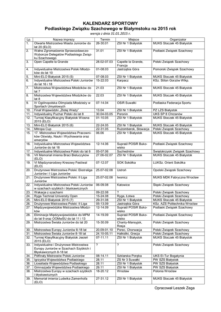 KALENDARZ SPORTOWY Podlaskiego Związku Szachowego w Białymstoku na 2015 rok wersja z dnia 31.01.2015 r. Lp. 1. 2. 3. 4. 5. 6. 7. 8. 9. 10. 11. 12. 13. 14. 15. 16. 17. 18. 19. 20. 21. 22. 23. 24. 25. 26. 27. 28. 29. 30. 31. 32. 33. 34. 35. 36. 37. 38. 39. Nazwa imprezy Otwarte Mistrzostwa Miasta Juniorów do lat 20 (ELO) Walne Zgromadzenie SprawozdawczoWyborcze Delegatów Podlaskiego Związku Szachowego Open Capelle la Grande Termin 26-30.01 Miejsce ZSI Nr 1 Białystok Organizator MUKS Stoczek 45 Białystok 31.01 ZSI Nr 1 Białystok Podlaski Związek Szachowy 28.02-07.03 Polski Związek Szachowy Indywidualne Mistrzostwa Polski Młodzików do lat 10 Mini-ELO Białystok 2015 (5) Indywidualne Mistrzostwa Polski Juniorów do lat 16 i 18 Mistrzostwa Województwa Młodzików do lat 7 Mistrzostwa Województwa Młodzików do lat 8 IV Ogólnopolska Olimpiada Młodzieży w Sportach Umysłowych Finał Wojewódzki „Złotej Wieży” Indywidualny Puchar Polski do lat 8 Turniej Klasyfikacyjny Białystok Wiosna 2015 (ELO) Mini-ELO Białystok 2015 (6) Mitropa Cup 17. Mistrzostwa Województwa Pracowników Oświaty, Nauki i Wychowania oraz emerytów Indywidualne Mistrzostwa Województwa Juniorów do lat 18 Indywidualne Mistrzostwa Polski do lat 6 VII Memoriał imienia Braci Bieluczyków (ELO) VI Międzynarodowy Kresowy Festiwal (ELO) Drużynowe Mistrzostwa Polski: Ekstraliga Juniorów i I Liga Juniorów Drużynowe Mistrzostwa Polski: II Liga Juniorów Indywidualne Mistrzostwa Polski Juniorów w szachach szybkich i błyskawicznych Wakacje z szachami Ryga Technial University Open Mini-ELO Białystok 2015 (7) Drużynowe Mistrzostwa Polski: II Liga Międzywojewódzkie Mistrzostwa Młodzików Eliminacje Międzywojewódzkie do MPM do lat 9 oraz OOMwSU do lat 11 i 13 Mistrzostwa Świata Juniorów do lat 20 01-08.03 Capelle la Grande, Francja Jastrzębia Góra 07-08.03 15-22.03 ZSI Nr 1 Białystok Karpacz MUKS Stoczek 45 Białystok KSz. Stilon Gorzów W lkp. 21.03 ZSI Nr 1 Białystok MUKS Stoczek 45 Białystok 22.03 ZSI Nr 1 Białystok MUKS Stoczek 45 Białystok 07-14.04 OSiR Suwałki Podlaska Federacja Sportu 13.04 30.04-03.05 01-10.05 ZSI Nr 1 Białystok Poronin ZSI Nr 1 Białystok PZ LZS Białystok UKS SP 8 Chrzanów MUKS Stoczek 45 Białystok 22-24.05 22-31.05 06.06 ZSI Nr 1 Białystok Rużomberok, Słowacja ZSI Nr 1 Białystok MUKS Stoczek 45 Białystok Polski Związek Szachowy MUKS Stoczek 45 Białystok 12-14.06 Podlaski Związek Szachowy 05-07.06 27.06-02.07 Supraśl POSiR Bukowisko Suchedniów ZSI Nr 1 Białystok 07-12.07 SOK Sokółka LUKSz. Orient Sokółka 25.07-02.08 Ustroń Opolski Związek Szachowy 25.07-02.08 Iwonicz MUKS MDK Fabryczna Wrocław 06-09.08 Katowice Śląski Związek Szachowy 09-22.08 15-24.08 29-31.08 05-13.09 12-14.09 Polski Związek Szachowy Polski Związek Szachowy MUKS Stoczek 45 Białystok KSz. AZS Politechnika Wrocław Podlaski Związek Szachowy Mistrzostwa Europy Juniorów 8-18 lat Mistrzostwa Świata Juniorów 8-18 lat Turniej Klasyfikacyjny Białystok Jesień 2015 (ELO) Indywidualne i Drużynowe Mistrzostwa Europy Juniorów w Szachach Szybkich i Błyskawicznych 8-18 lat Półfinały Mistrzostw Polski Juniorów Igrzyska Województwa Podlaskiego Licealiada Województwa Podlaskiego Gimnazjada Województwa Podlaskiego Mistrzostwa Europy w szachach szybkich i błyskawicznych Memoriał imienia Ludwika Zamenhofa (ELO) 20.09-01.10 24.10-05.11 07-11.11 ? Ryga, Łotwa ZSI Nr 1 Białystok Jastrzębia Góra Supraśl POSiR Bukowisko Supraśl POSiR Bukowisko Chanty-Mansyjsk, Rosja Porec, Chorwacja Halkidiki, Grecja ZSI Nr 1 Białystok ? ? Polski Związek Szachowy 08-14.11 28.11 28.11 29.11 18-20.12 Szklarska Poręba ZS Nr 3 Suwałki ZSI Nr 1 Białystok ZSI Nr 1 Białystok Wrocław UKS El-Tur Bogatynia PW SZS Białystok PW SZS Białystok PW SZS Białystok Polonia Wrocław 27-31.12 ZSI Nr 1 Białystok MUKS Stoczek 45 Białystok 14-19.09 15-30.09 Pomorski Związek Szachowy Świętokrzyski Związek Szachowy MUKS Stoczek 45 Białystok Podlaski Związek Szachowy Polski Związek Szachowy Polski Związek Szachowy Polski Związek Szachowy MUKS Stoczek 45 Białystok Opracował Leszek Zega