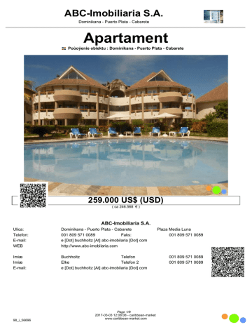 ABC-Imobiliaria S.A. Dominikana - Puerto Plata - Cabarete Apartament Poùoýenie obiektu : Dominikana - Puerto Plata - Cabarete 259.000 US$ (USD) ( ca 246.568 € ) ABC-Imobiliaria S.A. Ulica: Telefon: E-mail: WEB Dominikana - Puerto Plata - Cabarete 001 809 571 0089 Faks: e [Dot] buchholtz [At] abc-imobilaria [Dot] com http://www.abc-imobilaria.com Plaza Media Luna 001 809 571 0089 Imiæ Imiæ E-mail: Buchholtz Telefon Elke Telefon 2 e [Dot] buchholtz [At] abc-imobilaria [Dot] com 001 809 571 0089 001 809 571 0089 98_i_56696 Page 1/9 2017-03-03 12:08:08 - caribbean-market www.caribbean-market.com ABC-Imobiliaria S.A. Dominikana - Puerto Plata - Cabarete Numer kodu Typ budynku Poùoýenie Materiaùy Property Address Powierzchnia dziaùki Firma Ýycie Kuchnia Sypialnie Zùy Opinie Toaleta Dojazd: 30 Protokoùy 98_i_56696 Apartament Seafront Beton 1 1 3 3 Samochód Numer kodu Nr referencyjny Status objektet Rok po uzgodnieniu Nowy Powierzchnia 215 m2 Biznes Inne Usùugi Garaý Carport zadaszony taras 1 Lotnisko Akcesoria Dzierýawa Taras Balkon Jetty Pokój Party Klimatyzacja Resort Ogród Pralnia Goràcy zadaszony taras ogrodzony / murem 98_i_56696 Page 2/9 2017-03-03 12:08:08 - caribbean-market www.caribbean-market.com ABC-Imobiliaria S.A. Dominikana - Puerto Plata - Cabarete 98_i_56696 Page 3/9 2017-03-03 12:08:08 - caribbean-market www.caribbean-market.com ABC-Imobiliaria S.A. Dominikana - Puerto Plata - Cabarete 98_i_56696 Page 4/9 2017-03-03 12:08:08 - caribbean-market www.caribbean-market.com ABC-Imobiliaria S.A. Dominikana - Puerto Plata - Cabarete 98_i_56696 Page 5/9 2017-03-03 12:08:08 - caribbean-market www.caribbean-market.com ABC-Imobiliaria S.A. Dominikana - Puerto Plata - Cabarete 98_i_56696 Page 6/9 2017-03-03 12:08:08 - caribbean-market www.caribbean-market.com ABC-Imobiliaria S.A. Dominikana - Puerto Plata - Cabarete 98_i_56696 Page 7/9 2017-03-03 12:08:08 - caribbean-market www.caribbean-market.com ABC-Imobiliaria S.A. Dominikana - Puerto Plata - Cabarete 98_i_56696 Page 8/9 2017-03-03 12:08:08 - caribbean-market www.caribbean-market.com ABC-Imobiliaria S.A. Dominikana - Puerto Plata - Cabarete 98_i_56696 Page 9/9 2017-03-03 12:08:08 - caribbean-market www.caribbean-market.com