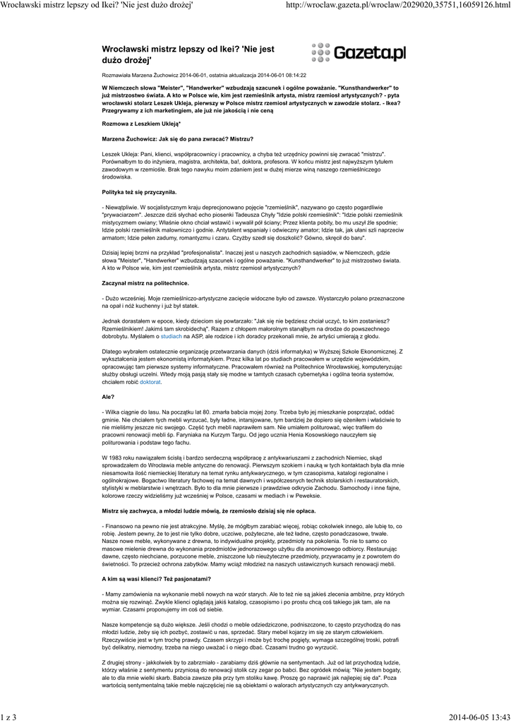 Wrocławski mistrz lepszy od Ikei? 'Nie jest dużo drożej' http://wroclaw.gazeta.pl/wroclaw/2029020,35751,16059126.html Wrocławski mistrz lepszy od Ikei? 'Nie jest dużo drożej' Rozmawiała Marzena Żuchowicz 2014-06-01, ostatnia aktualizacja 2014-06-01 08:14:22 W Niemczech słowa "Meister", "Handwerker" wzbudzają szacunek i ogólne poważanie. "Kunsthandwerker" to już mistrzostwo świata. A kto w Polsce wie, kim jest rzemieślnik artysta, mistrz rzemiosł artystycznych? - pyta wrocławski stolarz Leszek Ukleja, pierwszy w Polsce mistrz rzemiosł artystycznych w zawodzie stolarz. - Ikea? Przegrywamy z ich marketingiem, ale już nie jakością i nie ceną Rozmowa z Leszkiem Ukleją* Marzena Żuchowicz: Jak się do pana zwracać? Mistrzu? Leszek Ukleja: Pani, klienci, współpracownicy i pracownicy, a chyba też urzędnicy powinni się zwracać "mistrzu". Porównałbym to do inżyniera, magistra, architekta, ba!, doktora, profesora. W końcu mistrz jest najwyższym tytułem zawodowym w rzemiośle. Brak tego nawyku moim zdaniem jest w dużej mierze winą naszego rzemieślniczego środowiska. Polityka też się przyczyniła. - Niewątpliwie. W socjalistycznym kraju deprecjonowano pojęcie "rzemieślnik", nazywano go często pogardliwie "prywaciarzem". Jeszcze dziś słychać echo piosenki Tadeusza Chyły "Idzie polski rzemieślnik": "Idzie polski rzemieślnik mistycyzmem owiany; Właśnie okno chciał wstawić i wywalił pół ściany; Przez klienta pobity, bo mu uszył źle spodnie; Idzie polski rzemieślnik malowniczo i godnie. Antytalent wspaniały i odwieczny amator; Idzie tak, jak ułani szli naprzeciw armatom; Idzie pełen zadumy, romantyzmu i czaru. Czyżby szedł się doszkolić? Gówno, skręcił do baru". Dzisiaj lepiej brzmi na przykład "profesjonalista". Inaczej jest u naszych zachodnich sąsiadów, w Niemczech, gdzie słowa "Meister", "Handwerker" wzbudzają szacunek i ogólne poważanie. "Kunsthandwerker" to już mistrzostwo świata. A kto w Polsce wie, kim jest rzemieślnik artysta, mistrz rzemiosł artystycznych? Zaczynał mistrz na politechnice. - Dużo wcześniej. Moje rzemieślniczo-artystyczne zacięcie widoczne było od zawsze. Wystarczyło polano przeznaczone na opał i nóż kuchenny i już był statek. Jednak dorastałem w epoce, kiedy dzieciom się powtarzało: "Jak się nie będziesz chciał uczyć, to kim zostaniesz? Rzemieślnikiem! Jakimś tam skrobidechą". Razem z chłopem małorolnym stanąłbym na drodze do powszechnego dobrobytu. Myślałem o studiach na ASP, ale rodzice i ich doradcy przekonali mnie, że artyści umierają z głodu. Dlatego wybrałem ostatecznie organizację przetwarzania danych (dziś informatyka) w Wyższej Szkole Ekonomicznej. Z wykształcenia jestem ekonomistą informatykiem. Przez kilka lat po studiach pracowałem w urzędzie wojewódzkim, opracowując tam pierwsze systemy informatyczne. Pracowałem również na Politechnice Wrocławskiej, komputeryzując służby obsługi uczelni. Wtedy moją pasją stały się modne w tamtych czasach cybernetyka i ogólna teoria systemów, chciałem robić doktorat. Ale? - Wilka ciągnie do lasu. Na początku lat 80. zmarła babcia mojej żony. Trzeba było jej mieszkanie posprzątać, oddać gminie. Nie chciałem tych mebli wyrzucać, były ładne, intarsjowane, tym bardziej że dopiero się ożeniłem i właściwie to nie mieliśmy jeszcze nic swojego. Część tych mebli naprawiłem sam. Nie umiałem politurować, więc trafiłem do pracowni renowacji mebli śp. Faryniaka na Kurzym Targu. Od jego ucznia Henia Kosowskiego nauczyłem się politurowania i podstaw tego fachu. W 1983 roku nawiązałem ścisłą i bardzo serdeczną współpracę z antykwariuszami z zachodnich Niemiec, skąd sprowadzałem do Wrocławia meble antyczne do renowacji. Pierwszym szokiem i nauką w tych kontaktach była dla mnie niesamowita ilość niemieckiej literatury na temat rynku antykwarycznego, w tym czasopisma, katalogi regionalne i ogólnokrajowe. Bogactwo literatury fachowej na temat dawnych i współczesnych technik stolarskich i restauratorskich, stylistyki w meblarstwie i wnętrzach. Było to dla mnie pierwsze i prawdziwe odkrycie Zachodu. Samochody i inne fajne, kolorowe rzeczy widzieliśmy już wcześniej w Polsce, czasami w mediach i w Peweksie. Mistrz się zachwyca, a młodzi ludzie mówią, że rzemiosło dzisiaj się nie opłaca. - Finansowo na pewno nie jest atrakcyjne. Myślę, że mógłbym zarabiać więcej, robiąc cokolwiek innego, ale lubię to, co robię. Jestem pewny, że to jest nie tylko dobre, uczciwe, pożyteczne, ale też ładne, często ponadczasowe, trwałe. Nasze nowe meble, wykonywane z drewna, to indywidualne projekty, przedmioty na pokolenia. To nie to samo co masowe mielenie drewna do wykonania przedmiotów jednorazowego użytku dla anonimowego odbiorcy. Restaurując dawne, często niechciane, porzucone meble, zniszczone lub nieużyteczne przedmioty, przywracamy je z powrotem do świetności. To przecież ochrona zabytków. Mamy wciąż młodzież na naszych ustawicznych kursach renowacji mebli. A kim są wasi klienci? Też pasjonatami? - Mamy zamówienia na wykonanie mebli nowych na wzór starych. Ale to też nie są jakieś zlecenia ambitne, przy których można się rozwinąć. Zwykle klienci oglądają jakiś katalog, czasopismo i po prostu chcą coś takiego jak tam, ale na wymiar. Czasami proponujemy im coś od siebie. Nasze kompetencje są dużo większe. Jeśli chodzi o meble odziedziczone, podniszczone, to często przychodzą do nas młodzi ludzie, żeby się ich pozbyć, zostawić u nas, sprzedać. Stary mebel kojarzy im się ze starym człowiekiem. Rzeczywiście jest w tym trochę prawdy. Czasem skrzypi i może być trochę pogięty, wymaga szczególnej troski, potrafi być delikatny, niemodny, trzeba na niego uważać i o niego dbać. Czasami trudno go wyrzucić. Z drugiej strony - jakkolwiek by to zabrzmiało - zarabiamy dziś głównie na sentymentach. Już od lat pr