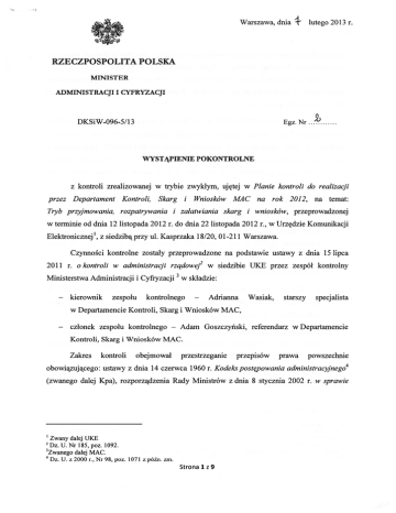 Warszawa, dnia lutego 2013 r. RZECZPOSPOLITA POLSKA MINISTER ADMINISTRACJI I CYFRYZACJI DKSiW-096-5/13 Egz. Nr . . . WYSTĄPIENIE POKONTROLNE z kontroli zrealizowanej w trybie zwykłym, ujętej w Planie kontroli do realizacji przez Departament Kontroli, Skarg i Wniosków MAC na rok 2012, na temat: Tryb przyjmowania, rozpatrywania i załatwiania skarg i wniosków, przeprowadzonej w terminie od dnia 12 listopada 2012 r. do dnia 22 listopada 2012 r., w Urzędzie Komunikacji Elektronicznej”, z siedzibą przy ul. Kasprzaka 18/20, 01-211 Warszawa. Czynności kontrolne zostały przeprowadzone na podstawie ustawy z dnia 15 lipca 2011 r. o kontroli w administracji rządowej 2 w siedzibie UKE przez zespół kontrolny Ministerstwa Administracji i Cyfryzacj i w składzie: — kierownik zespołu kontrolnego — Adrianna Wasiak, starszy specjalista w Departamencie Kontroli, Skarg i Wniosków MAC, — członek zespołu kontrolnego — Adam Goszczyński, referendarz w Departamencie Kontroli, Skarg i Wniosków MAC. Zakres kontroli obejmował przestrzeganie przepisów prawa powszechnie obowiązującego: ustawy z dnia 14 czerwca 1960 r. Kodeks postępowania administracyjnego 4 (zwanego dalej Kpa), rozporządzenia Rady Ministrów z dnia 8 stycznia 2002 r. w sprawie 1 Zwany dalej UKE Dz. U. Nr 185, poz. 1092. „Zwanego dalej MAC. Dz. U. z 2000 r., Nr 98, poz. 1071 z późn. zm. 2 Strona 1 z 9 organizacji przyjmowania i rozpatrywania skarg i wniosków 5 oraz aktów prawa o charakterze wewnętrznym tj. Procedury dotyczącej rozpatrywania skarg i interpelacji . 6 Celem kontroli była ocena działalności UKE w zakresie realizacji przyjmowania oraz rozpatrywania i załatwiania skarg i wniosków. Kontrolą objęto okres od dnia 1 stycznia 2011 r. do dnia 30 czerwca 2012 r. Z przekazanej do DKSiW MAC przez Dyrektora Generalnego Urzędu Komunikacji Elektronicznej Pana Mariusza Czyżaka informacji , dotyczącej liczby skarg i wniosków, 7 wynikało, że UKE rozpatruje skargi dotyczące funkcjonowania komórek organizacyjnych 8 oraz sposobu realizacji zadań przez pracowników. Ponadto z ww. informacji wynikało, że w okresie objętym kontrolą do UKE wpłynęło 40 skarg, natomiast w badanym okresie nie wpłynął żaden wniosek w rozumieniu art. 241 Kpa. Kontrola nt.: Tryb przyjmowania, rozpatrywania i załatwiania skarg i wniosków polegała na szczegółowym sprawdzeniu, czy w okresie objętym kontrolą: — przestrzegano terminów ustalonych dla załatwiania skarg (art. 237 I Kpa) oraz ich przekazania zgodnie z właściwością do organu właściwego do jej rozpatrzenia (art. 231 Kpa), — — przestrzegano terminów wynikających z przepisów regulacji wewnętrznych Urzędu, w przypadku braku możliwości załatwienia skargi w terminie, zawiadamiano skarżącego, zgodnie z art. 36 1 Kpa, o nowym terminie załatwienia sprawy (poprzez wskazanie dnia, miesiąca i roku), przy jednoczesnym wskazaniu przyczyn zwłoki, — dokumentacja dotycząca skarg i wniosków była rejestrowana i przechowywana zgodnie z art. 254 Kpa tzn. w sposób umożliwiający kontrolę przebiegu i terminów załatwiania poszczególnych skarg. Kontrola polegała ponadto na sprawdzeniu realizacji wszystkich zadań w zakresie przestrzegania przez UKE: Dz. U. Nr 5, poz. 46. 5 6 Procedura dolycqca rozpatmyania skarg i interpelacji w UKE, zatwierdzona przez Dyrektora Generalnego UKE w dniu 15 września 2010 r. Pismo z dnia 22 października 2012 r. nr BDG-WKW-091 1-3/12(2). 8 Komórki organizacyjne określone w 4 Regulaminu Organizacyjnego UKE stanowiącego załącznik do Zarządzenia nr 14 Prezesa UKE z dnia 16 lipca 2010 r. z późn. zm. Strona 2 z 9 — obowiązku informowania skarżącego o z art. 237 — sposobie załatwienia skargi zgodnie 3 Kpa oraz przestrzegania wymogów określonych w art. 238 1 Kpa, obowiązku informowania skarżącego o przekazaniu skargi zgodnie z właściwością na podstawie art. 231 Kpa, — obowiązku informowania skarżącego o przedłużeniu terminu załatwienia skargi, zgodnie z art. 36 — 1 Kpa, obowiązku sporządzenia w oparciu o art. 259 w związku z art. 258 1 ust. 1 Kpa oceny przyjmowania i załatwiania skarg i wniosków, — obowiązku zamieszczenia w siedzibie UKE w widocznym miejscu na tablicy ogłoszeń informacji o dniach i godzinach przyjęć interesantów w sprawach skarg i wniosków, zgodnie z wymaganiami określonymi w art. 253 4 Kpa oraz 3 rozporządzenia w sprawie organizacji, przyjmowania i rozpatrywania skarg i wniosków, — obowiązku prowadzenia w UKE rejestru przyjęć interesantów w sprawach skarg i wniosków. Ocena działalności UKE w zakresie objętym kontrolą została dokonana na podstawie kryteriów: legalności, celowości i rzetelności. Oceny realizacji przez UKE zadań w zakresie przyjmowania, rozpatrywania i załatwiania skarg dokonano na podstawie analizy stanu faktycznego i dokumentacji źródłowej oraz otrzymanych pisemnych i ustnych wyjaśnień. I. — Pozytywnie oceniono: dokonanie przez UKE oceny okresowej przyjmowania oraz załatwiania skarg i wniosków, — zamieszczenie w siedzibie UKE w widocznym miejscu na tablicy ogłoszeń informacji o dniach i godzinach przyjęć interesantów w sprawach skarg i , 9 wniosków oraz spełniającej wymogi określone w art. 253 4 Kpa 3 Rozporządzenia w sprawie organizacji, przyjmowania i rozpatrywania skarg i wniosków . 10 W dniu 21 listopada 2012 r. w siedzibie UKE zespól kontrolny dokonał oględzin, w wyniku których sporządził protokół. Rozporządzenie Rady Ministrów z dnia 8 stycznia 2002 r. w sprawie organizacji przyjmowania i rozpatrania skarg i wniosków (Dz. U. Nr 5, poz. 46). 10 Strona 3 z 9 II. Pozytywnie z uchybieniami oceniono przestrzeganie terminów załatwiania skarg. W wyniku kontroli stwierdzono, iż w 6 sprawach, w których nie było możliwości załatwienia skargi w ciągu miesiąca (art. 237 wynikającego z art. 237 — 4 Kpa w zw. z art. 36 nr BDG-WKW—0601-8/1 1 „ 1 Kpa) niedopełniono obowiąz