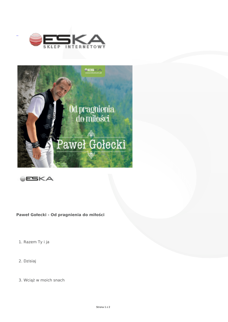 Paweł Gołecki - Od pragnienia do miłości 1. Razem Ty i ja 2. Dzisiaj 3. Wciąż w moich snach Strona 1 z 2 4. Zagrajmy, zaśpiewajmy 5. Zbój Janosik 6. Zostań, zostań tu 7. To nie ja 8. Od pragnienia do miłości 9. Bóg jeden wie 10. Biała suknia 11. Jesienne liście 12. Maju, Maju 13. Ty jedynie znasz Strona 2 z 2