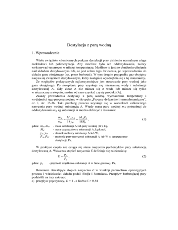 Destylacja z parą wodną 1. Wprowadzenie Wiele związków chemicznych podczas destylacji przy ciśnieniu normalnym ulega rozkładowi lub polimeryzacji. Aby możliwe było ich oddestylowanie, należy wykonywać ten proces w niższej temperaturze. Możliwe to jest po obniżeniu ciśnienia nad układem destylowanym lub, co jest celem tego ćwiczenia, po wprowadzeniu do układu gazu obojętnego (np. przez barbotaż). W tym drugim przypadku gaz obojętny nasyca się związkiem destylowanym, który następnie wyodrębnia się z tej mieszaniny. Ze względów praktycznych najkorzystniejsze jest stosowanie pary wodnej jako gazu obojętnego. Po skropleniu pary uzyskuje się mieszaninę wody i substancji destylowanej A. Gdy ciecz A nie miesza się z wodą lub miesza się tylko w nieznacznym stopniu, można od razu uzyskać czysty produkt (A). Zasady prowadzenia destylacji z parą wodną, wyznaczania temperatury i wydajności tego procesu podano w skrypcie „Procesy dyfuzyjne i termodynamiczne”, cz. I, str. 35-36. Taki przebieg procesu uzyskuje się w warunkach całkowitego nasycenia pary wodnej substancją A. Wtedy masa pary wodnej mW potrzebnej do oddestylowania mA kg substancji A można obliczyć z równania: m A M A y A M A PA = = , mW 18 yW 18 PW gdzie: mA, mW MA yA, yW PA, PW (1) - masa substancji A lub pary wodnej (W), kg, - masa cząsteczkowa substancji A, kg/kmol, - ułamek molowy substancji A lub W, - prężność pary nasyconej substancji A lub W w temperaturze destylacji, Pa. W praktyce często nie osiąga się stanu nasycenia pęcherzyków pary substancją destylowaną A. Wówczas stopień nasycenia E definiuje się zależnością: p E= A, (2) PA gdzie: pA - prężność cząstkowa substancji A w fazie gazowej, Pa, Równanie określające stopień nasycenia E w wunkcji parametrów operacyjnych procesu i właściwości układu podali Sirdje i Romakow. Przepływ barbotującej pary podzielili na trzy zakresy: a) przepływ pojedynczy, E = 1 , a liczba C > 0,84 C = Fr − 0,12 A nf 0, 28 D h −0, 48 M A PA 18PW −0,13 , (3) gdzie: Fr = w2/gD - liczba Frouda, - prędkość wypływu pary z dyszy bełkotki, m/s, w g - przyspieszenie ziemskie, m/s2, D - średnia aparatu, m, A - pole powierzchni przekroju aparatu, m2, f - pole powierzchni przekroju dyszy, m2, n - liczba dysz, h - wysokość słupa cieczy nad bełkotką, m. b) przepływ pianowy 0,84 > C > 0,735 A E = 1,17 Fr 0 ,12 nf 0 ,28 D h −0 ,48 M A PA 18 PW −0 ,13 M A PA 18 PW −0 ,48 (4) c) przepływ strumieniowy C < 0,735 E = 5,52 Fr − 0 ,48 A nf 1 ,0 D h −2 ,3 (5) 2. Cel ćwiczenia Celem ćwiczenia jest zapoznanie się ze sposobem wykonywania destylacji różniczkowej (kotłowej) z parą wodną oraz wyznaczenie stopnia nasycenia pary wodnej substancją destylowaną A przy różnych prędkościach wypływu pary wodnej z dyszy bełkotki. 3. Aparatura Schemat aparatury do badania procesu destylacji z parą wodną pokazano na rys. 1. Do ogrzewanej elektrycznie wytwornicy pary w sposób ciągły dopływa woda poprzez regulator poziomu wody (2). Napięcie na grzałkach wytwornicy pary regulowane jest autotransformatorem A2. Para wodna z wytwornicy przepływa przez bełkotkę (6) do wyparki (kolby destylacyjnej) (3) zawierającej substancję destylowaną. Aby utrzymać właściwą temperaturę w wyparce, tzn. aby para wodna nie uległa w niej skropleniu, należy ją ogrzewać. Napięcie na grzałce wyparki regulowane jest autotransformatorem A1. Pary z wyparki przepływają poprzez nasadkę (4) do chłodnicy (5). Uzyskany destylat zbierany jest w odbieralniku destylatu (7). Podczas pomiarów temperatura mierzona jest termometrami: T1 - wody wrzącej w wytwornicy pary, T2 - cieczy w wyparce, T3 - pary opuszczającej wyparkę. Rys. 1 Schemat aparatury doświadczalnej. 4. Metodyka pomiarów Po zapoznaniu się z aparaturą należy: a. Ustawić odpowiednie położenie bełkotki (wysokość między bełkotką a lustrem cieczy). b. Doprowadzić wodę do wytwornicy pary, strumień wody wypływający z regulatora poziomu wody powinien wynosić, około 6 dm3/h. c. Doprowadzić wodę do chłodnicy. d. Podgrzać ciecz w wyparce do temperatury 100°C. e. Włączyć wytwornicę pary, po uzyskaniu temperatury wody (T1) równej 95°C ustalić, za pomocą autotransformatora A2, napięcie na grzałkach wytwornicy wg wskazań prowadzącego ćwiczenia. f. Po ustaleniu się temperatur (na termometrach T2 i T3) cieczy i pary odebrać 100 cm3 dwufazowego destylatu. Zanotować objętość odebranej wody i substancji destylowanej. g. Ustawić inne napięcie na grzałkach wytwornicy pary i wykonać następne pomiary wg punktów e, f. h. Podczas pomiarów należy tak regulować ogrzewanie wyparki (autotransformatorem A1), aby w wyparce istniała tylko jedna faza ciekła. i. Po zakończeniu ćwiczeń: - wyłączyć ogrzewanie wytwornicy pary, - wyłączyć ogrzewanie wyparki, - zamknąć dopływ wody do chłodnicy i wytwornicy pary. 5. Opracowanie wyników pomiarów Należy wyznaczyć zależność stopnia nasycenia E od szybkości przepływu pary wodnej. 1. Obliczenie wartości doświadczalnej stopnia nasycenia E: p E= A, PA przy czym PA należy odczytać z tablic lub obliczyć z równania Antoine’a dla znanej temperatury destylacji, natomiast pA obliczyć z zależności: p A = Py A = P gdzie: P mA, mW MA 18m A , M AmW + 18m A - ciśnienie zewnętrzne, Pa, - masa substancji A lub wody w destylacie, kg, - masa cząsteczkowa substancji A kg/kmol. 2. Wartość stopnia nasycenia E należy obliczyć także z równań (3) i (4), przy czym liczbę Frouda Fr należy obliczyć dla temperatury i ciśnienia panujących w kolbie destylacyjnej (t, P) w= mW , τ ⋅ ρ pW gdzie: τ - czas, w którym w destylacie odebrano masę wody mW, s, - gęstość pary wodnej w kolbie destylacyjnej kg/m3. ρpW 3. Wyniki doświadczeń i obliczeń zestawić w tabelach: Tabela 1. Wyniki doświadczeń P = ........ hPa, Nr pomiaru T1 K T2 K T3 h τ Destylat K m mW g Fr A nf D h mA g M A 