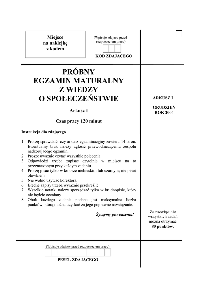 Miejsce na naklejkę z kodem (Wpisuje zdający przed rozpoczęciem pracy) KOD ZDAJĄCEGO PRÓBNY EGZAMIN MATURALNY Z WIEDZY O SPOŁECZEŃSTWIE ARKUSZ I GRUDZIEŃ ROK 2004 Arkusz I Czas pracy 120 minut Instrukcja dla zdającego 1. Proszę sprawdzić, czy arkusz egzaminacyjny zawiera 14 stron. Ewentualny brak należy zgłosić przewodniczącemu zespołu nadzorującego egzamin. 2. Proszę uważnie czytać wszystkie polecenia. 3. Odpowiedzi trzeba zapisać czytelnie w miejscu na to przeznaczonym przy każdym zadaniu. 4. Proszę pisać tylko w kolorze niebieskim lub czarnym; nie pisać ołówkiem. 5. Nie wolno używać korektora. 6. Błędne zapisy trzeba wyraźnie przekreślić. 7. Wszelkie notatki należy sporządzać tylko w brudnopisie, który nie będzie oceniany. 8. Obok każdego zadania podana jest maksymalna liczba punktów, którą można uzyskać za jego poprawne rozwiązanie. Życzymy powodzenia! (Wpisuje zdający przed rozpoczęciem pracy) PESEL ZDAJĄCEGO Za rozwiązanie wszystkich zadań można otrzymać 80 punktów. Próbny egzamin maturalny z wiedzy o społeczeństwie Arkusz egzaminacyjny I W zadaniach 1-6 zakreśl jedną właściwą odpowiedź. Zadanie 1. (1 pkt) Konferencja założycielska ONZ w 1945 r. odbyła się w a) Nowym Jorku. b) Genewie. c) San Francisco. d) Waszyngtonie. Zadanie 2. (1 pkt) Podaj, ilu stałych członków zasiada w Radzie Bezpieczeństwa ONZ. a) 9 b) 6 c) 5 d) 4 Zadanie 3. (1 pkt) Najwyższa Izba Kontroli podlega a) Sejmowi. b) Senatowi. c) Prezydentowi. d) Pierwszemu Prezesowi Sądu Najwyższego. Zadanie 4. (1 pkt) Członkami Trybunału Stanu są a) Sędziowie powołani przez Pierwszego Prezesa Sądu Najwyższego. b) Osoby powołane w równej części przez Sejm i Senat. c) Osoby powołane w równej części przez Sejm, Senat i Prezydenta. d) Osoby powołane przez Sejm spoza posłów i senatorów. Zadanie 5. (1 pkt) Prezesa Najwyższej Izby Kontroli powołuje na okres 6 lat a) Pierwszy Prezes Sądu Najwyższego. b) Prezydent za zgodą Sejmu. c) Sejm za zgodą Senatu. d) Senat za zgodą Sejmu. Zadanie 6. (1 pkt) Prezesa Narodowego Funduszu Zdrowia powołuje a) Minister Zdrowia. b) Prezydent na wniosek Prezesa Rady Ministrów. c) Prezes Rady Ministrów na wniosek Ministra Zdrowia. d) Prezes Rady Ministrów za zgodą Sejmu. Strona 2 z 14 Próbny egzamin maturalny z wiedzy o społeczeństwie Arkusz egzaminacyjny I Zaznacz, które zdania są prawdziwe, a które fałszywe, wpisując poniżej P (zdanie prawdziwe) lub F (zdanie fałszywe). Zadanie 7. (2 pkt) NATO a) Dokument o powstaniu NATO został podpisany 4.04.1949 r. w Waszyngtonie. b) Islandia, członek NATO, nie posiada regularnej armii. c) Na mocy układów paryskich do NATO przyjęto RFN w roku 1955. d) Od początku istnienia NATO, Kwatera Główna znajduje się w Londynie. e) Sekretarz Generalny NATO jest podległy w sprawach wojskowych Sekretarzowi Generalnemu ONZ. f) Nenri Spaak nigdy nie był Sekretarzem Generalnym NATO. a) – ...... b) – ...... c) – ...... d) – ...... e) – ...... f) – ...... Zadanie 8. (2 pkt) Polska po 1989 r. a) Przyrost naturalny w największych miastach Polski jest dodatni tylko dzięki migracji. b) Przez ostatnie 10 lat nie wzrosło zainteresowanie społeczeństwa hasłami partii populistycznych. c) Z dniem 1 maja 2004 r. Polacy mają nieograniczony dostęp do rynków pracy w Unii. d) Wraz ze wzrostem liczby afer wśród polityków spada zainteresowanie Polaków życiem politycznym. e) Polska jako pierwsza spośród 10 państw Europy Środkowo-Wschodniej złożyła wniosek o członkostwo w Unii Europejskiej. f) Pierwszym premierem po wyborach kontraktowych został Tadeusz Mazowiecki. a) – ...... b) – ...... c) – ...... d) – ...... e) – ...... f) – ...... Zadanie 9. (2 pkt) Polska w latach osiemdziesiątych. a) NSZZ Solidarność liczyła w apogeum swego rozkwitu 10 mln członków. b) Lech Wałęsa został laureatem Pokojowej Nagrody Nobla w 1983 roku. c) Za inicjatora obrad „Okrągłego Stołu” uważany jest Lech Wałęsa. d) Za symbol ustaleń związanych z „Okrągłym Stołem” uważana jest Magdalenka. e) Końcowe dokumenty obrad „Okrągłego Stołu” podpisano w kwietniu 1989 roku. f) Hasło tzw. „grubej kreski” dotyczyło rządów Waldemara Pawlaka. a) – ...... b) – ...... c) – ...... d) – ...... Strona 3 z 14 e) – ...... f) – ...... Próbny egzamin maturalny z wiedzy o społeczeństwie Arkusz egzaminacyjny I Przyporządkuj literom (a, b, c, d) odpowiednie cyfry (1, 2, 3, 4, 5). Zadanie 10. (2 pkt) Przyporządkuj wymienione zadania podanym instytucjom ONZ. a) FAO b) WTO c) IMF d) ILO 1) Stymuluje działania zmierzające do poprawy warunków pracy pracowników na całym świecie i tworzenia systemów zabezpieczeń społecznych. 2) Zajmuje się rozwojem techniki i organizacji międzynarodowego transportu lotniczego w aspekcie bezpieczeństwa, nawigacji, meteorologii, łączności, procedur, kontroli ruchu i zagadnień prawnych. 3) Do jej zadań należy przede wszystkim: popieranie międzynarodowej współpracy walutowej oraz uporządkowanych stosunków walutowych (...) udzielanie pomocy w likwidacji trudności płatniczych, wpływanie na zachowanie pożądanego stopnia płynności międzynarodowych systemów płatniczych (...). 4) Jej głównym zadaniem jest liberalizacja międzynarodowego handlu dobrami i usługami, obniżanie ceł i taryf, przestrzegania praw własności intelektualnej, prowadzenie wspierającej handel polityki inwestycyjnej, rozstrzyganie sporów dotyczących wymiany handlowej. 5) Zajmuje się m.in. koordynacją walki z głodem na świecie. a) – ...... b) – ...... c) – ...... d) – ...... Zadanie 11. (2 pkt) Przyporządkuj odpowiednie biogramy do imion i nazwisk twórców nowożytnych idei. a) Michaił Bakunin b) Claude Henri de Saint-Simon c) Fryderyk Engels d) Aleksander Hercen 1) Francuski filozof, historyk, myśliciel społeczny; jeden z głównych przedstawicieli socjalizmu utopijnego. 2) W