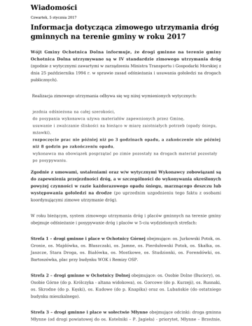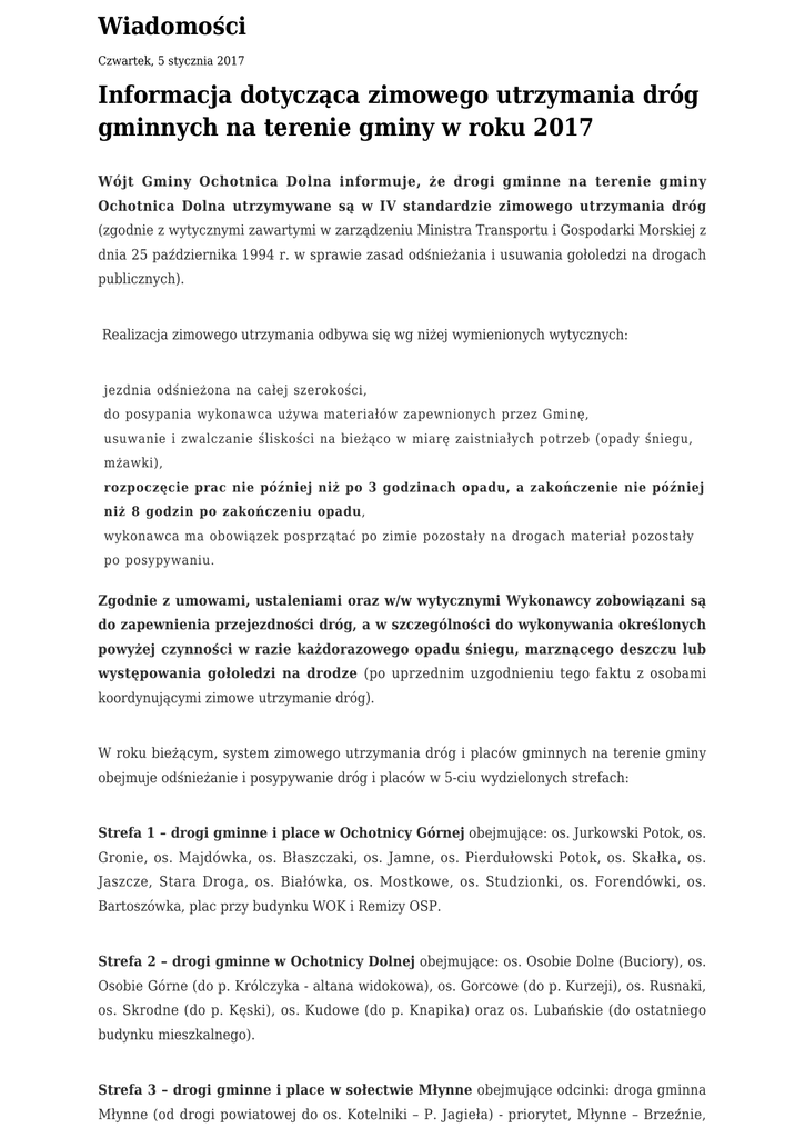 Wiadomości Czwartek, 5 stycznia 2017 Informacja dotycząca zimowego utrzymania dróg gminnych na terenie gminy w roku 2017 Wójt Gminy Ochotnica Dolna informuje, że drogi gminne na terenie gminy Ochotnica Dolna utrzymywane są w IV standardzie zimowego utrzymania dróg (zgodnie z wytycznymi zawartymi w zarządzeniu Ministra Transportu i Gospodarki Morskiej z dnia 25 października 1994 r. w sprawie zasad odśnieżania i usuwania gołoledzi na drogach publicznych). Realizacja zimowego utrzymania odbywa się wg niżej wymienionych wytycznych: jezdnia odśnieżona na całej szerokości, do posypania wykonawca używa materiałów zapewnionych przez Gminę, usuwanie i zwalczanie śliskości na bieżąco w miarę zaistniałych potrzeb (opady śniegu, mżawki), rozpoczęcie prac nie później niż po 3 godzinach opadu, a zakończenie nie później niż 8 godzin po zakończeniu opadu, wykonawca ma obowiązek posprzątać po zimie pozostały na drogach materiał pozostały po posypywaniu. Zgodnie z umowami, ustaleniami oraz w/w wytycznymi Wykonawcy zobowiązani są do zapewnienia przejezdności dróg, a w szczególności do wykonywania określonych powyżej czynności w razie każdorazowego opadu śniegu, marznącego deszczu lub występowania gołoledzi na drodze (po uprzednim uzgodnieniu tego faktu z osobami koordynującymi zimowe utrzymanie dróg). W roku bieżącym, system zimowego utrzymania dróg i placów gminnych na terenie gminy obejmuje odśnieżanie i posypywanie dróg i placów w 5-ciu wydzielonych strefach: Strefa 1 – drogi gminne i place w Ochotnicy Górnej obejmujące: os. Jurkowski Potok, os. Gronie, os. Majdówka, os. Błaszczaki, os. Jamne, os. Pierdułowski Potok, os. Skałka, os. Jaszcze, Stara Droga, os. Białówka, os. Mostkowe, os. Studzionki, os. Forendówki, os. Bartoszówka, plac przy budynku WOK i Remizy OSP. Strefa 2 – drogi gminne w Ochotnicy Dolnej obejmujące: os. Osobie Dolne (Buciory), os. Osobie Górne (do p. Królczyka - altana widokowa), os. Gorcowe (do p. Kurzeji), os. Rusnaki, os. Skrodne (do p. Kęski), os. Kudowe (do p. Knapika) oraz os. Lubańskie (do ostatniego budynku mieszkalnego). Strefa 3 – drogi gminne i place w sołectwie Młynne obejmujące odcinki: droga gminna Młynne (od drogi powiatowej do os. Kotelniki – P. Jagieła) - priorytet, Młynne – Brzeźnie, Młynne – Golce, Młynne – Szlagówka, Młynne – Chrobaki, Wierch – Młynne, Młynne Folwark, Młynne - Bystry Gronik. Strefa 4 – drogi gminne i place w sołectwie Tylmanowa obejmujące os.: os.: Kozuby, Grzebaki, Marciakówka, Kaletówka, Wybrańce, Górzany, Łapiakówka, Kliniec, Zabliszcze, Brzegi, Łęg Górny, Kłodne, Obłaz Górny, Kąt, Buciorówka, Lachówka, Płaśnie, Kotelnica, Księżaki, Bliszcze, Stachówka, Ligasy, Gąszcze, Ziemianki, Miazgi, Padół, Potok, Mostki, Chlebki, Michałki, Brodki, Glinik, Kozielce, Zagonie, Górki, Gabrysie, Obłaz Wyżny, Makowica, Połanki, Hardopadły, Piszczki, Talafusy, Zabaście oraz: mosty na rzece Dunajec (k. remizy OSP i na Brzegach), miejsca postojowe w os. Kłodne (miejsce zawracania autobusu szkolnego), miejsca postojowe w os. Michałki (przy drodze woj.), miejsce postojowe w os. Kozielce (pod Ośrodkiem Zdrowia). Strefa 5 - drogi i place gminne w soł. Ochotnica Dolna (pozostała część) i Tylmanowa (pozostała część). Ochotnica Dolna: os. Ligasy, Janczurowski Potok, Folwark, Rola, Pitki, Kołodzieje, Tarchały, Dutkówka, place przy kościele, plac przy urzędzie gminy, plac przy WOK-u i remizie, chodniki przy drodze powiatowej oraz pozostałe drogi gminne w miarę potrzeb. Tylmanowa: os. Cyrhla, os. Rzeka, most na Dunajcu (u ujścia Ochotnicy), droga do oczyszczalni, "Zawodzie" (do mostu na rz. Dunajec przy remizie OSP) oraz pozostałe drogi gminne w miarę potrzeb. Zgodnie z zawartymi umowami oraz uzgodnieniami, odpowiedzialnymi za zimowe utrzymanie dróg gminnych w roku 2017 są: Strefa 1 – drogi gminne i place w Ochotnicy Górnej PHU Wład-Trans Czajka Władysław, 34-453 Ochotnica Górna, Czuby 90 Strefa 2 – drogi gminne w Ochotnicy Dolnej (część) Usługi Sprzętowe Paweł Franasowicz, 34-451 Tylmanowa, os. Króle 17B Strefa 3 – drogi gminne i place w sołectwie Młynne Usługi Transportowe i Handel Krzyśko Stanisław, 34-452 Ochotnica Dolna os. Młynne 105 A Strefa 4 – drogi gminne i place w sołectwie Tylmanowa (część) Usługi Transportowe, Zrywka Drewna, Usługi Koparko - Ładowarką Jan Ciesielka, 34-451 Tylmanowa, os. Stachówka 228 Strefa 5 - drogi i place gminne w sołectwach: Ochotnica Dolna (część) i Tylmanowa (część). Zakład Gospodarki Komunalnej w Ochotnicy Dolnej W przypadku gwałtownych ataków zimy oraz innych sytuacjach trudnych do przewidzenia w momencie zawierania umów dopuszcza się możliwość wykonywania zimowego utrzymania dróg i placów przez Wykonawców na pozostałych obiektach na terenie gminy po uprzednich ustaleniach. Koordynatorami działań są sołtysi poszczególnych sołectw, tj: 1. Ochotnica Górna - P. Wiesław Maciąga, tel. 505-747-619 2. Ochotnica Dolna - P. Wojciech Chlipała, tel. 692-766-029 3. Młynne - P. Krzysztof Jagieła, tel. 608-019-365 4. Tylmanowa - P. Stanisław Michałczak, tel. 501-847-457