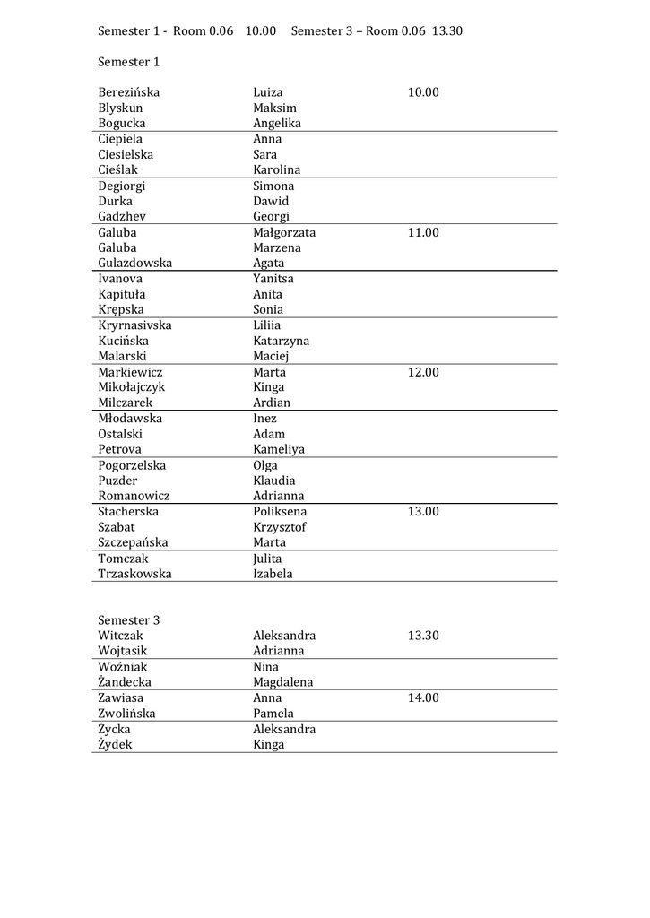 Semester1-Room0.0610.00Semester3–Room0.0613.30 Semester1 Berezińska Luiza 10.00 Blyskun Maksim Bogucka Angelika Ciepiela Anna Ciesielska Sara Cieślak Karolina Degiorgi Simona Durka Dawid Gadzhev Georgi Galuba Małgorzata 11.00 Galuba Marzena Gulazdowska Agata Ivanova Yanitsa Kapituła Anita Krępska Sonia Kryrnasivska Liliia Kucińska Katarzyna Malarski Maciej Markiewicz Marta 12.00 Mikołajczyk Kinga Milczarek Ardian Młodawska Inez Ostalski Adam Petrova Kameliya Pogorzelska Olga Puzder Klaudia Romanowicz Adrianna Stacherska Poliksena 13.00 Szabat Krzysztof Szczepańska Marta Tomczak Julita Trzaskowska Izabela Semester3 Witczak Aleksandra 13.30 Wojtasik Adrianna Woźniak Nina Żandecka Magdalena Zawiasa Anna 14.00 Zwolińska Pamela Życka Aleksandra Żydek Kinga Semester2-Room0.33, Brudnicka Budzyńska Ciałek Ciesielski Durajska Furman Glinkowska Gumienna Chlebowski Iwanowa Janiec Jędraszczyk Joldibayeva Julia Kacprzak Kędzierska Kłąb Klama Komisarczyk Kot Krawczyk Kwiecień Marciniak Marczak Mikołajczyk Nakhipova Nieckarz Niełaczna Olejniczak Palian Piechal Pichlak Rębowska Rejczak Rudnicki Rusin Scęcelek Sęk Sietkassymkyzy Stelmaszczyk Świca Szrejner Uryszek 9.00 Wiktoria Łucja Ewelina Oskar Zofia Marta Klaudia Aleksandra Bartłomiej Anastazja Ilona Filip Aray Naum Weronika Monika Paulina Patrycja Agnieszka Klaudia Sylwia Kamila Patrycja Aleksandra Agnieszka Aygerim Izabela Magdalena Jan Karolina Joanna Aleksandra Patrycja Karolina Ernest Monika Mateusz Aleksandra Makpal Paulina Wiktor Kamila Mateusz 9.00 10.00 11.00 13 14.00 15.00 Semester3-Room0.42, Vladyslav Wiśniewska Adler Alejandro Augustyniak Ayazbayeva Becalik Begovski Bondaruk Ciesielski Cruz Dębska Durańska Dziubałtowska Fałek Rębietkowska Florczak Gaś Gawlik Głuchowska Górska Goździk Goździk Graczyk Graczyk Grandon Gruszka Halamus Chryniewiecka Ilska Janik Januszkiewicz Jasiak Jębierczyk Kacperczyk Kaniewski Kapita Kim Kostrzewski Kostrzewski 9.00 Gilyuk Roksana Karolina Cristina Angelika Aigerim Julia Stefan Aleksandra Daniel Estefania Katarzyna Marta Lidia Klaudia Zuzanna Patryk Adrianna Marcin Justyna Hanna Aleksandra Zuzanna Aleksandra Agnieszka Anna Izabella Justyna Anna Magdalena Aleksandra Artur Kamila Marta Michał Robert Amanda Valeriya Adrian Michał 9.00 10.00 11.00 13.00 14.00 15.00 Semester3-Room2.39, Kozik Krajewska Kruk Lauks Łaziński Lernaciński Lesiak Matczak Matusiak Mazur Mencel Michowska Mirzakhmetova Misiak Mruk Nikaghosyan Nowak Ormanov Anna Aleksandra Paulina Robert Bartosz Jakub Amanda Sara Julia Alexandra Agnieszka Joanna Mukaddas Krystian Marta Liana Izabela Abzal Osiński Pęciak Perek Podsiadły Poghosgan Przywuska Saidakhmatov Socha Sokolova Spryszynska Sushenitsa Syguła Szpruch Szubka Szymańska Szymczak Utebayeva Walczewska Walendziak Wiktorowska Patryk Sylwia Aleksandra Alicja Diana Michalina Nursultan Kinga Kira Aleksandra Tamara Martyna Fabian Magdalena Paulina Maciej Diana Malwina Aleksandra Karolina 9.00 9.00 10.00 11.00 13.00 14.00 15.00 Semester4-Room2.53,9.00Semester6-Room2.53, 11.30 Baranowska Roksana 9.00 Bojanowska Klaudia Budzyński Piotr DeLano Alejandro Głowacka Pola Gwardys Marta Jakubek Małgorzata 10.00 Jakubowska Zauzanna Janowski Adam Kubiak Alicja Kurilov Aleksandr Litvishko Kseniya Mencel Agnieszka 11.00 Paradowski Michał Rymkiewicz Krzysztof Syrvatka Viktor Szulc Julita Semester6-Room2.53, 11.30 Dolinta Victoria 11.30 Gromadzik Aleksandra Gugała Nicole Patrycja Jerzak Karolina 13.00 Kaja Szymon Kanigowska Sandra Kubiak Marta Łęcka Joanna Łosicki Przemysław Masica Monika 14.00 Pietura Katarzyna Scyman Kaja Śniegula Adrian Szymczak Michał Urbańska Marta Wiktorowicz Magdalena 15.00 Wiśniewska Katarzyna Wojtaszek Agnieszka Zaborowska Aleksandra Semester5-Room2.55, Bąk Białkowska Fertlińska Bogdan Brzeziński Bugai Cabaj Dąbrowski Friedenberger Gach Goliński Halamus Hyller Chołoniewska Jurewicz Kaźmierczak Kotynia Krawentek Kręcisz Kwiatkowski Leśnik Maślej Moldir Osińska Pacała Palla Pawlak Plachimowicz Sangalli Skopek Stępień Sukhanovskaia Sztubecka Teodorczyk Trzciński Tybura Walczak Wiśniewska Wiśniewski 9.00 Emilian Nikolina Zuzanna Justyna Marcin Diana Majka Jacek Cezar Wiktor Sylwester Irmina Agnieszka Agata Jakub Daniel Aneta Małgorzata Patryk Dawid Miłosz Dagmara Malshy Dominika Ewa Marti Mateusz Dagmara Silvia Tobiasz Ewelina Aleksandra Agnieszka Adam Jan Krzysztof Dominika Anna Adrian 9.00 10.00 11.00 13.00 14.00 15.00