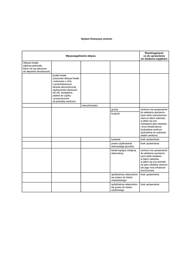 System finansowy centrum Rozstrzygnięcie co do uprawnienia do władania majątkiem Wyszczególnienie aktywu Aktywa trwałe (aktywa jednostki, które nie są zaliczane do aktywów obrotowych) środki trwałe (rzeczowe aktywa trwałe i zrównane z nimi, o przewidywanym okresie ekonomicznej użyteczności dłuższym niż rok, kompletne, zdatne do użytku i przeznaczone na potrzeby centrum) nieruchomości grunty budynki centrum ma uprawnienie do władania wymienionymi obok nieruchomościami,w takim zakresie, w jakim są one niezbędne jako siedziba i inna infrastruktura budowlana centrum (potrzebna do realizacji zadań centrum) budowle brak uprawnienia prawo użytkowania wieczystego gruntów brak uprawnienia lokale będące odrębną własnością centrum ma uprawnienie do władania wymienionymi obok lokalami w takim zakresie, w jakim są one potrzebne jako siedziba centrum lub jego inna infrastruktura biurowa spółdzielcze własnościo- brak uprawnienia we prawo do lokalu mieszkalnego spółdzielcze własnościowe prawo do lokalu użytkowego brak uprawnienia maszyny, urządzenia, środki transportu centrum ma uprawnienie do władania maszynami, urządzeniami i środkami transportu – wyłącznie w takim zakresie, w jakim podyktowane to jest potrzebami, wynikającymi z realizacji zadań centrum inne rzeczy nie będące obrotowymi aktywami rzeczowymi centrum ma uprawnienie do władania innymi rzeczami, będącymi aktywami trwałymi – wyłącznie w takim zakresie, w jakim podyktowane to jest potrzebami, wynikającymi z realizacji zadań centrum ulepszenia w obcych środkach trwałych centrum ma uprawnienie do władania nakładami w obcych środkach trwałych, jeśli podyktowane to jest potrzebami kształtowania infrastruktury biurowej centrum inwentarz żywy brak uprawnienia centrum ma uprawnienie do władania środkami trwałymi w budowie, jeśli ich wytwarzanie jest podyktowane uzasadnionymi potrzebami centrum środki trwałe w budowie (środki trwałe w okresie ich budowy, montażu lub ulepszenia już istniejącego środka trwałego) wartości niematerialne i prawne (nabyte przez centrum prawa majątkowe, nadające się do gospodarczego wykorzystania, o przewidywanym okresie ekonomicznej użyteczności dłuższym niż rok, przeznaczone do używania na potrzeby centrum) autorskie prawa majątkowe, prawa pokrewne, licencje, koncesje prawa do wynalazków, patentów, znaków towarowych, wzorów użytkowych oraz zdobniczych centrum ma uprawnienie do władania wymienionymi obok wartościami niematerialnymi i prawnymi, jeśli są one potrzebne do realizacji zadań centrum know-how koszty zakończonych prac rozwojowych inne wartości niematerialne i prawne nabyta wartość firmy brak uprawnienia długoterminowe aktywa finansowe (aktywa finansowe, płatne i wymagalne lub przeznaczone do zbycia w ciągu okresu przekraczającego 12 miesięcy od dnia bilansowego lub od daty ich założenia, wystawienia lub nabycia) instrumenty kapitałowe wyemitowane przez inne jednostki brak uprawnień wynikające z kontraktu prawo do otrzymania aktywów pieniężnych brak uprawnień wynikające z kontraktu prawo do wymiany instrumentów finansowych z inną jednostką na korzystnych warunkach brak uprawnień należności długoterminowe brak uprawnień rozliczenia międzyokresowe trwające dłużej niż 12 miesięcy od dnia bilansowego wyłącznie dla celów odroczonego podatku dochodowego od osób prawnych oraz rozliczania wyposażenia mającego charakter środków trwałych inwestycje długoterminowe (aktywa trwałe, nabyte przez centrum nie w celu ich użytkowania, lecz osiągnięcia korzyści ekonomicznych, wynikających z przyrostu wartości tych aktywów, uzyskania z nich przychodów w formie odsetek, dywidend (udziałów w zyskach) lub innych pożytków, w tym również z transakcji handlowej) aktywa finansowe jako inwestycje długoterminowe instrumenty kapitałowe wyemitowane przez inne jednostki brak uprawnień wynikające z kontraktu prawo do otrzymania aktywów pieniężnych brak uprawnień wynikające z kontraktu prawo do wymiany instrumentów finansowych z inną jednostką na korzystnych warunkach brak uprawnień nieruchomości jako inwestycje długoterminowe brak uprawnień wartości niematerialne i prawne jako inwestycje długoterminowe brak uprawnień lokaty zakładów ubezpieczeń brak uprawnień inne inwestycje długoterminowe brak uprawnień materiały nabyte w celu zużycia na własne potrzeby centrum ma uprawnienie do władania materiałami potrzebnymi do realizacji jego zadań wytworzone lub przetworzone przez centrum produkty gotowe (wyroby i usługi) zdatne do sprzedaży centrum ma uprawnienia do władania produktami w postaci usług, o których mowa w § 3, ust. 2 i 3 niniejszej decyzji wytworzone lub przetworzone przez centrum produkty gotowe (wyroby i usługi) w toku produkcji brak uprawnień Aktywa obrotowe obrotowe aktywa rzeczowe (aktywa rzeczowe przeznaczone do zbycia lub zużycia w ciągu 12 miesięcy od dnia bilansowego lub w ciągu normalnego cyklu operacyjnego właściwego dla danej działalności, jeżeli trwa on dłużej niż 12 miesięcy) półprodukty brak uprawnień towary nabyte w celu odprzedaży w stanie nieprzetworzonym brak uprawnień obrotowe aktywa finansowe (aktywa pieniężne albo inne aktywa finansowe, płatne i wymagalne lub przeznaczone do zbycia w ciągu 12 miesięcy od dnia bilansowego, albo daty ich założenia, wystawienia lub nabycia) aktywa pieniężne krajowe środki płatnicze centrum ma uprawnienie do władania krajowymi środkami płatniczymi, jakie na rachunku centrum – zgodnie z planem kont centrum – pojawiają się w toku realizacji jego zadań waluty obce i dewizy jeśli wymagać tego będzie wypełnienie zadań centrum inne aktywa finansowe (w szczególności odsetki od aktywów finansowych); uwaga: jeżeli aktywa te są płatne lub wymagalne w ciągu 3 miesięcy od dnia ich otrzymania, wystawienia, nabycia lub założenia (lokaty), to na potr