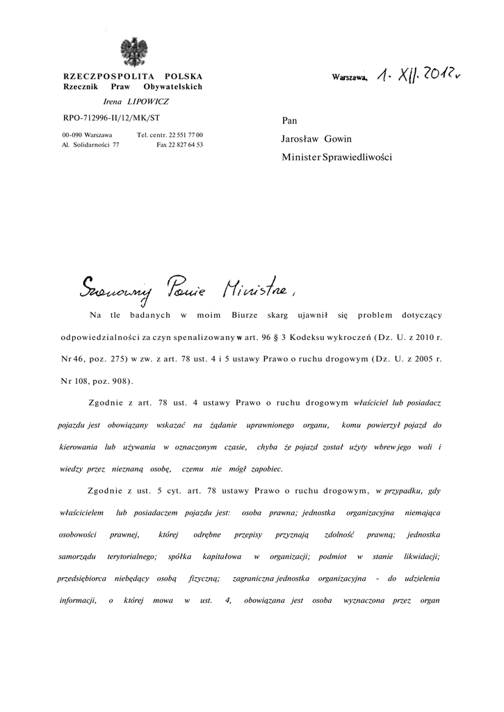 R Z E C Z P O S P O L I T A POLSKA Rzecznik Praw Obywatelskich Irena LIPOWICZ RPO-712996-II/12/MK/ST Pan 00-090 Warszawa Jarosław Gowin Tel. centr. 22 551 77 00 Al. Solidarności 77 Fax 22 827 64 53 Minister Sprawiedliwości Na tle badanych w moim Biurze skarg ujawnił się problem dotyczący odpowiedzialności za czyn spenalizowany w art. 96 § 3 Kodeksu wykroczeń ( D z . U. z 2010 r. Nr 46, poz. 275) w zw. z art. 78 ust. 4 i 5 ustawy Prawo o ruchu drogowym (Dz. U. z 2005 r. N r 108, poz. 908). Zgodnie z art. 78 ust. 4 ustawy Prawo o ruchu drogowym właściciel lub posiadacz pojazdu jest obowiązany wskazać kierowania lub używania na żądanie uprawnionego w oznaczonym czasie, wiedzy przez nieznaną osobę, organu, komu powierzył pojazd do chyba że pojazd został użyty wbrew jego woli i czemu nie mógł zapobiec. Z g o d n i e z ust. 5 cyt. art. 78 ustawy Prawo o ruchu drogowym, w przypadku, gdy właścicielem osobowości samorządu lub posiadaczem pojazdu jest: prawnej, terytorialnego; przedsiębiorca informacji, której niebędący o której odrębne spółka osobą mowa przepisy kapitałowa fizyczną; w osoba ust. w prawna; jednostka przyznają organizacji; zagraniczna jednostka 4, obowiązana jest organizacyjna zdolność podmiot w organizacyjna osoba niemająca prawną; jednostka stanie likwidacji; - wyznaczona do udzielenia przez organ 2 uprawniony do reprezentowania tego podmiotu na zewnątrz, a w przypadku niewyznaczenia takiej osoby - osoby wchodzące w skład tego organu zgodnie z żądaniem organu, o którym mowa w ust. 4, oraz sposobem reprezentacji podmiotu. Co istotne, niewykonanie obowiązków wynikających z treści komentowanego przepisu stanowi wykroczenie z art. 96 § 3 Kodeksu wykroczeń, zgodnie z którym podlega karze grzywny, ten, kto wbrew obowiązkowi nie wskaże na żądanie uprawnionego organu, komu powierzył pojazd do kierowania lub używania w oznaczonym czasie. Jak podkreśla się w doktrynie, przedmiotem ochrony z art. 96 § 3 k.w. jest bezpieczeństwo i porządek w ruchu drogowym. W celu przeciwdziałania zagrożeniom, jakie mogą spowodować wyżej wymienieni uczestnicy ruchu, przewidziana została karalność niewykonania obowiązku zapobiegania takim sytuacjom. Właściciel pojazdu wykona ten obowiązek, gdy wskaże osobę, której oddał pojazd do kierowania i wówczas obowiązek ten przechodzi na tę osobę. Zwolnienie z obowiązku następuje w razie wykazania, że użycie pojazdu nastąpiło bez zgody właściciela lub posiadacza pojazdu, np. w razie kradzieży lub samowolnego użycia pojazdu. Niewskazaniem jest udzielenie odpowiedzi negatywnej, na przykład że nie wskaże tej osoby lub nie wie, w czyjej dyspozycji w określonym czasie był pojazd, jak też zaniechanie udzielenia odpowiedzi. Znamię to jest zatem spełnione w razie bezczynności, tj. nieudzielenia w ogóle odpowiedzi właściwemu organowi. Takie zachowanie może mieć miejsce, gdy osoba, do której organ zwrócił się pisemnie, w ogóle na nie odpowiedziała. W zasadzie brak odpowiedzi na pisemne zapytanie może być traktowany jako niezrealizowanie omawianego obowiązku, ale tylko w sytuacji, gdy adresat osobiście odebrał pismo zawierające to żądanie. Prawo o ruchu drogowym mówi o wskazaniu, a wykroczeniem jest właśnie niewskazanie, które może być zrealizowane także w formie zaniechania (Ryszard A. Stefański, Komentarz do art. 96 Kodeksu wykroczeń, publ. LEX 2011 i cytowane tam stanowiska doktryny). Wykonaniem omawianego obowiązku będzie również wskazanie alternatywnie osoby, która mogła kierować pojazdem w oznaczonym czasie, co może mieć miejsce wówczas, gdy w tym 3 samym czasie mogła kierować samochodem jedna spośród kilku osób np. kilku domowników korzysta z pojazdu, a klucze do niego znajdują się w miejscu dostępnym dla nich wszystkich, czy kilku pracowników ma dostęp do samochodu służbowego (por. Ryszard A. Stefański, Komentarz do art. 96 Kodeksu wykroczeń, publ. LEX 2011). Wypełnienie obowiązku wynikającego z art. 78 ust. 4 i 5 ustawy Prawo o ruchu drogowym, napotyka jednak w polskim systemie prawnym na trudności, a czasami jest wręcz niemożliwe, czego egzemplifikacją są sprawy kierowane do mojego Biura, w których przedstawiony jest problem związany z wezwaniami poszczególnych służb - Policji, Straży Miejskiej i Gminnej oraz Inspekcji Transportu Drogowego kierowanymi do właścicieli lub posiadaczy pojazdów do wskazania kierującego pojazdem w związku z ujawnieniem wykroczenia drogowego polegającego na przekroczeniu prędkości zarejestrowanego przez urządzenie rejestrujące jakim jest fotoradar. W wezwaniach takich, organy pouczają, że niewskazanie kierującego pojazdem, który miał się dopuścić w/w wykroczenia pociągać będzie odpowiedzialność na zasadzie art. 78 ust. 4 i 5 ustawy Prawo o ruchu drogowym w zw. z art. 96 § 3 kw. Jednocześnie, co niezwykle istotne, w/w organy odmawiają udostępnienia wezwanemu zdjęcia z fotoradaru, powołując się na art. 38 Kodeksu postępowania w sprawach o wykroczenia, który to przepis, na skutek pominięcia w nim unormowania z art. 156 § 5 Kodeksu postępowania karnego, skutkuje tym, iż na etapie postępowania wyjaśniającego (tj. na etapie tzw. czynności wyjaśniających) stronom nie przysługuje nie tylko prawo wglądu do zarejestrowanego obrazu - w tym otrzymania zdjęcia z fotoradaru, ale również nie przysługuje prawo wglądu do akt. Prawo wglądu do akt strony nabywają dopiero na etapie postępowania sądowego. Odnosząc się do kwestii związanej z nie udostępnianiem przez odpowiednie organa wraz z wezwaniem do wskazania kierującego pojazdem - zarejestrowanego obrazu, na którym uwidoczniony jest pojazd wraz ze sprawcą wykroczenia, wskazać w tym miejscu należy, iż 4 przed dniem 16 września 2011 r. - zgodnie z § 7 ust. 6 rozporządzenia Prezesa Rady Ministrów w sprawie nakładania grzywien w drodze mandatu karnego z dnia 22 lutego 2002 