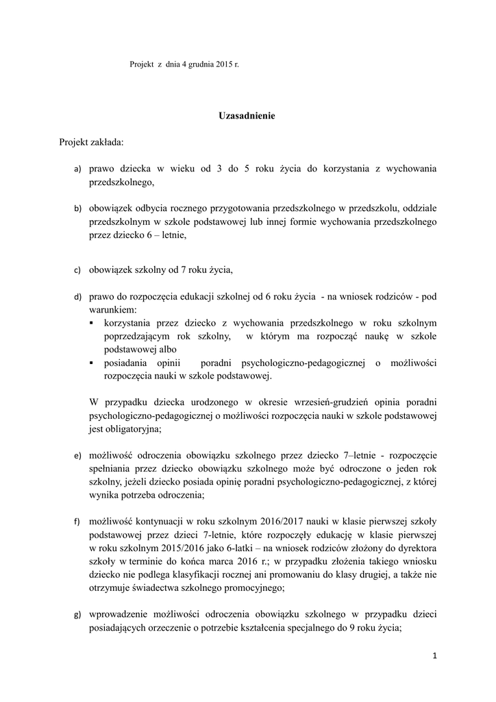 Projekt z dnia 4 grudnia 2015 r. Uzasadnienie Projekt zakłada: a) prawo dziecka w wieku od 3 do 5 roku życia do korzystania z wychowania przedszkolnego, b) obowiązek odbycia rocznego przygotowania przedszkolnego w przedszkolu, oddziale przedszkolnym w szkole podstawowej lub innej formie wychowania przedszkolnego przez dziecko 6 – letnie, c) obowiązek szkolny od 7 roku życia, d) prawo do rozpoczęcia edukacji szkolnej od 6 roku życia - na wniosek rodziców - pod warunkiem: korzystania przez dziecko z wychowania przedszkolnego w roku szkolnym poprzedzającym rok szkolny, w którym ma rozpocząć naukę w szkole podstawowej albo posiadania opinii poradni psychologiczno-pedagogicznej o możliwości rozpoczęcia nauki w szkole podstawowej. W przypadku dziecka urodzonego w okresie wrzesień-grudzień opinia poradni psychologiczno-pedagogicznej o możliwości rozpoczęcia nauki w szkole podstawowej jest obligatoryjna; e) możliwość odroczenia obowiązku szkolnego przez dziecko 7–letnie - rozpoczęcie spełniania przez dziecko obowiązku szkolnego może być odroczone o jeden rok szkolny, jeżeli dziecko posiada opinię poradni psychologiczno-pedagogicznej, z której wynika potrzeba odroczenia; f) możliwość kontynuacji w roku szkolnym 2016/2017 nauki w klasie pierwszej szkoły podstawowej przez dzieci 7-letnie, które rozpoczęły edukację w klasie pierwszej w roku szkolnym 2015/2016 jako 6-latki – na wniosek rodziców złożony do dyrektora szkoły w terminie do końca marca 2016 r.; w przypadku złożenia takiego wniosku dziecko nie podlega klasyfikacji rocznej ani promowaniu do klasy drugiej, a także nie otrzymuje świadectwa szkolnego promocyjnego; g) wprowadzenie możliwości odroczenia obowiązku szkolnego w przypadku dzieci posiadających orzeczenie o potrzebie kształcenia specjalnego do 9 roku życia; 1 h) przesunięcie terminu przekształcenia oddziałów przedszkolnych w szkołach podstawowych w przedszkola – z 1 września 2016 r. na 1września 2019 r. i) przesunięcie terminu wprowadzenia nowych przepisów dotyczących ramowych statutów publicznych: przedszkoli, szkół i placówek z 1 września 2016 r. na 1 września 2019 r. j) wzmocnienie roli kuratora oświaty w kształtowaniu sieci przedszkoli i planu sieci szkół. Przywrócenie obowiązku uzyskiwania pozytywnej opinii organu nadzoru pedagogicznego w przypadku likwidacji szkoły lub placówki prowadzonej przez jednostkę samorządu terytorialnego; k) przywrócenie obowiązku uzyskiwania pozytywnej opinii kuratora w przypadku udzielania przez jednostkę samorządu terytorialnego zezwolenia na założenie przez osobę fizyczną lub osobę prawną inną niż jednostka samorządu terytorialnego publicznej szkoły lub placówki; l) przywrócenie obowiązku opiniowania przez kuratora oświaty planów pracy publicznych placówek doskonalenia nauczycieli; m) powierzenie ministrowi właściwemu do spraw oświaty i wychowania kompetencji powoływania i odwoływania kuratorów i wicekuratorów oświaty. I. Obowiązek szkolny 7-latka Obniżenie wieku obowiązku szkolnego zostało wprowadzone wbrew woli większości rodziców. Dlatego projektowane zmiany w ustawie o systemie oświaty uwzględniają zdanie rodziców, którzy protestowali przeciwko obniżeniu wieku obowiązku szkolnego, podpisując się pod obywatelskimi projektami ustaw przywracających obowiązek szkolny od 7 roku życia w 2012 i 2015 r. oraz wnioskiem o referendum edukacyjne w 2013 r. Poselski projekt ustawy o zmianie ustawy o systemie oświaty oraz niektórych innych ustaw zakłada powrót do stanu prawnego, w którym obowiązkiem szkolnym były objęte dzieci od 7 roku życia. Art. 1 pkt 4 projektu ustawy (art. 15 ust. 2 ustawy o systemie oświaty) stanowi, że obowiązek szkolny rozpoczyna się z początkiem roku szkolnego w roku kalendarzowym, w którym dziecko kończy 7 lat, oraz trwa do ukończenia gimnazjum, nie dłużej jednak niż do ukończenia 18 roku życia. Prawem rodziców będzie natomiast – zgodnie z art. 1 pkt 5 lit. a projektowanej ustawy (art. 16 ust. 1 ustawy o systemie oświaty) - zapisanie do pierwszej klasy szkoły podstawowej dziecka, które w danym roku kalendarzowym kończy 6 lat. Dyrektor szkoły, na wniosek rodziców, będzie mógł przyjąć do szkoły dziecko 6-letnie urodzone w okresie 1 stycznia - 31 sierpnia, jeżeli dziecko spełnia jeden z poniższych warunków: korzystało z wychowania przedszkolnego w roku szkolnym poprzedzającym rok szkolny, w którym ma rozpocząć naukę w szkole podstawowej albo uzyskało opinię poradni psychologiczno – pedagogicznej o możliwości rozpoczęcia nauki w szkole podstawowej. W przypadku dziecka urodzonego w okresie od 1 września do 31 grudnia, oprócz wniosku rodziców zawsze konieczne będzie posiadanie przez dziecko opinii poradni psychologicznopedagogicznej o możliwości rozpoczęcia nauki w szkole podstawowej. Proponowane zmiany wychodzą naprzeciw oczekiwaniom i potrzebom rodziców dzieci 6 – letnich, którzy – protestując przeciwko obniżeniu wieku obowiązku szkolnego – zwracali uwagę na: emocjonalne problemy dziecka, nieprzygotowanie infrastruktury części szkół na przyjęcie 6-latków, nauczanie w oddziałach mieszanych złożonych z uczniów 6 – i 7 – letnich, oparcie dużej części pracy dydaktycznej z 6-latkami na pakietach edukacyjnych i podręcznikach, wymuszającej długotrwałe siedzenie przy stolikach, niedostosowanie opieki świetlicowej do potrzeb emocjonalnych młodszych dzieci. W projekcie wprowadzone zostały także przepisy przejściowe odnoszące się do roku szkolnego 2015/2016 oraz 2016/2017. Zgodnie z art. 7 projektowanej ustawy, dzieci urodzone w 2009 r., które są już w obowiązku szkolnym, w roku szkolnym 2015/2016, będą mogły – na wniosek rodziców – kontynuować naukę w pierwszej klasie szkoły podstawowej w roku szkolnym 2016/2017. W przypadku złożenia takiego wniosku przez rodziców do dyrektora szkoły (w termin