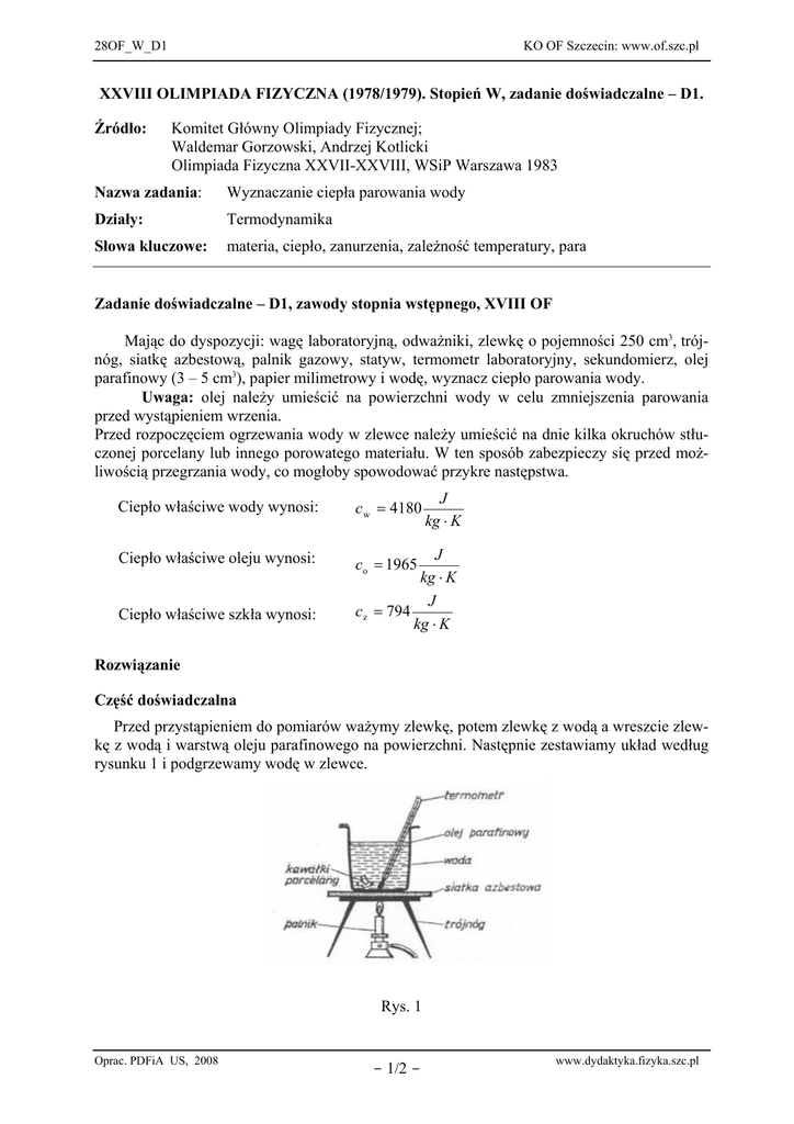 28OF_W_D1 KO OF Szczecin: www.of.szc.pl XXVIII OLIMPIADA FIZYCZNA (1978/1979). Stopień W, zadanie doświadczalne – D1. Źródło: Komitet Główny Olimpiady Fizycznej; Waldemar Gorzowski, Andrzej Kotlicki Olimpiada Fizyczna XXVII-XXVIII, WSiP Warszawa 1983 Nazwa zadania: Wyznaczanie ciepła parowania wody Działy: Termodynamika Słowa kluczowe: materia, ciepło, zanurzenia, zależność temperatury, para Zadanie doświadczalne – D1, zawody stopnia wstępnego, XVIII OF Mając do dyspozycji: wagę laboratoryjną, odważniki, zlewkę o pojemności 250 cm3, trójnóg, siatkę azbestową, palnik gazowy, statyw, termometr laboratoryjny, sekundomierz, olej parafinowy (3 – 5 cm3), papier milimetrowy i wodę, wyznacz ciepło parowania wody. Uwaga: olej należy umieścić na powierzchni wody w celu zmniejszenia parowania przed wystąpieniem wrzenia. Przed rozpoczęciem ogrzewania wody w zlewce należy umieścić na dnie kilka okruchów stłuczonej porcelany lub innego porowatego materiału. W ten sposób zabezpieczy się przed możliwością przegrzania wody, co mogłoby spowodować przykre następstwa. Ciepło właściwe wody wynosi: c w = 4180 Ciepło właściwe oleju wynosi: co = 1965 Ciepło właściwe szkła wynosi: J kg ⋅ K J kg ⋅ K J c z = 794 kg ⋅ K Rozwiązanie Część doświadczalna Przed przystąpieniem do pomiarów ważymy zlewkę, potem zlewkę z wodą a wreszcie zlewkę z wodą i warstwą oleju parafinowego na powierzchni. Następnie zestawiamy układ według rysunku 1 i podgrzewamy wodę w zlewce. Rys. 1 Oprac. PDFiA US, 2008 - 1/2 - www.dydaktyka.fizyka.szc.pl 28OF_W_D1 KO OF Szczecin: www.of.szc.pl Co minutę notujemy temperaturę. Do chwili wystąpienia wrzenia parowanie wody z powierzchni jest uniemożliwione przez warstwę oleju. Wobec tego ciepło dostarczone do układu wyraża się wzorem: ΔQ = (mz cz + mw cw + mo co)ΔT gdzie mz jest masą zlewki, cz – ciepłem właściwym zlewki, mw - masą wody, cw – ciepłem właściwym wody, mo – masą oleju a co– ciepłem właściwym oleju. Ilość ciepła dostarczana zlewce w jednostce czasu Δ t jest więc równa ΔT ΔQ = (m w c w + mz c z + mo co ) Δt Δt (1) Wielkość Δ T / Δ t można odczytać z wykresu zależności temperatury od czasu (rys.2) Rys. 2 Ponieważ będzie nas interesowała ilość ciepła dostarczona cieczy podczas wrzenia w jednostce czasu, więc wielkość Δ T / Δ t odczytujemy dla temperatur bliskich 1000C. Δ Q / Δ t możemy obliczyć ze wzoru (1). Notujemy czas wrzenia wody, a następnie po jej ostygnięciu ważymy ponownie zlewkę z wodą i olejem. Różnica Δ m masy układu przed rozpoczęciem ogrzewania i po jego zakończeniu daje nam masę wody, która wyparowała. (Po rozpoczęciu wrzenia warstwa oleju już nie chroni wody przed parowaniem). Ciepło parowania R będzie więc wyrażone równaniem: ⎛ ΔQ ⎞ ⎜⎜ ⎟⎟ Δt ⎝ Δ t ⎠1000 C R= Δm Oprac. PDFiA US, 2008 - 2/2 - www.dydaktyka.fizyka.szc.pl