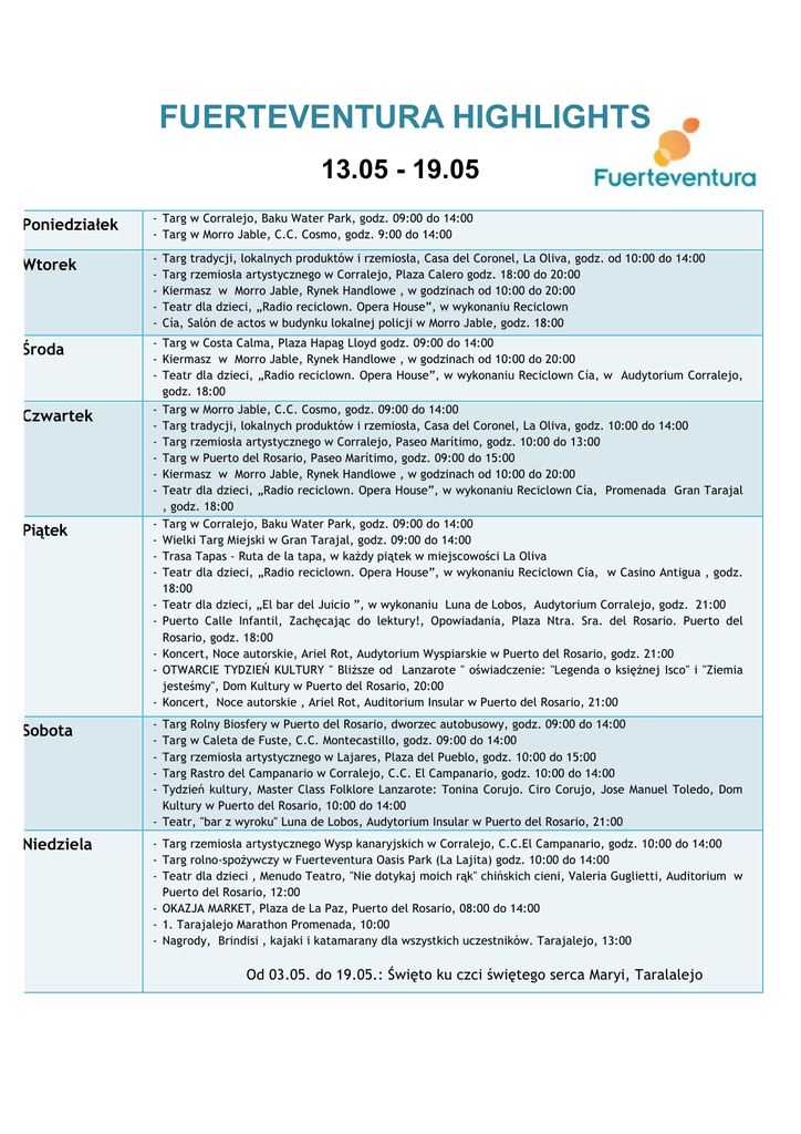 FUERTEVENTURA HIGHLIGHTS 13.05 - 19.05 Poniedziałek Wtorek Środa --- Czwartek - Piątek - Sobota Niedziela - Targ w Corralejo, Baku Water Park, godz. 09:00 do 14:00 Targ w Morro Jable, C.C. Cosmo, godz. 9:00 do 14:00 Targ tradycji, lokalnych produktów i rzemiosła, Casa del Coronel, La Oliva, godz. od 10:00 do 14:00 Targ rzemiosła artystycznego w Corralejo, Plaza Calero godz. 18:00 do 20:00 Kiermasz w Morro Jable, Rynek Handlowe , w godzinach od 10:00 do 20:00 Teatr dla dzieci, „Radio reciclown. Opera House”, w wykonaniu Reciclown Cía, Salón de actos w budynku lokalnej policji w Morro Jable, godz. 18:00 Targ w Costa Calma, Plaza Hapag Lloyd godz. 09:00 do 14:00 Kiermasz w Morro Jable, Rynek Handlowe , w godzinach od 10:00 do 20:00 Teatr dla dzieci, „Radio reciclown. Opera House”, w wykonaniu Reciclown Cía, w Audytorium Corralejo, godz. 18:00 Targ w Morro Jable, C.C. Cosmo, godz. 09:00 do 14:00 Targ tradycji, lokalnych produktów i rzemiosła, Casa del Coronel, La Oliva, godz. 10:00 do 14:00 Targ rzemiosła artystycznego w Corralejo, Paseo Marítimo, godz. 10:00 do 13:00 Targ w Puerto del Rosario, Paseo Marítimo, godz. 09:00 do 15:00 Kiermasz w Morro Jable, Rynek Handlowe , w godzinach od 10:00 do 20:00 Teatr dla dzieci, „Radio reciclown. Opera House”, w wykonaniu Reciclown Cía, Promenada Gran Tarajal , godz. 18:00 Targ w Corralejo, Baku Water Park, godz. 09:00 do 14:00 Wielki Targ Miejski w Gran Tarajal, godz. 09:00 do 14:00 Trasa Tapas - Ruta de la tapa, w każdy piątek w miejscowości La Oliva Teatr dla dzieci, „Radio reciclown. Opera House”, w wykonaniu Reciclown Cía, w Casino Antigua , godz. 18:00 Teatr dla dzieci, „El bar del Juicio ”, w wykonaniu Luna de Lobos, Audytorium Corralejo, godz. 21:00 Puerto Calle Infantil, Zachęcając do lektury!, Opowiadania, Plaza Ntra. Sra. del Rosario. Puerto del Rosario, godz. 18:00 Koncert, Noce autorskie, Ariel Rot, Audytorium Wyspiarskie w Puerto del Rosario, godz. 21:00 OTWARCIE TYDZIEŃ KULTURY " Bliższe od Lanzarote " oświadczenie: "Legenda o księżnej Isco" i "Ziemia jesteśmy", Dom Kultury w Puerto del Rosario, 20:00 Koncert, Noce autorskie , Ariel Rot, Auditorium Insular w Puerto del Rosario, 21:00 Targ Rolny Biosfery w Puerto del Rosario, dworzec autobusowy, godz. 09:00 do 14:00 Targ w Caleta de Fuste, C.C. Montecastillo, godz. 09:00 do 14:00 Targ rzemiosła artystycznego w Lajares, Plaza del Pueblo, godz. 10:00 do 15:00 Targ Rastro del Campanario w Corralejo, C.C. El Campanario, godz. 10:00 do 14:00 Tydzień kultury, Master Class Folklore Lanzarote: Tonina Corujo. Ciro Corujo, Jose Manuel Toledo, Dom Kultury w Puerto del Rosario, 10:00 do 14:00 - Teatr, "bar z wyroku" Luna de Lobos, Audytorium Insular w Puerto del Rosario, 21:00 - Targ rzemiosła artystycznego Wysp kanaryjskich w Corralejo, C.C.El Campanario, godz. 10:00 do 14:00 - Targ rolno-spożywczy w Fuerteventura Oasis Park (La Lajita) godz. 10:00 do 14:00 - Teatr dla dzieci , Menudo Teatro, "Nie dotykaj moich rąk" chińskich cieni, Valeria Guglietti, Auditorium w Puerto del Rosario, 12:00 - OKAZJA MARKET, Plaza de La Paz, Puerto del Rosario, 08:00 do 14:00 - 1. Tarajalejo Marathon Promenada, 10:00 - Nagrody, Brindisi , kajaki i katamarany dla wszystkich uczestników. Tarajalejo, 13:00 Od 03.05. do 19.05.: Święto ku czci świętego serca Maryi, Taralalejo