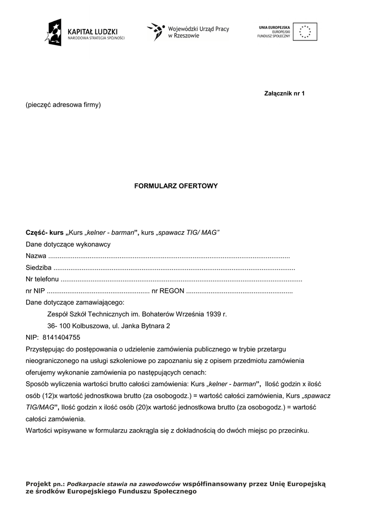 Załącznik nr 1 (pieczęć adresowa firmy) FORMULARZ OFERTOWY Część- kurs „Kurs „kelner - barman”, kurs „spawacz TIG/ MAG” Dane dotyczące wykonawcy Nazwa ................................................................................................................................. Siedziba ................................................................................................................................. Nr telefonu ................................................................................................................................. nr NIP ....................................................... nr REGON ......................................................... Dane dotyczące zamawiającego: Zespół Szkół Technicznych im. Bohaterów Września 1939 r. 36- 100 Kolbuszowa, ul. Janka Bytnara 2 NIP: 8141404755 Przystępując do postępowania o udzielenie zamówienia publicznego w trybie przetargu nieograniczonego na usługi szkoleniowe po zapoznaniu się z opisem przedmiotu zamówienia oferujemy wykonanie zamówienia po następujących cenach: Sposób wyliczenia wartości brutto całości zamówienia: Kurs „kelner - barman”, Ilość godzin x ilość osób (12)x wartość jednostkowa brutto (za osobogodz.) = wartość całości zamówienia, Kurs „spawacz TIG/MAG”, Ilość godzin x ilość osób (20)x wartość jednostkowa brutto (za osobogodz.) = wartość całości zamówienia. Wartości wpisywane w formularzu zaokrągla się z dokładnością do dwóch miejsc po przecinku. Projekt pn.: Podkarpacie stawia na zawodowców współfinansowany przez Unię Europejską ze środków Europejskiego Funduszu Społecznego Lp Przedmiot zamówienia Ilość Ilość Ilość Wartość kursów godzin w osób jednostkowa jednym na brutto kursie jednym (za osobogodz.) Wartość brutto całości zamówienia (4x5x6=7) kursie 1 Kurs „ kelner barman 2 Kurs „ spawacz 1 12 2 10 TIG/ MAG ” Uważam się za związanego niniejszą ofertą przez okres 30 dni od upływu terminu do składania ofert. Zastrzeżenie wykonawcy: Niżej wymienione dokumenty składające się na ofertę nie mogą być ogólnie udostępnione: ………………………………………………………………………………………………………………… ………………………………………………………………………………………………………………… ………………………………………………………………………… Inne informacje wykonawcy: ………………………………………………………………………………………………………………… ………………………………………………………………………………………………………………… ______________________________________ (imię i nazwisko) podpis uprawnionego przedstawiciela wykonawcy Projekt pn.: Podkarpacie stawia na zawodowców współfinansowany przez Unię Europejską ze środków Europejskiego Funduszu Społecznego Załącznik nr 2 (pieczęć adresowa firmy) OŚWIADCZENIE O SPEŁNIENIU WARUNKÓW UDZIAŁU W POSTĘPOWANIU O ZAMÓWIENIE PUBLICZNE Składając ofertę w postępowaniu o udzielenie zamówienia publicznego w Zespole Szkół Technicznych im. Bohaterów Września 1939 r. 36- 100 Kolbuszowa, ul. Janka Bytnara 2 .............................................................reprezentując ................................................................... (imię i nazwisko osoby upoważnionej) ( nazwa i adres wykonawcy) w imieniu reprezentowanej przeze mnie firmy oświadczam, że spełniam niżej wymienione warunki udziału w postępowaniu dotyczące: 1.Posiadania uprawnień do wykonywania określonej działalności lub czynności, jeśli przepisy prawa nakładają obowiązek ich posiadania, 2.Posiadania wiedzy i doświadczenia, 3.Dysponowania odpowiednim potencjałem technicznym oraz osobami zdolnymi do wykonania zamówienia, 4.Sytuacji ekonomicznej i finansowej, Ponadto oświadczam, że nie podlegam wykluczeniu z postępowania o zamówienie publiczne na podstawie art. 24 pkt 1 i 2 Prawa Zamówień Publicznych Na każde żądanie zamawiającego dostarczę niezwłocznie odpowiednie dokumenty potwierdzające prawdziwość każdej z kwestii zawartej w tym oświadczeniu. ......................................,dnia........................... ...................................................... (podpis osoby/osób upoważnionej) Projekt pn.: Podkarpacie stawia na zawodowców współfinansowany przez Unię Europejską ze środków Europejskiego Funduszu Społecznego Załącznik nr 3 Projekt Umowa na świadczenie usługi Kursów „ kelner - barman ” , „ spawacz TIG/ MAG ” nr ……………….. zawarta w dniu ………………r. pomiędzy: Zespół Szkół Technicznych im. Bohaterów Września 1939 r. z siedzibą: 36- 100 Kolbuszowa, ul. Janka Bytnara 2 reprezentowanym przez Dyrektora Zespołu : ……………………………… zwanym dalej Zamawiającym a………………………………………………………………………………………………………………..., podmiot uprawniony do prowadzenia kursu na mocy:……………………………………………... z siedzibą: ………………………………………………………………………………………………………………….. reprezentowanym przez……………………………………………………………………………………… Umowa zawarta została na podstawie zamówienia publicznego ………………….w związku z realizacją projektu ,, w ramach projektu WND-POKL.09.02.00-18-001/12 Podkarpacie stawia na zawodowców współfinansowanego ze środków Europejskiego Funduszu Społecznego . §1 1.Wykonawca zobowiązuje się do realizacji przedmiotu Umowy, którym jest: przeprowadzenie kursów określonych w pkt. III, specyfikacji do zamówienia publicznego nr …………… 