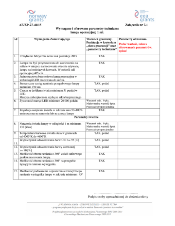AE/ZP-27-46/15 Załącznik nr 7.1 Wymagane i oferowane parametry techniczne lampy operacyjnej 1 szt. Lp Wymagania Zamawiającego Warunek graniczny. Parametry oferowane. Punktacja w kryterium Podać wartość, zakres „okres gwarancji” oraz oferowanych parametrów, „parametry techniczne“ opisać 1. Urządzenie fabrycznie nowe rok produkcji 2015 TAK 2. Lampa ma być przystosowana do zawieszenia na suficie w miejscu zamocowania obecnie używanej lampy na istniejących kotwach. Wysokość sali operacyjnej 405 cm. Jednoczaszowa bezcieniowa lampa operacyjna w technologii LED mocowana do sufitu. Sumaryczny zasięg ramienia przegubowego lampy minimum 150 cm Czasza ze źródłem światła minimum 51 punktów LED. Matryca zabezpieczona szybą ze szkła bezpiecznego Żywotność matryc LED minimum 20 000 godzin TAK 3. 4. 5. 6. TAK TAK, podać TAK, podać Warunek min. 0 pkt, Maksymalna wartość 1pkt. Pozostałe proporcjonalnie 7. Regulacja natężenia światła w zakresie min 50÷100% TAK umieszczona na ramieniu lub na czaszy lampy Parametry świetlne 8. Natężenia światła lampy w odległości 1 m minimum 130 [klux] 9. Temperatura barwowa światła stała w granicach od 4000°K do 4600°K Współczynnik odwzorowania barw CRI >= 92 [%] 11. 12. Współczynnik odwzorowania barwy czerwonej >= 90 [%] 13. Możliwość obrotu ramienia o 360° wokół sufitowego punktu mocowania lampy. 14. Możliwość obrotu ramienia o 360° na przegubie łączącym ramiona wysięgnika. 15. Możliwość podnoszenia i opuszczania zewnętrznego ramienia wysięgnika lampy w zakresie minimum 45° Warunek min. 0 pkt, Maksymalna wartość 1pkt. Pozostałe proporcjonalne TAK, podać TAK, podać TAK, podać TAK TAK TAK ………………………………….. Podpis osoby upoważnionej do złożenia oferty Regulacja położenia czaszy, regulacja skupienia 16. wiązki światła oraz regulacja jasności za pomopcą TAK sterylnych uchwytów. 17. Wymienne uchwyty posiadające możliwość TAK wielokrotnej sterylizacji minimum 3 komplety. Pozostałe wymagania 18. Instrukcja obsługi w języku polskim wraz z dostawą TAK urządzenia. 19. Dostawa urządzenia w terminie do 45 dni od daty TAK podpisania umowy 20. Do oferty należy dołączyć materiały informacyjne w TAK języku polskim dotyczące oferowanego przedmiotu zamówienia oraz jego zdjęcia (fotografię). 21. Szkolenie pracowników w siedzibie Zamawiającego TAK w zakresie obsługi dostarczonego urządzenia w dniu protokolarnego odbioru uruchomionego urządzenia lub w terminie poprzedzającym odbiór wyznaczonym przez Zamawiającego w porozumieniu z Wykonawcą. Warunek min.0 pkt 22. Pełna gwarancja minimum 12 miesięcy na Maksymalna wartość 1 pkt. dostarczone urządzenie od dnia protokolarnego odbioru zamontowanego i uruchomionego urządzenia, Pozostałe proporcjonalnie rękojmia na przedmiot zamówienia od dnia protokolarnego odbioru zamontowanego i uruchomionego urządzenia na zasadach i terminach określonych w Kodeksie Cywilnym 23. W okresie gwarancji dowóz urządzenia do naprawy TAK lub przyjazd serwisanta do siedziby Zamawiającego na koszt Wykonawcy. Niespełnienie wyżej wyszczególnionych parametrów spowoduje odrzucenie oferty. ………………………………….. Podpis osoby upoważnionej do złożenia oferty