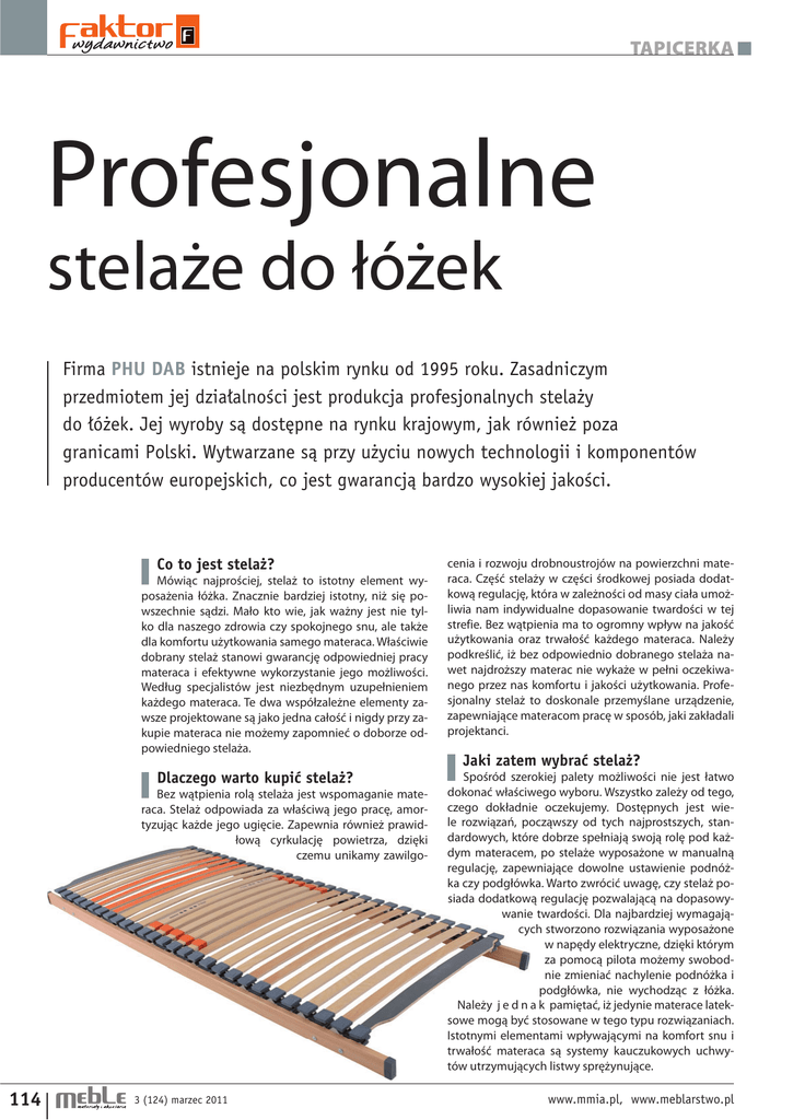 TAPICERKA Profesjonalne stelaże do łóżek Firma PHU DAB istnieje na polskim rynku od 1995 roku. Zasadniczym przedmiotem jej działalności jest produkcja profesjonalnych stelaży do łóżek. Jej wyroby są dostępne na rynku krajowym, jak również poza granicami Polski. Wytwarzane są przy użyciu nowych technologii i komponentów producentów europejskich, co jest gwarancją bardzo wysokiej jakości. Co to jest stelaż? Mówiąc najprościej, stelaż to istotny element wyposażenia łóżka. Znacznie bardziej istotny, niż się powszechnie sądzi. Mało kto wie, jak ważny jest nie tylko dla naszego zdrowia czy spokojnego snu, ale także dla komfortu użytkowania samego materaca. Właściwie dobrany stelaż stanowi gwarancję odpowiedniej pracy materaca i efektywne wykorzystanie jego możliwości. Według specjalistów jest niezbędnym uzupełnieniem każdego materaca. Te dwa współzależne elementy zawsze projektowane są jako jedna całość i nigdy przy zakupie materaca nie możemy zapomnieć o doborze odpowiedniego stelaża. Dlaczego warto kupić stelaż? Bez wątpienia rolą stelaża jest wspomaganie materaca. Stelaż odpowiada za właściwą jego pracę, amortyzując każde jego ugięcie. Zapewnia również prawidłową cyrkulację powietrza, dzięki czemu unikamy zawilgo- 114 3 (124) marzec 2011 cenia i rozwoju drobnoustrojów na powierzchni materaca. Część stelaży w części środkowej posiada dodatkową regulację, która w zależności od masy ciała umożliwia nam indywidualne dopasowanie twardości w tej strefie. Bez wątpienia ma to ogromny wpływ na jakość użytkowania oraz trwałość każdego materaca. Należy podkreślić, iż bez odpowiednio dobranego stelaża nawet najdroższy materac nie wykaże w pełni oczekiwanego przez nas komfortu i jakości użytkowania. Profesjonalny stelaż to doskonale przemyślane urządzenie, zapewniające materacom pracę w sposób, jaki zakładali projektanci. Jaki zatem wybrać stelaż? Spośród szerokiej palety możliwości nie jest łatwo dokonać właściwego wyboru. Wszystko zależy od tego, czego dokładnie oczekujemy. Dostępnych jest wiele rozwiązań, począwszy od tych najprostszych, standardowych, które dobrze spełniają swoją rolę pod każdym materacem, po stelaże wyposażone w manualną regulację, zapewniające dowolne ustawienie podnóżka czy podgłówka. Warto zwrócić uwagę, czy stelaż posiada dodatkową regulację pozwalającą na dopasowywanie twardości. Dla najbardziej wymagających stworzono rozwiązania wyposażone w napędy elektryczne, dzięki którym za pomocą pilota możemy swobodnie zmieniać nachylenie podnóżka i podgłówka, nie wychodząc z łóżka. Należy j e d n a k pamiętać, iż jedynie materace lateksowe mogą być stosowane w tego typu rozwiązaniach. Istotnymi elementami wpływającymi na komfort snu i trwałość materaca są systemy kauczukowych uchwytów utrzymujących listwy sprężynujące. www.mmia.pl, www.meblarstwo.pl TAPICERKA Co może zaoferować w zakresie stelaży firma DAB? W ofercie tego producenta należy przyjrzeć się rozwiązaniom dostępnym w dwóch kolekcjach: Standard ST/38 oraz Perfect. Obie linie produktów wykonane są w całości z drewna bukowego, klejonego warstwowo, co nadaje stelażom odpowiednią wytrzymałość. Każdy z nich posiada solidną, drewnianą ramę, a także poprzeczne, drewniane listwy wzmacniające. Trzony wzdłużne są dodatkowo foliowane dla walorów estetycznych. Stelaże zbudowane są z 28 listew bukowych, sprężynujących, o szerokości 38 mm, gwarantujących doskonałą amortyzację materaca. Odległości między listwami są zgodne z wytycznymi i zaleceniami producentów materaców. Listwy nie leżą bezpośrednio w ramie łóżka. Każda posiada indywidualne mocowanie kauczukowe w ramie stelaża. Kształty tych mocowań różnią się w zależności od typu i jakości danego modelu stelaża. Kauczukowe uchwyty, w których osadzone są listwy, dzięki swej wysokości zapewniają większą elastyczność. Każdy stelaż w części środkowej posiada dodatkową regulację, która w zależności od masy ciała umożliwia indywidualne dopasowanie twardości w tej strefie. Podstawowa różnica między kolekcjami polega na zastosowaniu 2 różnych typów mocowań kauczukowych, w związku z tym w serii Standard listwy sprężynujące chowają się całe wraz z uchwytami pomiędzy ramy wzdłużne, a w Perfect okrywają ramy aż po same krańce, optymalnie pracując na całej swojej powierzchni (materac nigdy nie dotyka ramy). W skład każdej linii wchodzą 3 rodzaje stelaży: • bez regulacji NV – zalecany do wszystkich rodzajów materaców, • z regulacją manualną KF – posiada zmianę skokową nachylenia podgłówka i podnóżka, • z regulacją elektryczną KFE – oferuje płynną zmianę nachylenia podgłówka i podnóżka, regulowanie podgłówka i podnóżka odrębnie lub równocześnie. Stelaż posiadający regulację jest wspaniałym udogodnieniem. Dla tych, którzy chcą usiąść w łóżku, zjeść w nim śniadanie, oglądać telewizję czy zrelaksować się, czytając książkę, dobrym rozwiązaniem może okazać się regulowany podgłówek. Pozwala on uniknąć uciążliwego bólu, jaki towarzyszy zmęczeniu mięśni szyjnych. Z kolei podnosząc podnóżek stelaża, możemy regulować kąt, pod jakim leżą nogi, kiedy śpimy. Jest to bardzo przydatne rozwiązanie dla osób pracującej w pozycji stojącej, mających żylaki lub problemy z krążeniem. Z myślą o najbardziej wymagających powstały stelaże sterowane za pomocą elektrycznego przełącznika – pilota. Jest to wygodne rozwiązanie również dla ludzi chorych, którzy dużo czasu muszą spędzać w pozycji leżącej. Dzięki pilotowi bez większego wysiłku można regulować ustawienie i nachylenie podgłówka czy podnóżka tak, by odpoczynek był naprawdę komfortowy. Do tego typu stelaży powinno się jednak kupować odpowiednie matera