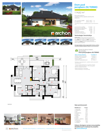 Dom pod jarząbem (N) TERMO Pełnobranżowe odbicie lustrzane 114,62 m2 Dom jednorodzinny 4 pokoje, kuchnia, spiżarka, łazienka, WC, kotłownia min. wymiary działki: 23,37 x 18,77 m po adaptacji:* 21,92 x 18,32 m *Likwidacja wykusza, modyfikacja okna w pomieszczeniu nr 5. powierzchnia podłóg: powierzchnia zabudowy: powierzchnia dachu: kubatura: wysokość budynku: wysokość kondygnacji: (114,62) 151,27 222,60 751,95 6,93 2,67 m2 m2 m2 m3 m m Technologia i konstrukcja Dodatkowe informacje oraz zdjęcia z realizacji na www.archon.pl elewacja wejściowa elewacja boczna elewacja boczna ściany zewn.: pustak ceramiczny Porotherm 25 cm + styropian w kropki Termo Organika 20 cm + tynk; strop: płyta żelbetowa; dach: czterospadowy, nachylenie 30 st., więźba drewniana, dachówka ceramiczna; kocioł: gazowy, możliwość zamiany na paliwo stałe po adaptacji elewacja ogrodowa Do tego projektu możesz wprowadzić zmiany, na które wyrazimy bezpłatną zgodę. Więcej na www.archon.pl Koszty budowy (netto) dla projektu Dom pod jarząbem (N) TERMO Stan surowy otwarty: Roboty wykończeniowe: Instalacje wewnętrzne*: Koszty ogółem: Systemem gospodarczym: 114 700 134 649 34 908 284 257 227 406 zł zł zł zł zł Kosztorys w przygotowaniu - podane stawki są kosztami szacunkowymi * koszty instalacji doliczamy w wysokości 14% do wartości robót budowlanych i 12% w przypadku domów z podpiwniczeniem Pobierz zestawienie materiałów i dane do kalkulacji z www.archon.pl PARTER Opis pomieszczeń: 114,62 PARTER (m2) 1. Wiatrołap 3,84 2. Kotłownia 4,67 3. Hol 5,47 4. Przedpokój 4,15 5. Pokój 12,04 6. Łazienka 6,22 7. Pokój 14,31 8. Pokój 15,77 9. Salon + Jadalnia 32,80 10. Kuchnia 11,72 11. Spiżarnia 2,04 12. Toaleta 1,59 ISO 9001 ARCHON+ Biuro Projektów, 32-400 Myślenice, ul. Słowackiego 86, tel. 12/ 37 21 900, www.archon.pl Plik utworzono: 2013-03-12 Zobacz dostępne wersje oraz projekty dodatkowych instalacji do projektu na www.archon.pl