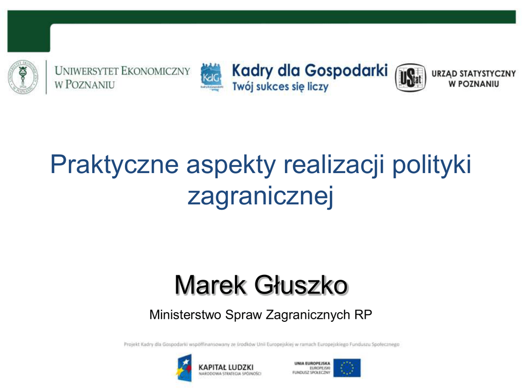 Praktyczne aspekty realizacji polityki zagranicznej Marek Głuszko Ministerstwo Spraw Zagranicznych RP Dyplomacja Publiczna Departament Dyplomacji Publicznej i Kulturalnej listopad 2014 Dyplomacja publiczna Kształtowanie opinii publicznej Dialog ze społeczeństwem ? Przeciwdziała nie stereotypom Budowanie wizerunku Priorytety polskiej polityki zagranicznej 2012-16 Silna Polska w silnej unii politycznej Polska jako wiarygodny sojusznik w stabilnym ładzie euroatlantyckim Polska otwarta na różne wymiary współpracy regionalnej Współpraca rozwojowa, promocja demokracji i praw człowieka Promocja Polski za granicą Nowa jakość w relacjach z Polonią i Polakami za granicą Skuteczna służba zagraniczna Przykłady udanych działań z ostatnich lat 2011 – Prezydencja w Radzie Unii Europejskiej - Rok Czesława Miłosza - Rok Marii Skłodowskiej-Curie 2012 – Mistrzostwa Europy w Piłce Nożnej - EURO2012 - Rok Janusza Korczaka 2013 – Wyszehradzki Rajd Kolarski - Rok Witolda Lutosławskiego - Rok Juliana Tuwima 2014 – Rocznice 10 lat w UE, 15 w NATO, 25 lat po transformacji ustrojowej - Kampania wizerunkowa „Polska. Spring into new” -Działania profrekwencyjne przed wyborami do PE Promocja Polski w 2014 r. Rocznice 25-15-10 Zasady komunikacji marki POLSKA Kampania wizerunkowa za granicą Zaangażowanie Polaków w promocję Polski Dalsze kroki w kierunku uspójnienia identyfikacji wizualnej Kampania „Polska. Spring into new” Teaser – outdoor – 150 miejsc w Londynie PR i media społecznościowe Spot TV – Saatchi&Saatchi. Udział Chrisa Niedenthala. Struktury i narzędzia ddpik Instytucje krajowe Sieć placówek za granicą Media Środowiska opiniotwórcze Organizacje pozarządowe Polonia i Polacy za granicą Narzędzia placówek zagranicznych Dyplomacja kulturalna Współpraca naukowa Wizyty studyjne Promocja języka polskiego Budowa sieci kontaktów miejscowych, udział w imprezach cyklicznych Dyplomacja historyczna Projekty pomocowe Rozwój sieci IP Tradycje przedwojen ne – Londyn, Budapeszt – 1939 Okres powojenny 1949 – 1989 – Sofia, Bratysława, Berlin, Wiedeń, Sztokholm, Paryż, Praga, Moskwa Po 1989 – Rzym, Düsseldorf, Wilno, Mińsk, St. Petersburg, Kijów, Tel A., Nowy Jork, Bukareszt Bruksela, Madryt Ostatnie lata – wyjście poza Europę – Tokio, New Delhi W 2014 roku – Pekin Dalsze plany – Ameryka Łacińska, Bliski Wschód, Afryka Wyzwania wewnętrzne Spójność wizerunkowa Koordynacja i kumulowanie budżetów Wymiana informacji, wspólne strategie Wyzwania zewnętrzne Kształtowanie i wzmacnianie pożądanego wizerunku Wiarygodność przekazu Właściwe definiowanie odbiorców Kształtowanie przychylnej Polsce zagranicznej opinii publicznej Kształtowanie wizerunku Polski jako wartościowego partnera politycznego, gospodarczego, naukowego, społecznego i kulturalnego Poprawa wiedzy i zrozumienia naszego kraju, jego historii, kultury, wkładu w rozwój Europy i świata Wzmocnienie wizerunku Polski jako kraju posiadającego stabilne perspektywy rozwoju dzięki przynależności do UE i NATO Wzmocnienie prestiżu Polski na arenie międzynarodowej Stymulowanie kontaktów i współpracy pomiędzy zagranicznymi i polskimi partnerami Dziękuję za uwagę! Praktyczne aspekty realizacji polityki zagranicznej Marek Głuszko Ministerstwo Spraw Zagranicznych RP
