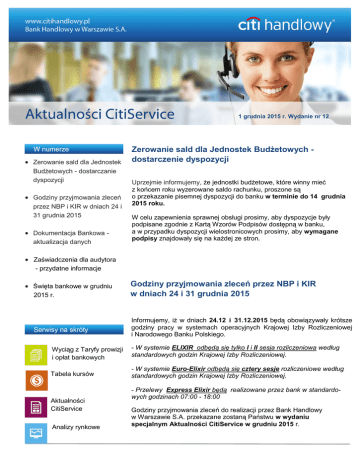 1 grudnia 2015 r. Wydanie nr 12 Zerowanie sald dla Jednostek Budżetowych - dostarczanie dyspozycji Godziny przyjmowania zleceń przez NBP i KIR w dniach 24 i 31 grudnia 2015 Dokumentacja Bankowa aktualizacja danych Zerowanie sald dla Jednostek Budżetowych dostarczenie dyspozycji Uprzejmie informujemy, że jednostki budżetowe, które winny mieć z końcem roku wyzerowane saldo rachunku, proszone są o przekazanie pisemnej dyspozycji do banku w terminie do 14 grudnia 2015 roku. W celu zapewnienia sprawnej obsługi prosimy, aby dyspozycje były podpisane zgodnie z Kartą Wzorów Podpisów dostępną w banku, a w przypadku dyspozycji wielostronicowych prosimy, aby wymagane podpisy znajdowały się na każdej ze stron. Zaświadczenia dla audytora - przydatne informacje Święta bankowe w grudniu 2015 r. Godziny przyjmowania zleceń przez NBP i KIR w dniach 24 i 31 grudnia 2015 Informujemy, iż w dniach 24.12 i 31.12.2015 będą obowiązywały krótsze godziny pracy w systemach operacyjnych Krajowej Izby Rozliczeniowej i Narodowego Banku Polskiego. Wyciąg z Taryfy prowizji i opłat bankowych - W systemie ELIXIR odbędą się tylko I i II sesja rozliczeniowa według standardowych godzin Krajowej Izby Rozliczeniowej. Tabela kursów - W systemie Euro-Elixir odbędą się cztery sesje rozliczeniowe według standardowych godzin Krajowej Izby Rozliczeniowej. Aktualności CitiService Analizy rynkowe - Przelewy Express Elixir będą realizowane przez bank w standardowych godzinach 07:00 - 18:00 Godziny przyjmowania zleceń do realizacji przez Bank Handlowy w Warszawie S.A. przekazane zostaną Państwu w wydaniu specjalnym Aktualności CitiService w grudniu 2015 r. Dokumentacja Bankowa - aktualizacja danych Roczne Potwierdzenia Sald Informujemy, iż potwierdzenia stanu sald na dzień 31.12.2015 r. będą wysyłane przez Bank na Państwa adresy korespondencyjne. Prosimy o ich weryfikację i, jeżeli jest taka konieczność, aktualizację adresów korespondencyjnych. Wysyłka rocznego potwierdzenia sald nastąpi 9 dnia roboczego stycznia, czyli 15.01.2016 r. Zaświadczenia dla audytora - przydatne informacje W związku ze zbliżającym się zakończeniem roku obrotowego i koniecznością przedstawiania sprawozdań finansowych, w tym zaświadczeń audytowych w ramach prowadzonych rachunków bankowych w Banku Handlowym w Warszawie S.A., niniejszym przedstawiamy Państwu zakres informacji umieszczanych na poszczególnych rodzajach zaświadczeń: Audyt standardowy - zawiera informację o saldach na wszystkich rachunkach bankowych Klienta. Czas wystawienia dokumentu do 3 dni roboczych. Opłata zgodnie z Tabelą Opłat i Prowizji wynosi 200 PLN. Audyt niestandardowy - zawiera odpowiedzi na wszystkie pytania audytora, zgodnie z wnioskiem audytowym. Czas wystawienia dokumentu do 5 dni roboczych. Opłata zgodnie z Tabelą Opłat i Prowizji wynosi 1000 PLN. Zaświadczenia będą wystawiane przez Bank analogicznie do lat ubiegłych, tj. w przypadku przygotowania dla Państwa audytu niestandardowego w roku poprzednim, w roku 2016 dokument zostanie przygotowany w takiej samej formie. W przypadku, kiedy Bank będzie wystawiał dla Klienta zaświadczenie po raz pierwszy, zostaną Państwo poproszeni o określenie zakresu odpowiedzi przygotowywanej biegłym rewidentom lub prosimy o dopisanie na zapytaniu jaka forma zaświadczenia powinna zostać przygotowana. Jednocześnie zwracamy uwagę, że Bank na Państwa prośbę bezpośrednio przekaże zaświadczenie do audytora wyłącznie w przypadku, kiedy zapytanie od audytora będzie podpisane zgodnie z reprezentacją Firmy określoną w KRS lub w stosownych pełnomocnictwach. Zapytanie audytora podpisane zgodnie z reprezentacją określoną w Karcie Wzorów Podpisów, będzie skutkowało przesłaniem zaświadczenia jedynie na adres siedziby Klienta. 2 Święta bankowe w grudniu 2015 r. Prezentujemy Państwu daty w grudniu 2015 roku, w których zlecenia będą realizowane następnego dnia roboczego ze względu na święto waluty (dzień wolny od pracy w danym kraju). Grudzień 01 - RON 02 - AED 07 - ARS, THB, VEF 08 - ALL, ARS, CLP, COP, MKD, PEN, SCR 10 - THB 16 - BHD, ZAR 17 - BHD, QAR 22 - ZWL 23 - JPY 24 - ARS, BGN, CZK, DKK, HUF, IDR, ISK, LTL, MYR, NOK, PHP, SEK, VEF 25 - ANG, ALL, ARS, AUD,BRL, BGN, BWP, CAD, CDF, CHF, CLP, CNY, COP, HRK, CZK, DKK, EUR, GBP, HKD, HUF, ISK, INR, IDR, JMD, JOD, KES, KRW, LBP, LTL, MWK, MUR, MYR, MXN, NPR, NOK, PKP, PEN, PHP, PLN, RON, SCR, SEK, SGD, UGX, USD, VEF, XOF, XAF, ZAR, ZMW, ZWL 28 - AUD, CAD, GBP, MWK, NZD 30 - PHP 31 - ARS, CLP, COP, DKK, JPY, KRW, LBP, PHP, SEK, THB, VEF 3 Bank Handlowy w Warszawie S.A. z siedzibą w Warszawie, ul. Senatorska 16, 00-923 Warszawa, zarejestrowany przez Sąd Rejonowy dla m.st. Warszawy w Warszawie, XII Wydział Gospodarczy Krajowego Rejestru Sądowego, pod nr. KRS 000 000 1538; NIP 526-030-02-91; wysokość kapitału zakładowego wynosi 522 638 400 złotych, kapitał został w pełni opłacony. Znaki Citi oraz Citi Handlowy stanowią zarejestrowane znaki towarowe Citigroup Inc., używane na podstawie licencji. Spółce Citigroup Inc. oraz jej spółkom zależnym przysługują również prawa do niektórych innych znaków towarowych tu użytych.