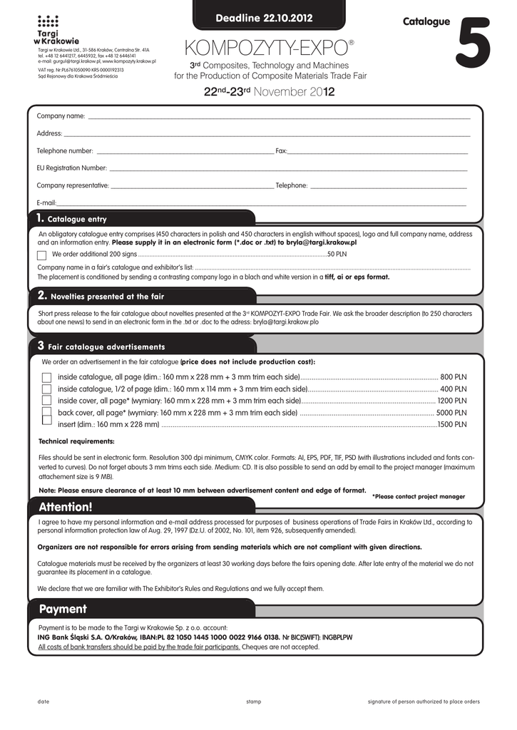 Deadline 22.10.2012 Catalogue ® Targi w Krakowie Ltd., 31-586 Kraków, Centralna Str. 41A tel. +48 12 6441217, 6445932, fax +48 12 6446141 e-mail: [email protected], www.kompozyty.krakow.pl VAT reg. Nr:PL6761050090 KRS 0000192313 Sàd Rejonowy dla Krakowa ÂródmieÊcia KOMPOZYTY-EXPO 3rd Composites, Technology and Machines for the Production of Composite Materials Trade Fair 5 22nd-23rd November 2012 Company name: ______________________________________________________________________________________________________________ Address: _____________________________________________________________________________________________________________________ Telephone number: ___________________________________________________ Fax:____________________________________________________ EU Registration Number: _______________________________________________________________________________________________________ Company representative: _______________________________________________ Telephone: _____________________________________________ E-mail:______________________________________________________________________________________________________________________ 1. Catalogue entry An obligatory catalogue entry comprises (450 characters in polish and 450 characters in english without spaces), logo and full company name, address and an information entry. Please supply it in an electronic form (*.doc or .txt) to [email protected] We order additional 200 signs ....................................................................................................................50 PLN Company name in a fair’s catalogue and exhibitor’s list: ......................................................................................................................................................................... The placement is conditioned by sending a contrasting company logo in a blach and white version in a tiff, ai or eps format. 2. Novelties presented at the fair Short press release to the fair catalogue about novelties presented at the 3rd KOMPOZYT-EXPO Trade Fair. We ask the broader description (to 250 characters about one news) to send in an electronic form in the .txt or .doc to the adress: [email protected] 3 Fair catalogue advertisements We order an advertisement in the fair catalogue (price does not include production cost): inside catalogue, all page (dim.: 160 mm x 228 mm + 3 mm trim each side).......................................................................... 800 PLN inside catalogue, 1/2 of page (dim.: 160 mm x 114 mm + 3 mm trim each side)...................................................................... 400 PLN inside cover, all page* (wymiary: 160 mm x 228 mm + 3 mm trim each side)........................................................................ 1200 PLN back cover, all page* (wymiary: 160 mm x 228 mm + 3 mm trim each side) ........................................................................ 5000 PLN insert (dim.: 160 mm x 228 mm) ....................................................................................................................................................1500 PLN Technical requirements: Files should be sent in electronic form. Resolution 300 dpi minimum, CMYK color. Formats: AI, EPS, PDF, TIF, PSD (with illustrations included and fonts converted to curves). Do not forget abouts 3 mm trims each side. Medium: CD. It is also possible to send an add by email to the project manager (maximum attachement size is 9 MB). Note: Please ensure clearance of at least 10 mm between advertisement content and edge of format. *Please contact project manager Attention! I agree to have my personal information and e-mail address processed for purposes of business operations of Trade Fairs in Kraków Ltd., according to personal information protection law of Aug. 29, 1997 (Dz.U. of 2002, No. 101, item 926, subsequently amended). Organizers are not responsible for errors arising from sending materials which are not compliant with given directions. Catalogue materials must be received by the organizers at least 30 working days before the fairs opening date. After late entry of the material we do not guarantee its placement in a catalogue. We declare that we are familiar with The Exhibitor’s Rules and Regulations and we fully accept them. Payment Payment is to be made to the Targi w Krakowie Sp. z o.o. account: ING Bank Âlàski S.A. O/Kraków, IBAN:PL 82 1050 1445 1000 0022 9166 0138. Nr BIC(SWIFT): INGBPLPW All costs of bank transfers should be paid by the trade fair participants. Cheques are not accepted. date stamp signature of person authorized to place orders