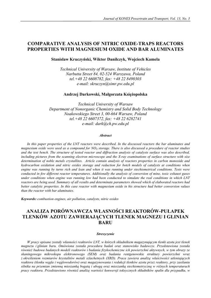 Journal of KONES Powertrain and Transport, Vol. 13, No. 3 COMPARATIVE ANALYSIS OF NITRIC OXIDE-TRAPS REACTORS PROPERTIES WITH MAGNESIUM OXIDE AND BAR ALUMINATES Stanisáaw KruczyĔski, Wiktor Danilczyk, Wojciech Kamela Technical University of Warsaw, Institute of Vehicles Narbutta Street 84, 02-524 Warszawa, Poland tel.+48 22 6608782, fax: +48 22 8490303 e-mail: [email protected] Andrzej Darkowski, Maágorzata KsiĊĪopolska Technical University of Warsaw Department of Nonorganic Chemistry and Solid Body Technology Noakowskiego Street 3, 00-664 Warsaw, Poland tel.+48 22 6607372, fax: +48 22 6282741 e-mail: [email protected] Abstract In this paper properties of the LNT reactors were described. In the discussed reactors the bar aluminates and magnesium oxide were used as a compound for NOX storage. There is also discussed a procedure of reactor studies and the test bench. The structure of tested reactor and diffraction analysis of catalysts surface was also described, including pictures from the scanning electron microscope and the X-ray examinations of surface structure with size determination of noble metals crystallites. Article contain analysis of reactors properties in carbon monoxide and hydrocarbon oxidation and nitric oxides storage and reduction for botch models of catalysts at conditions when engine was running by turns rich and lean and when it was running under stechiometrical conditions. Tests were conducted in few different reactor temperatures. Additionally the analysis of conversion of mine, toxic exhaust gases under conditions when engine was running low had been conducted to simulate the real conditions in which LNT reactors are being used. Summary of all results and determinate parameters showed which of elaborated reactors had better catalytic properties. In this case reactor with magnesium oxide in his structure had better conversion values than the reactor with bar aluminates. Keywords: combustion engines, air pollution, catalysts, nitric oxides ANALIZA PORÓWNAWCZA WàASNOĝCI REAKTORÓW-PUàAPEK TLENKÓW AZOTU ZAWIERAJĄCYCH TLENEK MAGNEZU I GLINIAN BARU Streszczenie W pracy opisane zostaáy wáasnoĞci reaktorów LNT, w których skáadnikiem magazynującym tlenki azotu jest tlenek magnezu i glinian baru. Omówiona zostaáa procedura badaĔ oraz stanowisko badawcze. Przedstawiona zostaáa równieĪ budowa badanych modeli reaktorów i badania fizykochemiczne ich powierzchni aktywnych, w tym obrazy ze skaningowego mikroskopu elektronowego (SEM) oraz badania rentgenowskie struktury powierzchni wraz z okreĞleniem rozmiarów krystalitów metali szlachetnych (XRD). Praca zawiera analizĊ wáaĞciwoĞci utleniających reaktora (tlenku wĊgla i wĊglowodorów) oraz magazynowania i redukcji tlenków azotu przez reaktory, przy zasilaniu silnika na przemian zmienną mieszanką bogatą i ubogą oraz mieszanką stechiometryczną w róĪnych temperaturach pracy reaktora. Przedstawiono równieĪ analizĊ wartoĞci konwersji toksycznych skáadników spalin dla przypadku, w S. KruczyĔski, W. Danilczyk, W. Kamela, A. Darkowski, M. KsiĊĪopolska którym przez badane reaktory przepáywaáy spaliny z silnika zasilanego mieszanką ubogą. Symulacja ta zostaáa przeprowadzona w celu odwzorowania rzeczywistych warunków pracy tego typu reaktorów. Podsumowanie wszystkich wyników zarówno badaĔ, jak i wyznaczonych parametrów pozwoliáo ostatecznie okreĞliü, który z opracowanych reaktorów charakteryzowaá siĊ lepszymi parametrami pracy. Z dwóch reaktorów, których dotyczy niniejsza praca lepszym pod wzglĊdem wáaĞciwoĞci katalitycznych okazaá siĊ reaktor zawierający w swojej strukturze tlenek magnezu. Sáowa kluczowe: silniki spalinowe, zanieczyszczenie powietrza, raktory katalityczne, tlenki azotu 1.WstĊp KoniecznoĞü zmniejszenia zuĪycia paliwa i ograniczenia emisji dwutlenku wĊgla przez pojazdy samochodowe spowodowaáy rozwój technik pozwalających na spalanie w silnikach o zapáonie iskrowym mieszanek ubogich. Silniki takie np. silniki FSI Volkswagena czy silniki HPI koncernu PSA, spalają mieszanki uwarstwione o stosunku powietrza do paliwa A/F okoáo 50 i zawierają w spalinach ponad do 10% tlenu. Pracując w tych warunkach klasyczny trójfunkcyjny reaktor katalityczny TWC (Three Way Catalyst) wykazuje bardzo sáabą skutecznoĞü redukcji NOX. Wobec tego rozwinĊáy siĊ technologie budowy reaktorów umoĪliwiających usuwanie NOX w obecnoĞci tlenu w spalinach. Reaktory takie nazywane są w literaturze puáapkami tlenków azotu LNT (Lean NOX Traps) PoniĪej przedstawiony jest rysunek obrazujący sposób magazynowania oraz uwalniania i redukcji NOX w reaktorach typu LNT. Tlenki azotu (NOx) Tlen (O2) Dwutlenek azotu (NO2) Platyna (Pt) Tlenek baru (BaO) Azotan barowy (Ba(NO3)2) Magazynowanie – mieszanka uboga (Ȝ>1) Tlenek wĊgla (CO) WĊglowodory (HC) Wodór (H2) Azotan barowy (Ba(NO3)2) Dwutlenek wĊgla (CO2) Tlenki azotu (NOx) Tlenek wĊgla (CO) Tlenek baru (BaO) Dwutlenek wegla (CO2) Azot (N2) Platyna (Pt) Rod (Rh) Redukcja – mieszanka bogata (Ȝ<1) Rys. 1. Schemat mechanizmów magazynowania i redukcji tlenków azotu Fig. 1. Schematics of mechanisms of nitric oxides storage and reduction Mechanizm redukcji NOX jest nastĊpujący. W pierwszym kroku NO reaguje z O2 tworząc NO2, który nastĊpnie tworzy termicznie stabilne azotany z zasadowymi tlenkami. W ten sposób magazynowany NOX stopniowo pokrywa materiaá magazynujący i musi byü okresowo usuwany. Aby zredukowaü zmagazynowane NOX do azotu, konieczne są okresowe zmiany z mieszanki ubogiej na mieszankĊ bogatą (okres redukcji – krótki impuls mieszanki bogatej), w której powierzchniowe azotany rozkáadają siĊ i NOX są nie selektywnie redukowane, poprzez CO, H2 i HC tak jak to siĊ dzieje w klasycznym reaktorze trójfunkcyjnym [1]. WáaĞciwoĞci materiaáów adsorbujących tlenki azotu są obecnie przedmiotem intensywnych prac badawczych [1, 2, 3, 4, 5]. Przebadano wáaĞciwoĞci adsorpcyjne m