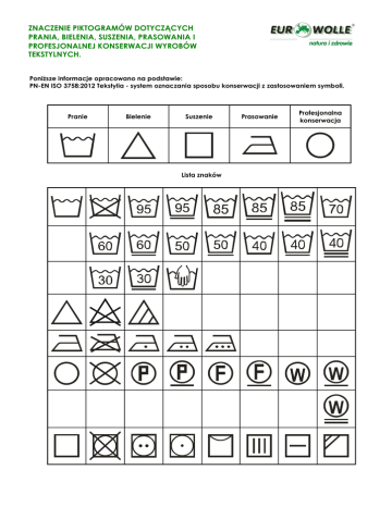 ZNACZENIE PIKTOGRAMÓW DOTYCZĄCYCH PRANIA, BIELENIA, SUSZENIA, PRASOWANIA I PROFESJONALNEJ KONSERWACJI WYROBÓW TEKSTYLNYCH. Poniższe informacje opracowano na podstawie: PN-EN ISO 3758:2012 Tekstylia - system oznaczania sposobu konserwacji z zastosowaniem symboli. Pranie Bielenie Suszenie Lista znaków Prasowanie Profesjonalna konserwacja PRANIE Proces prania symbolizuje wanienka przedstawiona na Rysunku 1. Rysunek 1 BIELENIE Dla procesów bielenia symbolem jest trójkąt przedstawiony na Rysunku 2. Rysunek 2 SUSZENIE Dla procesów suszenia symbolem jest kwadrat przedstawiony na Rysunku 3. Rysunek 3 Dla suszenia w suszarce bębnowej po procesie prania symbolem jest kwadrat z wpisanym okręgiem, przedstawiony na Rysunku 4. Dodatkowe informacje o symbolach dotyczących naturalnego suszenia poniżej. Rysunek 4 PRASOWANIE I PAROWANIE Dla procesów prasowania i parowania, symbol ma kształt ręcznego żelazka, jak na Rysunku 5. Rysunek 5 strona 2 / 7 PROFESJONALNA KONSERWACJA TEKSTYLIÓW Dla profesjonalnych procesów czyszczenia chemicznego i przemysłowego) symbolem jest okrąg przedstawiony na Rysunku 6. wodnego (z pominięciem prania Rysunek 6 OBRÓBKA NIEDOZWOLONA Do sześciu symboli opisanych w 3.1.1 do 3.1.5 jako dodatkowy symbol wprowadzono krzyż św. Andrzeja, który nałożony na którykolwiek z tych symboli oznacza, że obróbka jaką reprezentuje dany symbol nie powinna być stosowana. Rysunek 7 OBRÓBKA ŁAGODNA Wprowadzony do podstawowych symboli, dodatkowy pasek pod symbolem oznacza obróbkę złagodzoną w stosunku do tej jaką oznacza ten sam symbol bez paska, np. oddziaływanie mechaniczne ograniczone. Rysunek 8 OBRÓBKA BARDZO ŁAGODNA Wprowadzony do podstawowych symboli, dodatkowy podwójny pasek pod symbolem oznacza bardzo łagodny proces, np. bardzo złagodzone oddziaływanie mechaniczne. Rysunek 9 TEMPERATURA OBRÓBKI Temperatura, wraz z symbolem podawana jest jako liczba odpowiadająca stopniom w skali Celsjusza (30, 40, 50, 60, 70 lub 95) bez oznaczenia „oC ”. Do trzech symboli pranie, suszenie i prasowanie i parowanie mogą być dodatkowo stosowane kropki w celu określenia temperatury obróbki. Opisy temperatur podano przy symbolach podstawowych obróbek. Rysunek 10 PRANIE Wanienka jest symbolem domowego procesu prania (ręcznego lub maszynowego) (patrz Rysunek 1). Znak jest stosowany do przekazania informacji o maksymalnej temperaturze prania oraz maksymalnej intensywności procesu prania, jak przedstawiono w Tablicy 1. Tablica 1 — Symbole procesów prania Symbol Proces prania — maksymalna temperatura prania 95 oC — proces normalny — maksymalna temperatura prania 95 oC — proces łagodny — maksymalna temperatura prania 70 oC — proces normalny — maksymalna temperatura prania 60 oC — proces normalny — maksymalna temperatura prania 60 oC — proces łagodny — maksymalna temperatura prania 50 oC — proces normalny — maksymalna temperatura prania 50 oC — proces łagodny — maksymalna temperatura prania 40 oC — proces normalny — maksymalna temperatura prania 40 oC — proces łagodny — maksymalna temperatura prania 40 oC — proces bardzo łagodny — maksymalna temperatura prania 30 oC — proces normalny — maksymalna temperatura prania 30 oC — proces łagodny — maksymalna temperatura prania 30 oC — proces bardzo łagodny — pranie ręczne — maksymalna temperatura 40 oC — nie prać BIELENIE Trójkąt jest symbolem procesu bielenia (patrz Rysunek 2 i Tablica 2). Tablica 2 — Symbole bielenia Symbol Proces bielenia — dozwolone bielenie dowolnym środkiem utleniającym — dozwolone bielenie tylko środkiem tlenowym bezchlorowym — nie stosować bielenia/bez bielenia strona 4 / 7 SUSZENIE Suszenie w suszarce bębnowej Okrąg wpisany w kwadrat jest symbolem suszenia w suszarce bębnowej po procesie prania (patrz Rysunek 4); jedna kropka lub dwie kropki umieszczone wewnątrz symbolu, jak pokazano w Tablicy 3, wskazują maksymalne temperatury. Tablica 3 — Symbole suszenia w suszarce bębnowej Symbol Proces suszenia w suszarce bębnowej d — dopuszczalne suszenie w suszarce bębnowej — temperatura normalna — dopuszczalne suszenie w suszarce bębnowej — suszenie w niższej temperaturze — nie suszyć w suszarce bębnowej SYMBOLE NATURALNEGO SUSZENIA Informacje ogólne W związku ze światową tendencją unifikacji sposobu oznaczania naturalnego suszenia, określone symbole zostały wprowadzone do stosowania w tych krajach, w których istnieje potrzeba ich stosowania. W przypadku ich zastosowania zaleca się umieszczanie ich poniżej 5-symbolowego oznaczenia i wyraźne oddzielenie od symboli znormalizowanych. Instrukcje dotyczące naturalnego suszenia można podać słownie lub w postaci symboli. Definicja Naturalne suszenie jest procesem realizowanym po praniu wyrobu włókienniczego mający na celu usunięcie pozostałości wody poprzez powieszenie odciśniętego wyrobu na sznurze, suszenia bez wyżymania lub płaskie rozłożenie wyrobu na słońcu lub w cieniu. Opis i definicja symboli Symbolem naturalnego suszenia jest kwadrat przedstawiony na Rysunku 6. Rysunek 11 Wprowadzenie dodatkowego symbolu wewnątrz kwadratu obrazuje procesy naturalnego suszenia, takie jak suszenie na sznurze, ociekanie, suszenie w stanie rozłożonym, suszenie na sznurze w cieniu, ociekanie w cieniu i suszenie w stanie rozłożonym w cieniu, jak podano w Tablicy 4. Kwadrat z linią krzywą między górnymi rogami informuje o suszeniu na sznurze, gdzie wilgotny wyrób włókienniczy jest suszony na sznurze lub belce, w pomieszczeniu lub na zewnątrz, po usunięciu nadmiaru wody. Kwadrat z trzema pionowymi liniami wewnątrz symbolizuje proces ociekania, w którym ociekający z wody wyrób włókienniczy wiesza się i suszy, po nadaniu mu kształtu lub wygładzeniu ewentualnie bez tych czynności, w pomieszczeniu lub na zewnątrz bez usuwania nadmiaru wody. Kwadrat z poziomą linią wewnątrz symbolizuje proces suszenia w stanie rozło