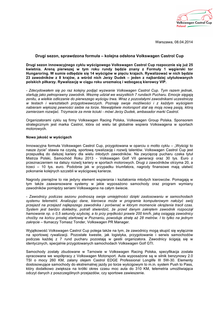 Warszawa, 08.04.2014 Drugi sezon, sprawdzona formuła – kolejna odsłona Volkswagen Castrol Cup Drugi sezon innowacyjnego cyklu wyścigowego Volkswagen Castrol Cup rozpocznie się już 25 kwietnia. Areną pierwszej w tym roku rundy będzie znany z Formuły 1 węgierski tor Hungaroring. W sumie odbędzie się 14 wyścigów w pięciu krajach. Rywalizować w nich będzie 23 zawodników z 8 krajów, a wśród nich Jerzy Dudek – jeden z najbardziej utytułowanych polskich piłkarzy. Rywalizację w ciągu roku urozmaicą i wzbogacą kierowcy VIP. - Zdecydowałem się po raz kolejny podjąć wyzwanie Volkswagen Castrol Cup. Tym razem jednak, startuję jako pełnoprawny zawodnik. Wezmę udział we wszystkich 7 rundach Pucharu. Emocje sięgają zenitu, a wielkie odliczanie do pierwszego wyścigu trwa. Wraz z pozostałymi zawodnikami uczestniczę w testach i warsztatach przygotowawczych. Poznaję swoje możliwości i z każdym wyścigiem nabieram większej pewności siebie na torze. Niewątpliwie motorsport stał się moją nową pasją, którą zamierzam rozwijać. Trzymacie za mnie kciuki - mówi Jerzy Dudek, ambasador marki Castrol. Organizatorami cyklu są firmy Volkswagen Racing Polska, Volkswagen Group Polska. Sponsorem strategicznym jest marka Castrol, która od wielu lat globalnie wspiera Volkswagena w sportach motorowych. Nowa jakość w wyścigach Innowacyjna formuła Volkswagen Castrol Cup, przygotowana w oparciu o motto cyklu – „Wyścigi to nasze życie” stawia na czystą, sportową rywalizację i rozwój talentów. Volkswagen Castrol Cup jest przepustką do dalszej kariery dla wielu młodych zawodników. Na zwycięzcę pucharu czeka tytuł Mistrza Polski, Samochód Roku 2013 - Volkswagen Golf VII generacji oraz 30 tys. Euro z przeznaczeniem na dalszy rozwój kariery w sportach motorowych. Drugi z zawodników otrzyma 20, a trzeci – 10 tys. euro. Podobnie jak w przypadku triumfatora, nagrody finansowe mają ułatwić pokonanie kolejnych szczebli w wyścigowej karierze. Nagrody pieniężne to nie jedyny element wspierania i kształcenia młodych kierowców. Pomagają w tym także zaawansowane systemy w jakie wyposażono samochody oraz program wymiany zawodników pomiędzy seriami Volkswagena na całym świecie. - Zawodnicy podczas sezonu podnoszą swoje umiejętności dzięki zastosowaniu w samochodach systemu telemetrii. Analizując dane, kierowca może w programie komputerowym nałożyć swój przejazd na przejazd najlepszego zawodnika i porównać w którym momencie okrążenia tracił czas. System jest bardzo dokładny, potrafi stwierdzić, że przed danym zakrętem zawodnik rozpoczął hamowanie np. o 0,5 sekundy szybciej, a to przy prędkości prawie 200 km/h, jaką osiągają zawodnicy choćby na końcu prostej startowej w Poznaniu, powoduje stratę aż 28 metrów. I to tylko na jednym zakręcie – tłumaczy Tomasz Tonder, Volkswagen PR Manager. Wyjątkowość Volkswagen Castrol Cup polega także na tym, że zawodnicy mogą skupić się wyłącznie na sportowej rywalizacji. Pozostałe kwestie, jak logistyka, przygotowanie i serwis samochodów podczas każdej z 7 rund pucharu pozostają w gestii organizatora. Zawodnicy ścigają się w identycznych, specjalnie przygotowanych samochodach Volkswagen Golf GTI. Samochody zostały zbudowane w Tarnowie w Volkswagen Racing Polska, specyfikacja została opracowana we współpracy z Volkswagen Motorsport. Auta wyposażone są w silnik benzynowy 2.0 TSI o mocy 260 KM, zalany olejem Castrol EDGE Professional Longlife III 5W-30. Elementy dostosowujące samochody do ekstremalnej jazdy po torze wyścigowym to m.in. system Push to Pass, który dodatkowo zwiększa na krótki okres czasu moc auta do 310 KM, telemetria umożliwiająca odczyt danych z poszczególnych przejazdów, czy sportowe zawieszenie. - Liczymy na duże emocje, walkę i zaangażowanie zawodników. Volkswagen Castrol Cup to dla nas strategiczny projekt sponsoringowy w Polsce poprzez który chcemy promować nasze partnerstwo z Volkswagenem i rozwijać polską motoryzację - podkreśla Dorota Staszewska – Kumiszcze, Castrol Sponsorship & Public Relation Manager. Rywalizacja fair play i taktyka Prawdziwą sportową rywalizację podkręca ograniczenie możliwości ingerencji w parametry samochodu wyścigowego. Zawodnik lub współpracujący z nim inżynier mogą jedynie regulować ciśnienie w oponach oraz zmieniać ustawienie przedniego stabilizatora. Dodatkowo, w ciągu jednego wyścigu zawodnicy kilkanaście razy mogą użyć systemu Push–to–Pass, który aktywowany jest naciśnięciem przycisku na kierownicy. Układ na 10 sekund podnosi moc silnika z 260 do 310 KM. – Jest to system, który nie tylko ułatwia wyprzedzanie, lecz także ubarwia rywalizację dodając element taktyczny. Umiejętne wykorzystanie tego systemu często decyduje o wynikach wyścigu. Push – to – Pass uczy zawodników sprytu, trenuje zmysł taktyczny i umiejętność zachowania zimnej krwi. O tym ile razy kierowca może jeszcze użyć tego „dopalacza” informuje liczba widoczna za bocznymi szybami wyścigowego Golfa GTI. Oprócz tego za przednią szybą samochodu znajduje się niebieska lampka. Jej zapalenie sygnalizuje, że system PTP jest w tym momencie aktywny – wyjaśnia Adam Gładysz z Volkswagen Racing Polska. Nowości w kalendarzu Podczas każdego weekendu wyścigowego odbywają się dwie sesje treningowe oraz sesja kwalifikacyjna – każda po 30 minut. Następnie zawodników czeka start w dwóch wyścigach. Inaczej niż w minionym roku, w tym sezonie kolejność startu do drugiego wyścigu ustalają drugie najlepsze czasy poszczególnych zawodników wywalczone w kwalifikacjach. Punkty za wyścig przyznawane są dla czołowej dwudziestki. W sezonie 2014 zwycięzca wyścigu otrzyma 50 pkt., a pozostali zawodnicy proporcjonalnie mniej, aż do 2 pkt. przyznawanych za 20. miejsce. Tegoroczna edycja Volkswagen Castrol Cup zostanie rozegrana na sześciu torach w pięciu krajach.