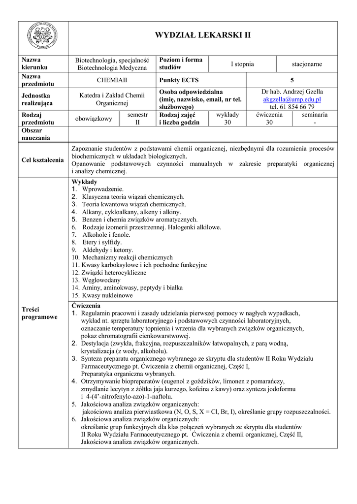 WYDZIAŁ LEKARSKI II Nazwa kierunku Nazwa przedmiotu Biotechnologia, specjalność Biotechnologia Medyczna Poziom i forma studiów CHEMIAII Punkty ECTS Jednostka realizująca Katedra i Zakład Chemii Organicznej Rodzaj przedmiotu Obszar nauczania Cel kształcenia obowiązkowy semestr II I stopnia Osoba odpowiedzialna (imię, nazwisko, email, nr tel. służbowego) wykłady Rodzaj zajęć 30 i liczba godzin stacjonarne 5 Dr hab. Andrzej Gzella [email protected] tel. 61 854 66 79 ćwiczenia seminaria 30 - Zapoznanie studentów z podstawami chemii organicznej, niezbędnymi dla rozumienia procesów biochemicznych w układach biologicznych. Opanowanie podstawowych czynności manualnych w zakresie preparatyki organicznej i analizy chemicznej. Wykłady 1. Wprowadzenie. 2. Klasyczna teoria wiązań chemicznych. 3. Teoria kwantowa wiązań chemicznych. 4. Alkany, cykloalkany, alkeny i alkiny. 5. Benzen i chemia związków aromatycznych. 6. Rodzaje izomerii przestrzennej. Halogenki alkilowe. 7. Alkohole i fenole. 8. Etery i sylfidy. 9. Aldehydy i ketony. 10. Mechanizmy reakcji chemicznych 11. Kwasy karboksylowe i ich pochodne funkcyjne 12. Związki heterocykliczne 13. Węglowodany 14. Aminy, aminokwasy, peptydy i białka 15. Kwasy nukleinowe Treści programowe Ćwiczenia 1. Regulamin pracowni i zasady udzielania pierwszej pomocy w nagłych wypadkach, wykład nt. sprzętu laboratoryjnego i podstawowych czynności laboratoryjnych, oznaczanie temperatury topnienia i wrzenia dla wybranych związków organicznych, pokaz chromatografii cienkowarstwowej. 2. Destylacja (zwykła, frakcyjna, rozpuszczalników łatwopalnych, z parą wodną, krystalizacja (z wody, alkoholu). 3. Synteza preparatu organicznego wybranego ze skryptu dla studentów II Roku Wydziału Farmaceutycznego pt. Ćwiczenia z chemii organicznej, Część I, Preparatyka organiczna wybranych. 4. Otrzymywanie biopreparatów (eugenol z goździków, limonen z pomarańczy, zmydlanie lecytyn z żółtka jaja kurzego, kofeina z kawy) oraz synteza jodoformu i 4-(4’-nitrofenylo-azo)-1-naftolu. 5. Jakościowa analiza związków organicznych: jakościowa analiza pierwiastkowa (N, O, S, X = Cl, Br, I), określanie grupy rozpuszczalności. 6. Jakościowa analiza związków organicznych: określanie grup funkcyjnych dla klas połączeń wybranych ze skryptu dla studentów II Roku Wydziału Farmaceutycznego pt. Ćwiczenia z chemii organicznej, Część II, Jakościowa analiza związków organicznych. Seminaria - nie przewiduje się Inne Formy i metody dydaktyczne Forma i warunki zaliczenia Wykład – forma tradycyjna z wykorzystaniem technik audiowizualnych Ćwiczenia laboratoryjne – wykonanie zadań przewidzianych planem ćwiczeń i sporządzenie protokołu. Wykłady egzamin ustny. Ćwiczenia laboratoryjne zaliczenie na podstawie oceny z części praktycznej ćwiczeń oraz pięciu sprawdzianów pisemnych. Skala ocen: bardzo dobry, ponad dobry, dobry, dość dobry, dostateczny, niedostateczny. Literatura podstawowa (nie więcej niż 3 pozycje) Literatura uzupełniająca Przedmiotowe efekty kształcenia E_W01 E_W02 E_U01 E_U03 E_U04 E_U05 1. 2. 3. 4. 5. J. Bojarski, Chemia organiczna J. McMurry, Chemia organiczna, tłumaczenie z j. angielskiego G. Kupryszewski, Chemia organiczna U. Wrzeciono, Ćwiczenia z chemii organicznej, Część I, Preparatyka organiczna U. Wrzeciono, Ćwiczenia z chemii organicznej, Część II, Jakościowa analiza związków organicznych 1. 2. 3. 4. H. Hart, L. Craine, D. Hart, Chemia organiczna P. Mastalerz, Chemia organiczna J. March, Chemia organiczna R. Morrison, R. Boyd, Chemia organiczna Efekty kształcenia Przedstawić w formie operatorowej: - zna - potrafi - rozumie - wykazuje umiejętności….. Ma podstawową wiedzę w zakresie chemii organicznej, w tym – potrafi dokonać klasyfikacji i nazwać związki organiczne omawiane na wykładzie, – zna ich właściwości fizyczne i chemiczne, – potrafi napisać równania reakcji charakterystycznych dla omawianych podczas wykładu klas związków, – zna podstawowe mechanizmy reakcji chemicznych, – zna rodzaje izomerii strukturalnej (łańcuchowa, grup funkcyjnych, położenia) i przestrzennej (cis – trans, izomeria optyczna, konformacyjna). Zna podstawowe zagadnienia związane z syntezą, izolacją i oczyszczaniem preparatów chemicznych. Potrafi posługiwać się takimi technikami chemii organicznej, jak destylacja, krystalizacja, ogrzewanie pod chłodnicą zwrotną, ekstrakcja, sączenie pod zmniejszonym ciśnieniem, badanie temperatury topnienia i wrzenia również w skali mikro (metoda Siwolobowa). Potrafi montować podstawowe zestawy aparaturowe stosowane w syntezie organicznej Potrafi przeprowadzić prostą reakcję chemiczną opisaną w przepisie oraz wyliczyć jej wydajność. Potrafi opisać przeprowadzoną syntezę organiczną oraz wyjaśnić Odniesienie do kierunkowych efektów kształcenia K_W01 K_W04 K_U01 K_U03 K_U06 K_U07 E_K04 Bilans nakładu pracy studenta podstawowe zagadnienia związane z otrzymaniem preparatu organicznego, jego izolacją i oczyszczaniem. Posiada umiejętność pracy w zespole. K_K04 Godziny kontaktowe z nauczycielem akademickim udział w wykładach udział w ćwiczeniach udział w konsultacjach związanych z zajęciami Samodzielna praca studenta przygotowanie do ćwiczeń przygotowanie do seminariów przygotowanie do kolokwiów przygotowanie do egzaminu 15 x 2 6x5 3x2 Razem 30 30 6 66 6x3 18 5x5 1 x 20 Razem 25 20 63 Liczba ECTS Liczba godzin Wskaźniki ilościowe Nakład pracy studenta związany z zajęciami wymagającymi bezpośredniego udziału nauczyciela 66 2 Nakład pracy studenta związany z zajęciami o charakterze praktycznym Łącznie 48 129 2 5 Metody weryfikacji efektu kształcenia Nr efektu kształcenia E_W01-05 E_U01-02 E_K01-02 Data opracowania programu Formujące (np. wejściówka, obserwacja pracy studenta w trakcie zajęć, ocena zdolności do samodzielnej pracy….) Obserwacja pracy studenta w trakcie zajęć lab