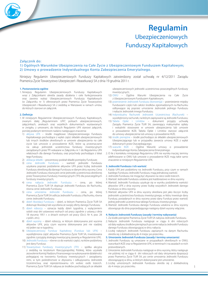 Regulamin Ubezpieczeniowych Funduszy Kapitałowych Załącznik do: 1) O gólnych Warunków Ubezpieczenia na Całe Życie z Ubezpieczeniowym Funduszem Kapitałowym; 2) U mowy o prowadzenie Indywidualnego Konta Zabezpieczenia Emerytalnego. Niniejszy Regulamin Ubezpieczeniowych Funduszy Kapitałowych zatwierdzony został uchwałą nr 4/12/2011 Zarządu Pramerica Życie Towarzystwo Ubezpieczeń i Reasekuracji SA z dnia 19 grudnia 2011 r. 1. Postanowienia ogólne 1. Niniejszy Regulamin Ubezpieczeniowych Funduszy Kapitałowych wraz z Załącznikami określa zasady działania i cele funkcjonowania oraz zawiera wykaz Ubezpieczeniowych Funduszy Kapitałowych (w Załączniku nr 1) oferowanych przez Pramerica Życie Towarzystwo Ubezpieczeń i Reasekuracji SA z siedzibą w Warszawie w ramach umów, do których stanowi on załącznik. 2. Definicje 1. W niniejszym Regulaminie Ubezpieczeniowych Funduszy Kapitałowych, zwanym dalej „Regulaminem UFK”, polisach ubezpieczeniowych, załącznikach, aneksach oraz wszelkich dokumentach wystawianych w związku z umowami, do których Regulamin UFK stanowi załącznik, poniżej podanym terminom nadano następujące znaczenia: 1) aktywa UFK – środki majątkowe Ubezpieczeniowego Funduszu Kapitałowego pochodzące z wpłat części składek ubezpieczeniowych lub innych środków określonych w umowie ubezpieczenia na całe życie lub umowie o prowadzenie IKZE, które są przeznaczane na zakup jednostek uczestnictwa funduszy inwestycyjnych zarządzanych przez TFI wskazane w Załączniku nr 1 do Regulaminu UFK właściwych dla danego Funduszu, oraz przychody pochodzące z lokat tego Funduszu; 2) alokacja składki – procentowy podział składki pomiędzy Fundusze; 3) cena Jednostki Funduszu – wartość jednostki Funduszu uzyskana poprzez podzielenie aktywów UFK przez liczbę Jednostek Funduszu określoną dla danego Funduszu w danym dniu wyceny. Cena Jednostki Funduszu równa jest cenie jednostki uczestnictwa określonej przez Towarzystwo Funduszy Inwestycyjnych (TFI) dla poszczególnych funduszy inwestycyjnych; 4) cena nabycia Jednostki Funduszu – cena, po której Pramerica Życie TUiR SA dopisuje Jednostki Funduszu do Rachunku, równa cenie Jednostki Funduszu; 5) cena umorzenia Jednostki Funduszu – cena, po której Pramerica Życie TUiR SA odlicza Jednostki Funduszu z Rachunku, równa cenie Jednostki Funduszu; 6) dzień likwidacji Funduszu – dzień, w którym Pramerica Życie TUiR SA dokonuje likwidacji lub wycofania ze swojej oferty danego Funduszu; 7) dzień roboczy – oznacza każdy dzień tygodnia, z wyłączeniem sobót oraz dni ustawowo wolnych od pracy zgodnie z ustawą z dnia 18 stycznia 1951 r. o dniach wolnych od pracy (Dz.U. Nr 4, poz. 28 z późn. zm.); 8) dzień wyceny – dzień roboczy, w którym dokonywana jest wycena aktywów UFK, przy czym wycena dokonywana jest nie rzadziej niż jeden raz w tygodniu; 9) Ubezpieczeniowy Fundusz Kapitałowy (Fundusz lub UFK) – wyodrębniona część aktywów Pramerica Życie TUiR SA, inwestowana zgodnie z przyjętą strategią inwestycyjną zawartą w Regulaminie UFK; 10) Jednostki Funduszu – równe co do wartości części, na które podzielony jest dany Fundusz; 11) Towarzystwo Funduszy Inwestycyjnych (TFI) – spółka akcyjna z siedzibą na terytorium Rzeczypospolitej Polskiej, która uzyskała zezwolenie Komisji Nadzoru Finansowego na wykonywanie działalności polegającej na tworzeniu funduszy inwestycyjnych i zarządzaniu nimi, w tym pośrednictwie w zbywaniu i odkupywaniu Jednostek Uczestnictwa, oraz reprezentowaniu ich wobec osób trzecich. Pramerica Życie TUiR SA nabywa ze środków pochodzących ze składek ubezpieczeniowych jednostki uczestnictwa poszczególnych funduszy inwestycyjnych; 12) OWU – Ogólne Warunki Ubezpieczenia na Całe Życie z Ubezpieczeniowym Funduszem Kapitałowym; 13) przeniesienie Jednostek Funduszu (konwersja) – przeniesienie między Funduszami części lub całości środków zgromadzonych na Rachunku odbywające się poprzez umorzenie Jednostek jednego Funduszu i nabycie Jednostek innego Funduszu; 14) Indywidualny Rachunek Jednostek Uczestnictwa (Rachunek) – wyodrębniony rachunek, na którym zapisywane są Jednostki Funduszu; 15) Tabela Opłat i Limitów – dokument przyjęty uchwałą Zarządu Pramerica Życie TUiR SA, zawierający maksymalne opłaty i wskaźniki stosowane w umowie ubezpieczenia lub umowie o prowadzenie IKZE; Tabela Opłat i Limitów stanowi załącznik do umowy ubezpieczenia lub umowy o prowadzenie IKZE; 16) środki pieniężne – środki pochodzące ze składek ubezpieczeniowych Ubezpieczającego lub w przypadku zawarcia umowy IKZE z wpłat dokonanych przez Oszczędzającego; 17) warunki IKZE – Ogólne Warunki umowy o prowadzenie Indywidualnego Konta Zabezpieczenia Emerytalnego. 2. O ile z kontekstu niniejszego Regulaminu UFK nie wynika inaczej, terminy zdefiniowane w OWU lub umowie o prowadzenie IKZE mają takie samo znaczenie w niniejszym Regulaminie UFK. 3. Jednostki Funduszu i ich wartość 1. Każdy UFK jest podzielony na Jednostki Funduszu, przy czym w ramach każdego Funduszu Jednostki Funduszu mają jednakową wartość. 2. Jednostki Funduszu nie mogą być zbywane na rzecz osób trzecich. 3. Wartość Jednostki Funduszu ustalana jest każdorazowo w dniu wyceny. 4. Wartość Jednostki Funduszu uzyskuje się w wyniku podzielenia wartości aktywów UFK z dnia wyceny przez liczbę wszystkich Jednostek danego Funduszu w dniu wyceny. 5. Wartość aktywów UFK w dniu wyceny określana jest jako iloczyn liczby jednostek uczestnictwa funduszu inwestycyjnego, w który inwestuje dany Fundusz, posiadanych w dniu wyceny przez dany Fundusz przez wartość jednej jednostki uczestnictwa takiego funduszu inwestycyjnego. 6. Wartość Jednostki Funduszu danego Funduszu ustalona w dniu wyceny obowiązuje do dnia poprzedzającego następny dzień wyceny włącznie. 4. Nabycie Jednostek Funduszu (zasady i terminy nabywania) 1. Za środki p