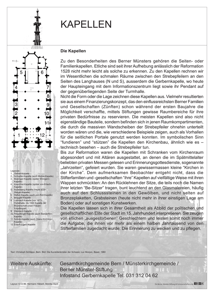 KAPELLEN Die Kapellen Legende: 1. Gerbernkapelle 2. Schopfer-Kapelle (auch Michel-Kapelle) 3. Bulzinger-Kapelle (später MetzgernKapelle) 4. Krauchtal-Kapelle (später von-ErlachKapelle) 5. Bubenberg-Kapelle (heute auch Steiger-Kapelle) 6. Matter-Kapelle (auch von-Roll-Kapelle) 7. Brüggler-Kapelle 8. Lombach-Kapelle (vor 1473 Portalhalle, bis 1500 Kapelle der Bruderschaft unser Frauen Empfängnis) 9. Diesbach-Kapelle 10. Ringoltinger-Kapelle (auch BonstettenKapelle) 11. Schütz-Kapelle (auch Obere-KirchthürKapelle) 12. Erlach-Ligerz-Kapelle Zu den Besonderheiten des Berner Münsters gehören die Seiten- oder Familienkapellen. Etliche sind seit ihrer Aufhebung anlässlich der Reformation 1528 nicht mehr leicht als solche zu erkennen. Zu den Kapellen rechnen wir im Wesentlichen die schmalen Räume zwischen den Strebepfeilern an den Seiten des Langhauses (N und S), ausserdem die Gerbernkapelle, wo heute der Haupteingang mit dem Informationszentrum liegt sowie ihr Pendant auf der gegenüberliegenden Seite der Turmhalle. Nicht die Form oder die Lage zeichnen diese Kapellen aus. Vielmehr resultierten sie aus einem Finanzierungskonzept, das den einflussreichsten Berner Familien und Gesellschaften (Zünften) schon während der ersten Baujahre die Möglichkeit verschaffte, mittels Stiftungen gewisse Raumbereiche für ihre privaten Bedürfnisse zu reservieren. Die meisten Kapellen sind also nicht eigenständige Bauteile, sondern befinden sich in jenen Raumkompartimenten, die durch die massiven Wandscheiben der Strebepfeiler ohnehin unterteilt worden wären und die, wie verschiedene Beispiele zeigen, auch als Vorhallen für die seitlichen Portale genutzt werden konnten. Im symbolischen Sinn “fundieren” und “stützen” die Kapellen den Kirchenbau, ähnlich wie es – technisch besehen – auch die Strebepfeiler tun. Bis zur Reformation waren die Kapellen mit Schranken vom Kirchenraum abgesondert und mit Altären ausgestattet, an denen die im Spätmittelalter beliebten privaten Messen gelesen und Erinnerungsgottesdienste, sogenannte „Jahrzeiten“, gefeiert wurden. Sie waren gewissermassen kleine “Kirchen in der Kirche”. Dem aufmerksamen Beobachter entgeht nicht, dass die Stifterfamilien und -gesellschaften “ihre” Kapellen auf vielfältige Weise mit ihren Wappen schmückten: An den Rücklehnen der Sitze, die teils noch die Namen ihrer letzten “Be-Sitzer” tragen, bunt leuchtend an den Glasmalereien, häufig auch auf den Schlusssteinen in den Gewölben, und nicht selten auf Bronzeplaketten, Grabsteinen (heute nicht mehr in ihrer einstigen Lage am Boden) oder auf sonstigen Kunstwerken. Die Kapellen lassen sich in ihrer Gesamtheit als Abbild der politischen und gesellschaftlichen Elite der Stadt im 15. Jahrhundert interpretieren. Sie zeugen von etlichen „ausgestorbenen“ Geschlechtern und leisten somit noch immer die Aufgabe, die ihnen vor mehr als einem halben Jahrtausend von den Stifterfamilien zugedacht wurde: Die Erinnerung zu wecken und zu pflegen. Text: Christoph Schläppi, Bern; Bild: Die Kunstdenkmäler der Schweiz, Luc Monjon, Basel, 1960 Weitere Auskünfte: Layout: 6.12.99, Hermann Häberli, Monika Marti Gesamtkirchgemeinde Bern / Münsterkirchgemeinde / Berner Münster-Stiftung Infostand Gerbernkapelle Tel. 031 312 04 62