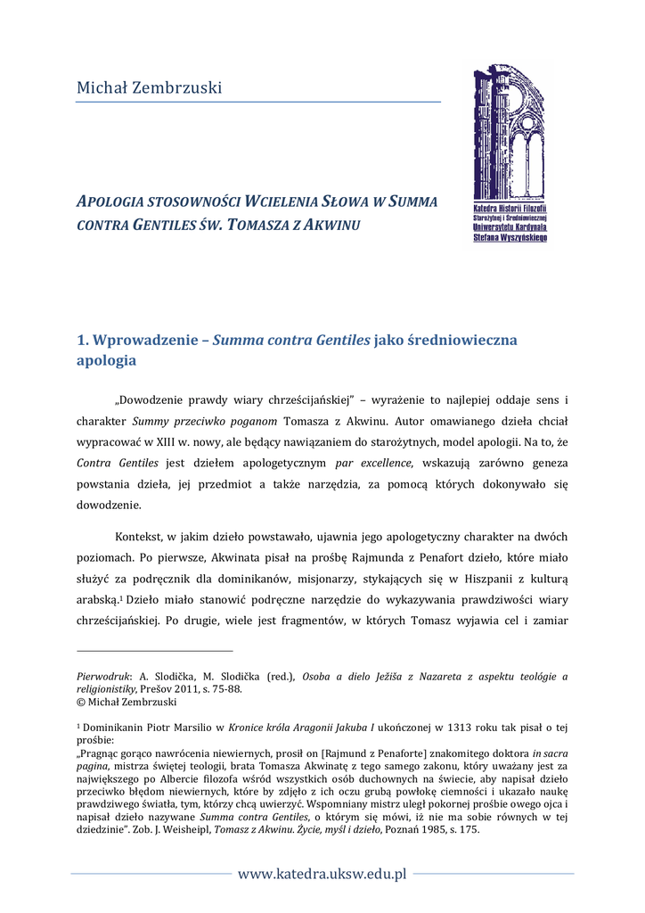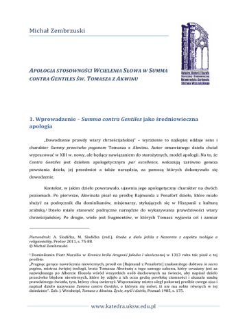 Michał Zembrzuski APOLOGIA STOSOWNOŚCI WCIELENIA SŁOWA W SUMMA CONTRA GENTILES ŚW. TOMASZA Z AKWINU 1. Wprowadzenie – Summa contra Gentiles jako średniowieczna apologia „Dowodzenie prawdy wiary chrześcijańskiej” – wyrażenie to najlepiej oddaje sens i charakter Summy przeciwko poganom Tomasza z Akwinu. Autor omawianego dzieła chciał wypracować w XIII w. nowy, ale będący nawiązaniem do starożytnych, model apologii. Na to, że Contra Gentiles jest dziełem apologetycznym par excellence, wskazują zarówno geneza powstania dzieła, jej przedmiot a także narzędzia, za pomocą których dokonywało się dowodzenie. Kontekst, w jakim dzieło powstawało, ujawnia jego apologetyczny charakter na dwóch poziomach. Po pierwsze, Akwinata pisał na prośbę Rajmunda z Penafort dzieło, które miało służyć za podręcznik dla dominikanów, misjonarzy, stykających się w Hiszpanii z kulturą arabską.1 Dzieło miało stanowić podręczne narzędzie do wykazywania prawdziwości wiary chrześcijańskiej. Po drugie, wiele jest fragmentów, w których Tomasz wyjawia cel i zamiar Pierwodruk: A. Slodička, M. Slodička (red.), Osoba a dielo Ježiša z Nazareta z aspektu teológie a religionistiky, Prešov 2011, s. 75-88. © Michał Zembrzuski 1 Dominikanin Piotr Marsilio w Kronice króla Aragonii Jakuba I ukończonej w 1313 roku tak pisał o tej prośbie: „Pragnąc gorąco nawrócenia niewiernych, prosił on [Rajmund z Penaforte] znakomitego doktora in sacra pagina, mistrza świętej teologii, brata Tomasza Akwinatę z tego samego zakonu, który uważany jest za największego po Albercie filozofa wśród wszystkich osób duchownych na świecie, aby napisał dzieło przeciwko błędom niewiernych, które by zdjęło z ich oczu grubą powłokę ciemności i ukazało naukę prawdziwego światła, tym, którzy chcą uwierzyć. Wspomniany mistrz uległ pokornej prośbie owego ojca i napisał dzieło nazywane Summa contra Gentiles, o którym się mówi, iż nie ma sobie równych w tej dziedzinie”. Zob. J. Weisheipl, Tomasz z Akwinu. Życie, myśl i dzieło, Poznań 1985, s. 175. www.katedra.uksw.edu.pl 2 pisania traktatu. Intencja autora ujawnia się zaraz w drugim rozdziale Summy filozoficznej: „odważywszy się zatem, ufni w Dobroć Bożą, wziąć na siebie obowiązki mędrca, chociaż przekraczają one nasze siły, zamierzamy na miarę naszych możliwości ukazać prawdę, którą wyznaje wiara katolicka, usuwając przeciwne błędy”.2 Akwinata nie tylko więc chciał bronić, ale również wykazywać (manifestare) prawdziwość wiary. Analiza przeciwników, wobec których staje „milczący wół”, również wskazuje, że dzieło to jest średniowieczną apologią. Tomasz nie chce dyskutować tylko z muzułmanami, Żydami czy heretykami z łona katolicyzmu.3 Pragnie podjąć dyskusję z wszystkimi błądzącymi (errantes), których w XIII w. również nie brakowało na paryskim uniwersytecie. Byli nimi wszyscy ci, którzy podejmowali się rozumienia świata według tradycji greckiej, przesiąkniętej elementami filozofii arabskiej. Jest więc to dzieło wyrazem „sporu o rozumienie świata” z tymi, którzy nie bali się w imię rozumu zaprzeczać artykułom wiary. Niewierni tym artykułom stanęli przeciw Tomaszowi właśnie jako adwersarze.4 Apologetyczny charakter „Summy filozoficznej” w pierwszym rzędzie wyraża się przez sapiencjalną naturę poszukiwań. Zadanie bowiem mędrca jest podwójne: rozważać (meditari) i przekazywać (disserere) prawdę o pierwszej zasadzie i „zwalczać fałsz jej przeciwny”.5 Będąc syntetycznym wykładem na początku „przedsionków wiary”, które dopiero prowadzą do jej artykułów, Contra Gentiles staje się jednocześnie syntezą fides et ratio, dzięki czemu przez wiele stuleci (aż do nowożytności) jest wzorowym wykładem apologetyki.6 W stosunku do starożytności również nie zmienił się przedmiot apologii. Nadal pozostało nim istnienie Boga, Jego istota, a także główna prawda wiary o tym, że Bóg stał się człowiekiem. Zmienił się natomiast sposób wykładni tych zagadnień. Zmienił się, ponieważ Akwinata w swoim dowodzeniu używa sposobu argumentowania zaczerpniętego z nowo 2 Summa contra Gentiles I, 2. Por. B. Sesboüé, Historia dogmatów. Słowo Zbawienie, t. IV, Kraków 2003, s. 109. Zdaniem tego autora trzy rodzaje adwersarzy Tomasza - poganie, a więc również i „spadkobiercy poganizmu intelektualnego starożytności”, oraz heretycy i Żydzi mieli stanowić wyraz powrotu do trzech rodzajów adwersarzy starożytnych apologii. 4 Warto zwrócić uwagę, że Obok znanego bowiem Summa contra Gentiles pojawia się w manuskryptach inny tytuł: Liber de veritate catholicae fidei contra errores infidelium. W polskim drugim wydaniu dzieła Tomasza ten tytuł został przetłumaczony jako Prawda wiary chrześcijańskiej w dyskusji z poganami, innowiercami i błądzącymi. Tłumaczenie takie sugeruje, że nie ma różnicy pomiędzy innowiercami (posiadającymi inną wiarę), a niewierzącymi (tymi, którzy jej nie mają bądź nie są jej wierni). Zob. Tomasz z Akwinu, Summa contra Gentiles. Prawda wiary chrześcijańskiej, t. 1-3, tłum. Z. Włodek, W. Zega, Poznań 2003, 2007, 2009. 5 Summa contra Gentiles I, 1. „Unde sicut sapientis est veritatem praecipue de primo principio meditari et aliis disserere, ita eius falsitatem contrariam impugnare”. 6 Por. H. Seweryniak, Świadectwo i sens. Teologia fundamentalna, Płock 2001, s. 16-27. 3 www.katedra.uksw.edu.pl 3 odkrytej filozofii Arystotelesa. Używa argumentów, na które są w stanie zgodzić się jego adwersarze. Czerpie równocześnie z tradycji potwierdzając jej aktualność i niesprzeczność. Dowodzenie istnienia Boga zawarte w Summie przeciwko poganom ukazuje wielość przesłanek wyprowadzonych z prostego doświadczenia ruchu.7 Nie jest to ani jeden dowód, ani pięć dróg, lecz ogromna liczba argumentów wskazujących na Pierw