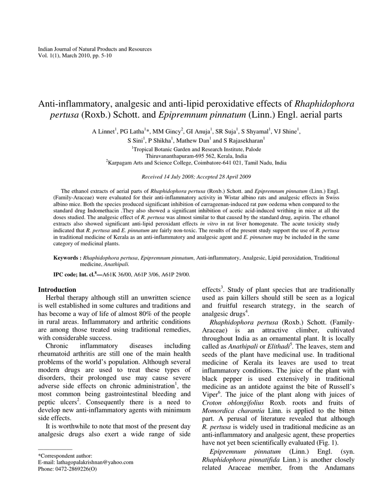 Indian Journal of Natural Products and Resources Vol. 1(1), March 2010, pp. 5-10 Anti-inflammatory, analgesic and anti-lipid peroxidative effects of Rhaphidophora pertusa (Roxb.) Schott. and Epipremnum pinnatum (Linn.) Engl. aerial parts A Linnet1, PG Latha1*, MM Gincy2, GI Anuja1, SR Suja1, S Shyamal1, VJ Shine1, S Sini1, P Shikha1, Mathew Dan1 and S Rajasekharan1 1 Tropical Botanic Garden and Research Institute, Palode Thiruvananthapuram-695 562, Kerala, India 2 Karpagam Arts and Science College, Coimbatore-641 021, Tamil Nadu, India Received 14 July 2008; Accepted 28 April 2009 The ethanol extracts of aerial parts of Rhaphidophora pertusa (Roxb.) Schott. and Epipremnum pinnatum (Linn.) Engl. (Family-Araceae) were evaluated for their anti-inflammatory activity in Wistar albino rats and analgesic effects in Swiss albino mice. Both the species produced significant inhibition of carrageenan-induced rat paw oedema when compared to the standard drug Indomethacin .They also showed a significant inhibition of acetic acid-induced writhing in mice at all the doses studied. The analgesic effect of R. pertusa was almost similar to that caused by the standard drug, aspirin. The ethanol extracts also showed significant anti-lipid peroxidant effects in vitro in rat liver homogenate. The acute toxicity study indicated that R. pertusa and E. pinnatum are fairly non-toxic. The results of the present study support the use of R. pertusa in traditional medicine of Kerala as an anti-inflammatory and analgesic agent and E. pinnatum may be included in the same category of medicinal plants. Keywords : Rhaphidophora pertusa, Epipremnum pinnatum, Anti-inflammatory, Analgesic, Lipid peroxidation, Traditional medicine, Anathipali. IPC code; Int. cl.8—A61K 36/00, A61P 3/06, A61P 29/00. Introduction Herbal therapy although still an unwritten science is well established in some cultures and traditions and has become a way of life of almost 80% of the people in rural areas. Inflammatory and arthritic conditions are among those treated using traditional remedies, with considerable success. Chronic inflammatory diseases including rheumatoid arthritis are still one of the main health problems of the world’s population. Although several modern drugs are used to treat these types of disorders, their prolonged use may cause severe adverse side effects on chronic administration1, the most common being gastrointestinal bleeding and peptic ulcers2. Consequently there is a need to develop new anti-inflammatory agents with minimum side effects. It is worthwhile to note that most of the present day analgesic drugs also exert a wide range of side —————— *Correspondent author: E-mail: [email protected] Phone: 0472-2869226(O) effects3. Study of plant species that are traditionally used as pain killers should still be seen as a logical and fruitful research strategy, in the search of analgesic drugs4. Rhaphidophora pertusa (Roxb.) Schott. (FamilyAraceae) is an attractive climber, cultivated throughout India as an ornamental plant. It is locally called as Anathipali or Elithadi5. The leaves, stem and seeds of the plant have medicinal use. In traditional medicine of Kerala its leaves are used to treat inflammatory conditions. The juice of the plant with black pepper is used extensively in traditional medicine as an antidote against the bite of Russell’s Viper6. The juice of the plant along with juices of Croton oblongifolius Roxb. roots and fruits of Momordica charantia Linn. is applied to the bitten part. A perusal of literature revealed that although R. pertusa is widely used in traditional medicine as an anti-inflammatory and analgesic agent, these properties have not yet been scientifically evaluated (Fig. 1). Epipremnum pinnatum (Linn.) Engl. (syn. Rhaphidophora pinnatifida Linn.) is another closely related Araceae member, from the Andamans 6 INDIAN J NAT PROD RESOUR, MARCH 2010 collected by the scientists of the Institute during one of their plant exploration trips and established in the herbal garden of the Institute. Not much information is available about its medicinal use to treat inflammation and pain. It is likely that when bioactive compounds are found in one species, more species of the same genus may contain active compounds of a similar nature7. Prompted by this fact it was considered interesting to scientifically validate the anti-inflammatory and analgesic effects of E. pinnatum also. The present study was therefore, undertaken to evaluate and compare the antiinflammatory and analgesic properties of these two plants (Fig.2). Materials and Methods Plant materials The aerial parts of both the plants were collected from the herbal garden of the Institute during January, 2006.They were authenticated by Dr Mathew Dan, plant taxonomist of the Institute and voucher specimens were preserved for future reference in the Herbarium of the Institute (TBGT 57007 dtd 21/1/2006 and TBGT 57008 dtd 24/1/2006). Preparation of the plant extracts The aerial parts were washed thoroughly with tap water, shade-dried and powdered. The powder (60g) of each of the two plant species was successively extracted separately with ethanol (600ml) overnight, at room temperature with constant stirring. The extracts were filtered and the filtrates were concentrated at 30°C under reduced pressure in a rotary evaporator. The yield (w/w) of the crude extracts was found to be 16.5% for R. pertusa and 18% for E. pinnatum. The crude extracts were suspended in 0.5% Tween-80 to required concentrations and used for the experiments. R. pertusa extract was referred to as RP and E. pinnatum extract as EP. Experimental animals Fig. 1—Rhaphidophora pertusa Wistar albino male rats (175-220g) and Swiss albino mice (27-35g), were grouped and housed in polyacrylic cages (two animals per cage) and maintained under standard laboratory conditions (temperature 24-28°C, relative humidity 60-70% and 12h light dark cycles). They were fed commercial rat fee