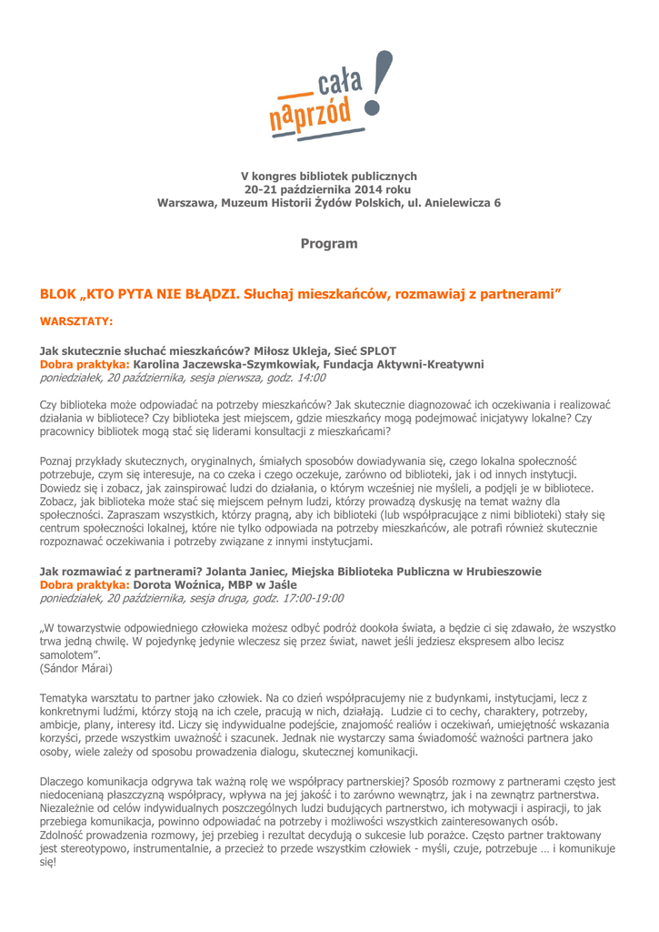 V kongres bibliotek publicznych 20-21 października 2014 roku Warszawa, Muzeum Historii Żydów Polskich, ul. Anielewicza 6 Program BLOK „KTO PYTA NIE BŁĄDZI. Słuchaj mieszkańców, rozmawiaj z partnerami” WARSZTATY: Jak skutecznie słuchać mieszkańców? Miłosz Ukleja, Sieć SPLOT Dobra praktyka: Karolina Jaczewska-Szymkowiak, Fundacja Aktywni-Kreatywni poniedziałek, 20 października, sesja pierwsza, godz. 14:00 Czy biblioteka może odpowiadać na potrzeby mieszkańców? Jak skutecznie diagnozować ich oczekiwania i realizować działania w bibliotece? Czy biblioteka jest miejscem, gdzie mieszkańcy mogą podejmować inicjatywy lokalne? Czy pracownicy bibliotek mogą stać się liderami konsultacji z mieszkańcami? Poznaj przykłady skutecznych, oryginalnych, śmiałych sposobów dowiadywania się, czego lokalna społeczność potrzebuje, czym się interesuje, na co czeka i czego oczekuje, zarówno od biblioteki, jak i od innych instytucji. Dowiedz się i zobacz, jak zainspirować ludzi do działania, o którym wcześniej nie myśleli, a podjęli je w bibliotece. Zobacz, jak biblioteka może stać się miejscem pełnym ludzi, którzy prowadzą dyskusję na temat ważny dla społeczności. Zapraszam wszystkich, którzy pragną, aby ich biblioteki (lub współpracujące z nimi biblioteki) stały się centrum społeczności lokalnej, które nie tylko odpowiada na potrzeby mieszkańców, ale potrafi również skutecznie rozpoznawać oczekiwania i potrzeby związane z innymi instytucjami. Jak rozmawiać z partnerami? Jolanta Janiec, Miejska Biblioteka Publiczna w Hrubieszowie Dobra praktyka: Dorota Woźnica, MBP w Jaśle poniedziałek, 20 października, sesja druga, godz. 17:00-19:00 „W towarzystwie odpowiedniego człowieka możesz odbyć podróż dookoła świata, a będzie ci się zdawało, że wszystko trwa jedną chwilę. W pojedynkę jedynie wleczesz się przez świat, nawet jeśli jedziesz ekspresem albo lecisz samolotem”. (Sándor Márai) Tematyka warsztatu to partner jako człowiek. Na co dzień współpracujemy nie z budynkami, instytucjami, lecz z konkretnymi ludźmi, którzy stoją na ich czele, pracują w nich, działają. Ludzie ci to cechy, charaktery, potrzeby, ambicje, plany, interesy itd. Liczy się indywidualne podejście, znajomość realiów i oczekiwań, umiejętność wskazania korzyści, przede wszystkim uważność i szacunek. Jednak nie wystarczy sama świadomość ważności partnera jako osoby, wiele zależy od sposobu prowadzenia dialogu, skutecznej komunikacji. Dlaczego komunikacja odgrywa tak ważną rolę we współpracy partnerskiej? Sposób rozmowy z partnerami często jest niedocenianą płaszczyzną współpracy, wpływa na jej jakość i to zarówno wewnątrz, jak i na zewnątrz partnerstwa. Niezależnie od celów indywidualnych poszczególnych ludzi budujących partnerstwo, ich motywacji i aspiracji, to jak przebiega komunikacja, powinno odpowiadać na potrzeby i możliwości wszystkich zainteresowanych osób. Zdolność prowadzenia rozmowy, jej przebieg i rezultat decydują o sukcesie lub porażce. Często partner traktowany jest stereotypowo, instrumentalnie, a przecież to przede wszystkim człowiek - myśli, czuje, potrzebuje … i komunikuje się! Pierwsze spotkanie z mieszkańcami, Staśka Retmaniak, Stowarzyszenie CAL, Szkoła Trenerów STOP, Dobra praktyka: Agnieszka Borkiewicz, Biblioteka Publiczna Miasta i Gminy Jarocin wtorek, 21 października, sesja trzecia, godz. 9:00-11:00 Prowadzenie spotkania można porównać do podróży - może być uciążliwa, trudna i mozolna, może też być inspirująca, rozwijająca i radosna. Od czego to zależy? Czy mam wpływ na to, jak moje spotkanie (podróż) będzie przebiegało? Tak, masz. W podróży, jak i w spotkaniu dobre przygotowanie pozwala uniknąć wielu pułapek, a potencjalne trudności pomaga przekłuć w inspirację. Spotkanie to nie szkoła, gdzie nauczyciel koncentruje się na przekazaniu danej wiedzy. W prowadzeniu spotkania trzeba sprawić, aby proces pracy osób uczestniczących był maksymalnie efektywny i zakończył się pełnym sukcesem, czyli osiągnięciem celów, jakie zostały ustalone na początku. Warto zatem z bliska przyjrzeć się kluczowym momentom spotkania, doświadczyć roli facylitatora (facylitatorki) w tych momentach – jak wspierać pracę grupy, zarządzać procesem, ułatwiać osiąganie wartościowych wyników dla wszystkich osób zaangażowanych w spotkanie. Tymi zagadnieniami będziemy zajmować się w czasie warsztatu. Wspólnie dzieląc się doświadczeniem bibliotekarek i bibliotekarzy, którzy już przeszli swoje „pierwsze spotkania”, ćwicząc poszczególne etapy spotkania – tak aby Wasza podróż w przyszłości była przyjemna i ekscytująca! BLOK „MYŚLENIE MA PRZYSZŁOŚĆ. Zaplanuj, wybieraj, decyduj” WARSZTATY: Konsultacje społeczne – czyli jak podejmować decyzję z mieszkańcami Jolanta Woźnicka, OPUS, Szkoła Trenerów STOP, Dobra praktyka: Wojciech Olchowski, MBP w Lublinie poniedziałek, 20 października, sesja pierwsza, godz. 14:00 Celem warsztatu jest zwrócenie uwagi na rolę biblioteki w angażowaniu mieszkanek i mieszkańców w procesy partycypacyjne: w konsultacje społeczne, współdecydowanie. Podczas warsztatu osoby uczestniczące dowiedzą się:   w jaki sposób włączać mieszkańców w działania partycypacyjne, jakimi metodami angażować mieszkańców w procesy konsultacji społecznych W drugiej części osoby uczestniczące będą mogły zaplanować własne działania włączające. Zrób sobie pomysł – w jaki sposób stworzyć uniwersalny i skuteczny pomysł na działanie animacyjne, Joanna Mikulska, TITę Dobra praktyka: Alicja Bryksy, BP Gminy Kwidzyń poniedziałek, 20 października, sesja druga, godz. 17:00-19:00 Tematem warsztatu są scenariusze skutecznych działań animacyjnych. Korzystając z działań opisanych w publikacji „Pomysły do zrobienia” Towarzystwa Inicjatyw Twórczych „ę