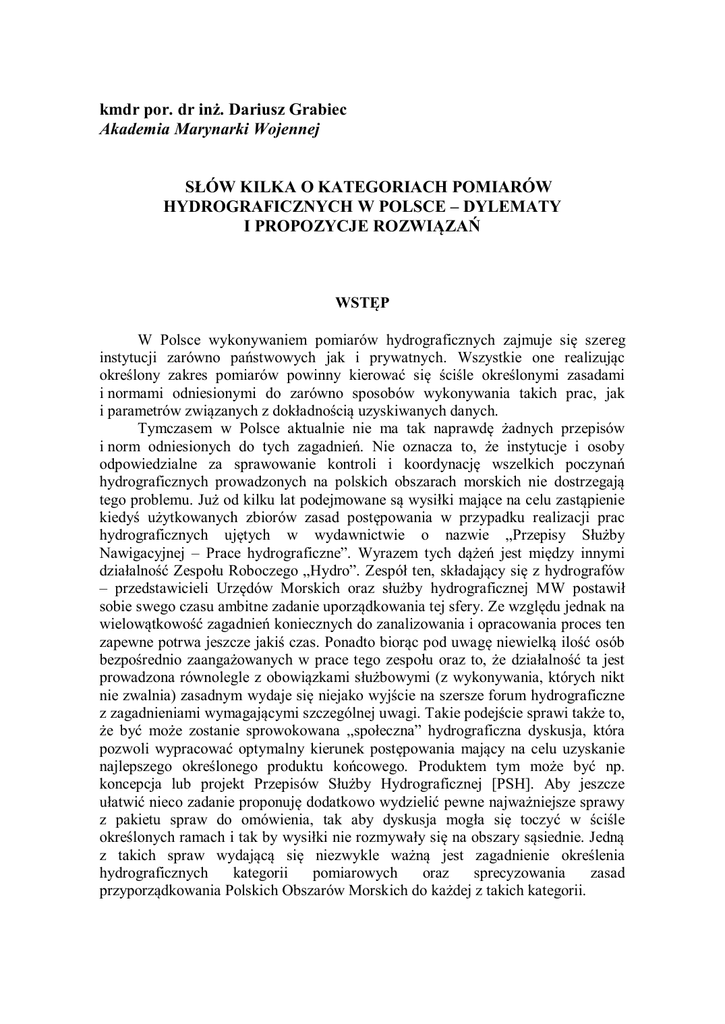 kmdr por. dr inż. Dariusz Grabiec Akademia Marynarki Wojennej SŁÓW KILKA O KATEGORIACH POMIARÓW HYDROGRAFICZNYCH W POLSCE – DYLEMATY I PROPOZYCJE ROZWIĄZAŃ WSTĘP W Polsce wykonywaniem pomiarów hydrograficznych zajmuje się szereg instytucji zarówno państwowych jak i prywatnych. Wszystkie one realizując określony zakres pomiarów powinny kierować się ściśle określonymi zasadami i normami odniesionymi do zarówno sposobów wykonywania takich prac, jak i parametrów związanych z dokładnością uzyskiwanych danych. Tymczasem w Polsce aktualnie nie ma tak naprawdę żadnych przepisów i norm odniesionych do tych zagadnień. Nie oznacza to, że instytucje i osoby odpowiedzialne za sprawowanie kontroli i koordynację wszelkich poczynań hydrograficznych prowadzonych na polskich obszarach morskich nie dostrzegają tego problemu. Już od kilku lat podejmowane są wysiłki mające na celu zastąpienie kiedyś użytkowanych zbiorów zasad postępowania w przypadku realizacji prac hydrograficznych ujętych w wydawnictwie o nazwie „Przepisy Służby Nawigacyjnej – Prace hydrograficzne”. Wyrazem tych dążeń jest między innymi działalność Zespołu Roboczego „Hydro”. Zespół ten, składający się z hydrografów – przedstawicieli Urzędów Morskich oraz służby hydrograficznej MW postawił sobie swego czasu ambitne zadanie uporządkowania tej sfery. Ze względu jednak na wielowątkowość zagadnień koniecznych do zanalizowania i opracowania proces ten zapewne potrwa jeszcze jakiś czas. Ponadto biorąc pod uwagę niewielką ilość osób bezpośrednio zaangażowanych w prace tego zespołu oraz to, że działalność ta jest prowadzona równolegle z obowiązkami służbowymi (z wykonywania, których nikt nie zwalnia) zasadnym wydaje się niejako wyjście na szersze forum hydrograficzne z zagadnieniami wymagającymi szczególnej uwagi. Takie podejście sprawi także to, że być może zostanie sprowokowana „społeczna” hydrograficzna dyskusja, która pozwoli wypracować optymalny kierunek postępowania mający na celu uzyskanie najlepszego określonego produktu końcowego. Produktem tym może być np. koncepcja lub projekt Przepisów Służby Hydrograficznej [PSH]. Aby jeszcze ułatwić nieco zadanie proponuję dodatkowo wydzielić pewne najważniejsze sprawy z pakietu spraw do omówienia, tak aby dyskusja mogła się toczyć w ściśle określonych ramach i tak by wysiłki nie rozmywały się na obszary sąsiednie. Jedną z takich spraw wydającą się niezwykle ważną jest zagadnienie określenia hydrograficznych kategorii pomiarowych oraz sprecyzowania zasad przyporządkowania Polskich Obszarów Morskich do każdej z takich kategorii. 1. STANDARD S-44 WERSJA 4.0 I DYLEMATY Z TYM ZWIĄZANE Jak już wspomniałem wcześniej aktualnie w Polsce nie ma żadnych przepisów formalno-prawnych określających rodzaje hydrograficznych kategorii pomiarowych oraz przypisujących im akweny morskie. Na razie, całkiem słusznie hydrografowie „umówili się”, że bazą jest opracowanie Międzynarodowej Organizacji Hydrograficznej IHO o nazwie „IHO Standards for Hydrographic Surveys” bardziej znane pod nazwą standardu S-44. Standard ten, a konkretnie jego obowiązująca wersja 4.0 z kwietnia 1998 r. definiuje 4 rodzaje kategorii pomiarowych powiązanych z rodzajami akwenów, dla których określono ściśle między innymi takie elementy jak dokładności wykonywania pomiarów batymetrycznych, możliwości detekcji obiektów podwodnych czy też odległości pomiędzy kolejnymi profilami pomiarowymi dla pomiarów batymetrycznych. Bez wdawania się w szczegóły – wyróżnia się 4 kategorie: specjalną, kategorię 1, kategorię 2 i trzecią (w języku angielskim - odpowiednio: Special Order, Order 1, Order 2, Order 3). W dość powszechnym rozumieniu kategorie te są utożsamiane z rodzajami akwenów, co wielokrotnie przejawia się w określeniach typu: pomiary wykonano zgodnie z wymaganiami przewidzianymi dla „akwenów kategorii specjalnej”. Nie jest to oczywiście wielkim błędem. Należy jednak tu pamiętać, że to rodzaj akwenu, a właściwie warunki środowiskowe, jakie panują w danym akwenie determinują konieczność uzyskiwania odpowiednich dokładności pomiarowych. Jeżeli już decydujemy się na uwzględnianie kategorii pomiarowych określonych przez S-44 (wersja 4.0 z 1998 r.) to pojawiają się pewne dylematy. Otóż standard ten nie jest doskonały. W zdecydowanej większości uwagi do tego standardu są związane albo z nieprecyzyjnym określeniem niektórych elementów, albo dotyczą one nieuwzględniania przez S-44 postępu technicznego, jaki dokonał się w ciągu ostatnich 5-6 lat. Doskonałymi przykładami mogą być tutaj dwie sprawy. Pierwsza z nich związana jest z opisem kategorii 1. Można tutaj mieć istotne wątpliwości, co do określenia mówiącego o niektórych akwenach przybrzeżnych z głębokościami do 100m4. Rodzi się tu natychmiast pytanie – czy Polskie Obszary Morskie z głębokościami do 100m to akweny, w których powinno się prowadzić pomiary hydrograficzne zaliczane do kategorii 1, czy 2. Czy istnieje graniczna wartość odległości od linii brzegowej, która dzieli akweny na obszary przybrzeżne i morskie? Ponadto, jest tam także mowa o akwenach przybrzeżnych z dużą intensywnością ruchu jednostek pływających (commercial trafic density – cyt., s.4). Takie sformułowanie wprowadza pewną niejednoznaczność, bowiem nie określono kryterium jednoznacznie precyzującego podział intensywności ruchu statków na duży i mały. Czy miałaby to być ilość jednostek przepływających przez dany akwen (o jakiej powierzchni?) w ciągu określonego przedziału czasu (godziny, doby?), z uwzględnieniem ruchu średniego czy przypadającego np. na godziny poranne? Inne dylematy mogą rodzić się w sytuacjach, w których dochodzi do wejścia w Polskie Obszary Morskie jednostek pływających zaliczanych do tzw. 