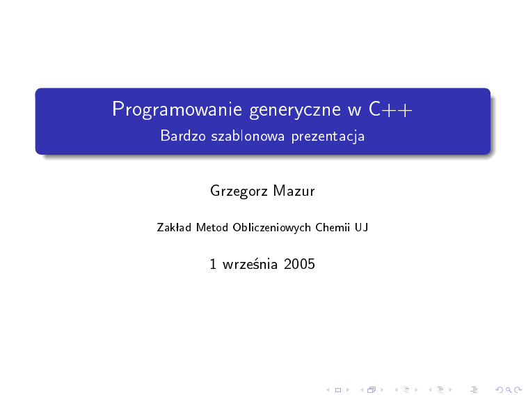 Programowanie generyczne w C++ Bardzo szablonowa prezentacja Grzegorz Mazur Zaklad Metod Obliczeniowych Chemii UJ 1 wrzesnia 2005 Plan Wstep , Szablony funkcji Szablony klas Metaprogramowanie Podsumowanie 1 Wstep , 2 Szablony funkcji 3 Szablony klas 4 Metaprogramowanie Co to jest? Przyklad Zastosowania 5 Podsumowanie Grzegorz Mazur Programowanie generyczne w C++ Plan Wstep , Szablony funkcji Szablony klas Metaprogramowanie Podsumowanie Slowniczek Programowanie generyczne Polega na mo_zliwosci deniowania abstrakcyjnych obiektow wyspecykowanych jedynie przez ich interfejsy i zachowania. Jezyk wspierajacy programowanie generyczne , , Pozwala na deniowanie typow ktore mo_zna wyspecjalizowac podajac im parametry ktore adaptuja, abstrakcyjne zachowanie dla , specycznej instancji. Grzegorz Mazur Programowanie generyczne w C++ Plan Wstep , Szablony funkcji Szablony klas Metaprogramowanie Podsumowanie Houston, mamy problem Potrzebujemy funkcji zwracajacej wieksz a, z dwoch liczb... , , Grzegorz Mazur Programowanie generyczne w C++ Plan Wstep , Szablony funkcji Szablony klas Metaprogramowanie Podsumowanie Houston, mamy problem Potrzebujemy funkcji zwracajacej wieksz a, z dwoch liczb... , , inline double return > max ( f g x y ? x double : x , double y) y ; Grzegorz Mazur Programowanie generyczne w C++ Plan Wstep , Szablony funkcji Szablony klas Metaprogramowanie Podsumowanie Houston, mamy problem Potrzebujemy funkcji zwracajacej wieksz a, z dwoch liczb... , , inline double return > max ( f g x y ? x double : x , double y) y ; Prawie dobrze... Grzegorz Mazur Programowanie generyczne w C++ Plan Wstep , Szablony funkcji Szablony klas Metaprogramowanie Podsumowanie Houston, mamy problem Potrzebujemy funkcji zwracajacej wieksz a, z dwoch liczb... , , inline double return > max ( f g x y ? x double : x , double y) y ; Prawie dobrze... ale to nie zadziala poprawnie dla innych typow Grzegorz Mazur Programowanie generyczne w C++ Plan Wstep , Szablony funkcji Szablony klas Metaprogramowanie Podsumowanie To mo_ze makro? Proste, prawda? #define max ( x , y) (( x) > Grzegorz Mazur (y) ? (x) : (y )) Programowanie generyczne w C++ Plan Wstep , Szablony funkcji Szablony klas Metaprogramowanie Podsumowanie To mo_ze makro? Proste, prawda? #define max ( x , y) (( x) > (y) ? (x) : (y )) Tylko co sie, stanie je_zeli napiszemy int int int i = 0 , j = 1; i = 0 , j = 1; k = max ( i , j ++); Grzegorz Mazur Programowanie generyczne w C++ Plan Wstep , Szablony funkcji Szablony klas Metaprogramowanie Podsumowanie To mo_ze makro? Proste, prawda? #define max ( x , y) (( x) > (y) ? (x) : (y )) Tylko co sie, stanie je_zeli napiszemy int int int i = 0 , j = 1; i = 0 , j = 1; k = max ( i , j ++); Oczywiscie k=2 Grzegorz Mazur Programowanie generyczne w C++ Plan Wstep , Szablony funkcji Szablony klas Metaprogramowanie Podsumowanie To mo_ze makro? Proste, prawda? #define max ( x , y) (( x) > (y) ? (x) : (y )) Tylko co sie, stanie je_zeli napiszemy int int int i = 0 , j = 1; i = 0 , j = 1; k = max ( i , j ++); Oczywiscie k=2 Nie jest to nie jedyny problem, wiec z makro odpada , Grzegorz Mazur Programowanie generyczne w C++ Plan Wstep , Szablony funkcji Szablony klas Metaprogramowanie Podsumowanie And the winner is... Prosze, Panstwa, oto szablon template <typename > inline f return > T T g max ( T x , x ? y T x y) : y ; Grzegorz Mazur Programowanie generyczne w C++ Plan Wstep , Szablony funkcji Szablony klas Metaprogramowanie Podsumowanie And the winner is... Prosze, Panstwa, oto szablon template <typename > inline f return > T T g max ( T x , x ? y T x y) : y ; a oto instancja szablonu int int int i = 0; j = 1; k = max ( i , j ++); Grzegorz Mazur Programowanie generyczne w C++ Plan Wstep , Szablony funkcji Szablony klas Metaprogramowanie Podsumowanie Przede wszystkim zrozumiec Szablon to... Szablon funkcji to przepis na funkcje, Instancja szablonu to funkcja Grzegorz Mazur Programowanie generyczne w C++ Plan Wstep , Szablony funkcji Szablony klas Metaprogramowanie Podsumowanie Przede wszystkim zrozumiec Szablon to... Szablon funkcji to przepis na funkcje, Instancja szablonu to funkcja Analogia Funkcja to przepis na wykonanie obliczen Wywolanie funkcji generuje wynik obliczen wykonanych wedlug podanego przepisu Grzegorz Mazur Programowanie generyczne w C++ Plan Wstep , Szablony funkcji Szablony klas Metaprogramowanie Podsumowanie Przede wszystkim zrozumiec Szablon to... Szablon funkcji to przepis na funkcje, Instancja szablonu to funkcja Analogia Funkcja to przepis na wykonanie obliczen Wywolanie funkcji generuje wynik obliczen wykonanych wedlug podanego przepisu Tylko z_ e... W przypadku szablonow wykonanie nastepuje w czasie , kompilacji Wynikiem oblicze n jest funkcja Grzegorz Mazur Programowanie generyczne w C++ Plan Wstep , Szablony funkcji Szablony klas Metaprogramowanie Podsumowanie Argumenty szablonu I Typy, oznaczane slowem kluczowym (w tym kontekscie to synonimy) typename lub class template <typename > T T max ( T x , T y) // . . . template < class > T T min (T x , T y) // . . . Stale typow integralnych, oznaczane odpowiednim typem template < int > double double N power ( x) Grzegorz Mazur // . . . Programowanie generyczne w C++ Plan Wstep , Szablony funkcji Szablony klas Metaprogramowanie Podsumowanie Argumenty szablonu II Oczywiscie argumentow mo_ze byc wiecej , template <typename typename > const const template < int typename > T, T dot product ( T p o w e r (T N, x) V V& , // V&) // . . . T . . . Argumenty moga, miec wartosci domyslne template <typename T blocked dot template <typename T2 c o s t a m ( T1 T, product ( x) // T1 , typename int const const typename int > V, BS V& , T2 = . . . Grzegorz Mazur = V&) Programowanie generyczne w C++ 32 // > . . . Plan Wstep , Szablony funkcji Szablony klas Metaprogramowanie Podsumowanie Instancje, parametry, o rany Parametry przy tworzeniu instancji moga, byc Jawnie wyspecykowane x2 = power < 2, double > (x ) ; Wziete ze specykacji wartosci domyslnych , Wydedukowane z kontekstu 