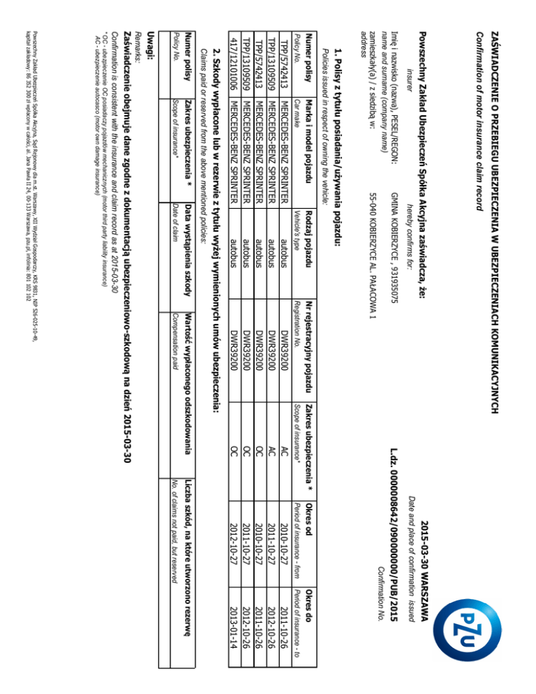 ZAŚWIADCZENIE O PRZEBIEGU UBEZPIECZENIA W UBEZPIECZENIACH KOMUNIKACYJNYCH Confirmation of motor insurance claim record insurer 55-040 KOBIERZYCE AL. PAŁACOWA 1 GMINA KOBIERZYCE , 931935075 hereby confirms for: Powszechny Zakład Ubezpieczeń Spółka Akcyjna zaświadcza, że: Imię i nazwisko (nazwa), PESEL/REGON: name and surname (company name) zamieszkały(a) / z siedzibą w: address 1. Polisy z tytułu posiadania/używania pojazdu: 2015-03-30 WARSZAWA Date and place of confirmation issued Rodzaj pojazdu Nr rejestracyjny pojazdu Zakres ubezpieczenia * Okres od Okres do Confirmation No. L.dz. 0000008642/090000000/PUB/2015 Marka i model pojazdu Period of insurance - to Policies issued in respect of owning the vehicle: Numer polisy Period of insurance - from Wartość wypłaconego odszkodowania No. of claims not paid, but reserved Liczba szkód, na które utworzono rezerwę 2011-10-26 2012-10-26 2011-10-26 2012-10-26 2013-01-14 Data wystąpienia szkody Compensation paid 2010-10-27 2011-10-27 2010-10-27 2011-10-27 2012-10-27 Zakres ubezpieczenia * Date of claim AC AC OC OC OC Scope of insurance* DWR39200 DWR39200 DWR39200 DWR39200 DWR39200 Registration No. autobus autobus autobus autobus autobus Vehicle's type SPRINTER SPRINTER SPRINTER SPRINTER SPRINTER Car make MERCEDES-BENZ MERCEDES-BENZ MERCEDES-BENZ MERCEDES-BENZ MERCEDES-BENZ Policy No. TPP/5742413 TPP/13109509 TPP/5742413 TPP/13109509 417/12101006 2. Szkody wypłacone lub w rezerwie z tytułu wyżej wymienionych umów ubezpieczenia: Numer polisy Scope of insurance* Claims paid or reserved from the above mentioned policies: Policy No. Uwagi: Remarks: Zaświadczenie obejmuje dane zgodne z dokumentacją ubezpieczeniowo-szkodową na dzień 2015-03-30 Confirmation is consistent with the insurance and claim record as at 2015-03-30 * OC - ubezpieczenie OC posiadaczy pojazdów mechanicznych (motor third party liability insurance) AC - ubezpieczenie autocasco (motor own damage insurance) Powszechny Zakład Ubezpieczeń Spółka Akcyjna, Sąd Rejonowy dla m.st. Warszawy, XII Wydział Gospodarczy, KRS 9831, NIP 526-025-10-49, kapitał zakładowy: 86 352 300 zł wpłacony w całości, al. Jana Pawła II 24, 00-133 Warszawa, pzu.pl, infolinia: 801 102 102 Powszechny Zakład Ubezpieczeń Spółka Akcyjna, Sąd Rejonowy dla m.st. Warszawy, XII Wydział Gospodarczy, KRS 9831, NIP 526-025-10-49, kapitał zakładowy: 86 352 300 zł wpłacony w całości, al. Jana Pawła II 24, 00-133 Warszawa, pzu.pl, infolinia: 801 102 102 p.o. Dyrektor Centrum Klienta Mirena Masłowska Pieczęć i podpis osoby wystawiającej zaświadczenie Stamp and signature of confirmation drawer