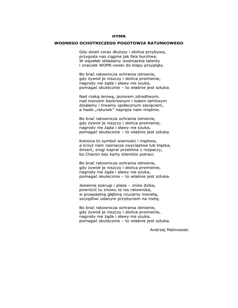 HYMN WODNEGO OCHOTNICZEGO POGOTOWIA RATUNKOWEGO Gdy dzień coraz dłuższy i słońca przybywa, przygoda nas ciągnie jak fala burzliwa. W węzełek składamy wodniackie talenty i znaczek WOPR-owski do klapy przypięty. Bo brać ratownicza ochrania istnienie, gdy żywioł je niszczy i słońca promienie, nagrody nie żąda i sławy nie szuka, pomagać skutecznie – to właśnie jest sztuka. Nad rzeką leniwą, jeziorem zdradliwym, nad morzem bezkresnym i lodem łamliwym działamy i trwamy społecznym zacięciem, a hasło „ratunek” napręża nam mięśnie. Bo brać ratownicza ochrania istnienie, gdy żywioł je niszczy i słońca promienie, nagrody nie żąda i sławy nie szuka, pomagać skutecznie – to właśnie jest sztuka. Kotwica to symbol wierności i męstwa, a krzyż nam naznacza zwycięstwa lub klęska, śmierć, srogi kapral przeklina z rozpaczy, bo Charon bez karty klientów potraci. Bo brać ratownicza ochrania istnienie, gdy żywioł je niszczy i słońca promienie, nagrody nie żąda i sławy nie szuka, pomagać skutecznie – to właśnie jest sztuka. Jesienne szarugi i plaża – znów dzika, powrócić tu znowu to los ratownika, w przepastną głębinę rzucamy monetę, szczęśliwi udanym przybyciem na metę. Bo brać ratownicza ochrania istnienie, gdy żywioł je niszczy i słońca promienie, nagrody nie żąda i sławy nie szuka, pomagać skutecznie – to właśnie jest sztuka. Andrzej Malinowski