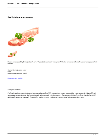Mi?so : Pol?dwica wieprzowa Pol?dwica wieprzowa Podana cena sprzeda?y Brutto jest cen? za 0.7 Kg produktu i jest cen? maksymaln?. Finalna cena sprzeda?y mo?e ulec zmianie po zwa?eniu produktu. Ocena: Nie ma jeszcze oceny Cena Cena sprzeda?y brutto: 4,90 € Zadaj pytanie o produkt Szczegó?y produktu Pol?dwica wieprzowa jest uwa?ana za najlepsz? cz??? tuszy wieprzowej o szerokim zastosowaniu. Najcz??ciej wykorzystywana jest do da? sma?onych, pieczonych lub duszonych. Ponadto pol?dwic? mo?na równie? w?dzi?, peklowa? oraz marynowa?. Powstaj? z niej soczyste, delikatne i smaczne w?dliny oraz pieczenie. 1 / 1 Powered by TCPDF (www.tcpdf.org)