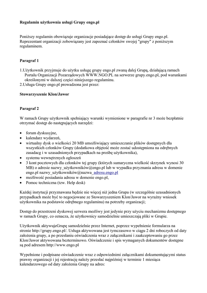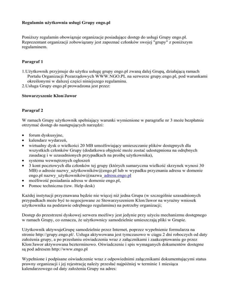 Regulamin użytkownia usługi Grupy engo.pl Poniższy regulamin obowiązuje organizacje posiadające dostęp do usługi Grupy engo.pl. Reprezentant organizacji zobowiązany jest zapoznać członków swojej "grupy" z poniższym regulaminem. Paragraf 1 1.Użytkownik przyjmuje do użytku usługę grupy engo.pl zwaną dalej Grupą, działającą ramach Portalu Organizacji Pozarządowych WWW.NGO.PL na serwerze grupy.engo.pl, pod warunkami określonymi w dalszej części niniejszego regulaminu. 2.Usługa Grupy engo.pl prowadzona jest przez: Stowarzyszenie Klon/Jawor Paragraf 2 W ramach Grupy użytkownik spełniający warunki wymienione w paragrafie nr 3 może bezpłatnie otrzymać dostęp do następujących narzędzi: • • • • • • • forum dyskusyjne, kalendarz wydarzeń, wirtualny dysk o wielkości 20 MB umożliwiający umieszczanie plików dostępnych dla wszystkich członków Grupy (dodatkowa objętość może zostać udostępniona na odrębnych zasadacg i w uzasadnionych przypadkach na prośbę użytkownika), systemu wewnętrznych ogłoszeń 3 kont pocztowych dla członków tej grupy (których sumaryczna wielkość skrzynek wynosi 30 MB) o adresie nazwy_użytkownikó[email protected] lub w wypadku przyznania adresu w domenie engo.pl nazwy_użytkowników@nazwa_adresu.engo.pl możliwość posiadania adresu w domenie engo.pl, Pomoc techniczna (tzw. Help desk) Każdej instytucji przyznawana będzie nie więcej niż jedna Grupa (w szczególnie uzasadnionych przypadkach może być to negocjowane ze Stowarzyszeniem Klon/Jawor na wyrażny wniosek użytkownika na podstawie odrębnego regulaminu) na potrzeby organizacji; Dostęp do przestrzeni dyskowej serwera możliwy jest jedynie przy użyciu mechanizmu dostępnego w ramach Grupy, co oznacza, że użytkownicy samodzielnie umieszczają pliki w Grupie. Użytkownik aktywujeGrupę samodzielnie przez Internet, poprzez wypełnienie formularza na stronie http://grupy.engo.pl/. Usługa aktywowana jest tymczasowo w ciągu 2 dni roboczych od daty założenia grupy, a po przesłaniu oświadczenia wraz z załącznikami i zaakceptowaniu go przez Klon/Jawor aktywowana bezterminowo. Oświadczenie i spis wymaganych dokumentów dostępne są pod adresem http://www.engo.pl Wypełnione i podpisane oświadczenie wraz z odpowiednimi załącznikami dokumentującymi status prawny organizacji i jej rejestrację należy przesłać najpóźniej w terminie 1 miesiąca kalendarzowego od daty założenia Grupy na adres: Stowarzyszenie Klon/Jawor ul. Szpitalna 5 (III p.) 00-031 Warszawa z dopiskiem "Grupy engo.pl" Jeśli użytkownik nie prześle oświadczenia w terminie, bądź przesłana dokumentacja będzie niekompletna (np. bez odpowiednich załączników), grupa zostanie usunięta. Z serwera usuwane są Grupy, nie spełniające ustalonych w regulaminie zasad. W trakcie użytkowania Grupy użytkownik powinien zapewniać samodzielnie kopię bezpieczeństwa (backup) własnych danych. W serwisie Portalu Organizacji Pozarządowych, "Nowe Technologie" (http://technologie.ngo.pl) dostępne są podręczniki pomocne w korzystaniu z programów Internetowych oraz lista zawierająca odnośniki do podstawowego zestawu oprogramowania koniecznego do uruchomienia dostępu do Internetu, a także instrukcja opisująca sposób instalacji i konfiguracji. W razie jakichkolwiek wątpliwości prosimy o kontakt z Pomocą techniczną (help-deskiem). Helpdesk prowadzony poprzez e-maile: [email protected] w dni robocze w godzinach 9:00 - 16:00. W pozostałe dni dla użytkowników dostępna jest automatyczna sekretarka. Paragraf 3 Zasady kwalifikowania użytkowników 1.Grupa służy projektom związanym z: działalnością statutową wymienioną w art. 17 ust. 1 pkt.4 ustawy o podatku dochodowym od osób prawnych (ale inną aniżeli wymienioną w pkt. 2 i 3), realizowaną przez podmioty przeznaczające swoje zyski na cele statutowe, 2. Przez instytucje realizujące wspomniane projekty rozumie się: 1.2 Instytucje non profit (Są nimi: zarejestrowane czy w KRS koniecznie? organizacje pozarządowe non profit, czyli takie które przeznaczają swoje zyski na cele statutowe), 2.2.W ramach tej usługi nie przewiduje się zakładania grup dla potrzeb użytkowników indywidualnych ; Uwaga: w odniesieniu do wszystkich podmiotów zasadą jest, że nie mogą one korzystać z przedsięwzięcia dla celów prowadzonej przez siebie działalności gospodarczej; 1. Każdy użytkownik Grupy powinien samodzielnie zapewnić sobie kontakt z siecią Internet; to nie jest zasada kwalifikowania; może oddzielny paragraf czego Klon nie będzie robił i za co nie bierze odpowiedzialności (dostęp do Internetu, backup, zabezpieczenie danych przed włamaniem itd.) 2.Użytkownik Grupy przyjmuje na siebie całkowitą odpowiedzialność za treści umieszczane w Grupie oraz za wszelkie działania inicjowane przy użyciu lub za pośrednictwem zasobów Grupy. Użytkownik bierze odpowiedzialność za członków grupy do: 1. używania udostępnionych zasobów Grupy do celów związanych jedynie z działalnością odpowiadającą regułom wymienionym w paragrafie 3, 2. nie przekazywania otrzymanego identyfikatora oraz hasła weryfikującego używanie zasobów Grupy osobom nieupoważnionym, 3. nie wprowadzania żadnych zmian w treści plików należących do systemu engo.pl poza obrębem Grupy? Za wszelkie działania i zaniechania członków grupy odpowiedzialność cywilną wobec stron porozumienia ponosić będzie Użytkownik, bez względu na ewentualne ograniczenia jej roszczeń regresowych wobec członków grupy. Reguły obowizujące w usłudze grupy engo.pl Niedopuszczalne jest publikowanie materiałów niezgodnych z prawem i dobrym obyczajem,. W szczególności niedopuszczalne jest 1. Publikowanie materiałów: • wzywających do nienawiści rasowej, etnicznej, religijnej, • nawołujących do przemocy, • materiałów nieobyczajnych, a w szczególności materiałów i treści erotycznych i pornograficznych, • dan