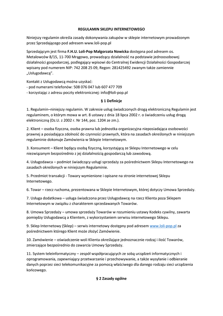 REGULAMIN SKLEPU INTERNETOWEGO Niniejszy regulamin określa zasady dokonywania zakupów w sklepie internetowym prowadzonym przez Sprzedającego pod adresem www.loli-pop.pl Sprzedającym jest firma F.H.U. Loli-Pop Małgorzata Nowicka dostępna pod adresem os. Metalowców 8/15, 11-700 Mrągowo, prowadzący działalność na podstawie jednoosobowej działalności gospodarczej, podlegający wpisowi do Centralnej Ewidencji Działalności Gospodarczej wpisany pod numerem NIP: 742 208 25 09, Regon: 281425492 zwanym także zamiennie „Usługodawcą”. Kontakt z Usługodawcą można uzyskać: - pod numerami telefonów: 508 076 047 lub 607 477 709 - korzystając z adresu poczty elektronicznej: [email protected] § 1 Definicje 1. Regulamin–niniejszy regulamin. W zakresie usług świadczonych drogą elektroniczną Regulamin jest regulaminem, o którym mowa w art. 8 ustawy z dnia 18 lipca 2002 r. o świadczeniu usług drogą elektroniczną (Dz.U. z 2002 r. Nr 144, poz. 1204 ze zm.). 2. Klient – osoba fizyczna, osoba prawna lub jednostka organizacyjna nieposiadająca osobowości prawnej a posiadająca zdolność do czynności prawnych, która na zasadach określonych w niniejszym regulaminie dokonuje Zamówienia w Sklepie Internetowym. 3. Konsument – Klient będący osobą fizyczną, korzystającą ze Sklepu Internetowego w celu niezwiązanym bezpośrednio z jej działalnością gospodarczą lub zawodową. 4. Usługodawca – podmiot świadczący usługi sprzedaży za pośrednictwem Sklepu Internetowego na zasadach określonych w niniejszym Regulaminie. 5. Przedmiot transakcji - Towary wymienione i opisane na stronie internetowej Sklepu Internetowego. 6. Towar – rzecz ruchoma, prezentowana w Sklepie Internetowym, której dotyczy Umowa Sprzedaży. 7. Usługa dodatkowa – usługa świadczona przez Usługodawcę na rzecz Klienta poza Sklepem Internetowym w związku z charakterem sprzedawanych Towarów. 8. Umowa Sprzedaży – umowa sprzedaży Towarów w rozumieniu ustawy Kodeks cywilny, zawarta pomiędzy Usługodawcą a Klientem, z wykorzystaniem serwisu internetowego Sklepu. 9. Sklep Internetowy (Sklep) – serwis internetowy dostępny pod adresem www.loli-pop.pl za pośrednictwem którego Klient może złożyć Zamówienie. 10. Zamówienie – oświadczenie woli Klienta określające jednoznacznie rodzaj i ilość Towarów, zmierzające bezpośrednio do zawarcia Umowy Sprzedaży. 11. System teleinformatyczny – zespół współpracujących ze sobą urządzeń informatycznych i oprogramowania, zapewniający przetwarzanie i przechowywanie, a także wysyłanie i odbieranie danych poprzez sieci telekomunikacyjne za pomocą właściwego dla danego rodzaju sieci urządzenia końcowego. § 2 Zasady ogólne 1. Niniejszy Regulamin określa zasady korzystania ze sklepu internetowego dostępnego pod adresem www.loli-pop.pl 2. Warunkiem złożenia Zamówienia w Sklepie Internetowym przez Klienta jest zapoznanie się z niniejszym Regulaminem i akceptacja jego postanowień w czasie realizacji Zamówienia. 3. Sklep internetowy www.loli-pop.pl prowadzi sprzedaż detaliczną za pośrednictwem sieci Internet. 4. Wszystkie Towary oferowane w sklepie www.loli-pop.pl są fabrycznie nowe, oryginalnie zapakowane, wolne od wad fizycznych i prawnych, oraz zostały legalnie wprowadzone na rynek polski. § 3 Składanie zamówień 1. Wszystkie ceny podane na stronach internetowych www.loli-pop.pl są cenami brutto podanymi w złotych polskich. Podane ceny nie obejmują kosztów wysyłki. 2. Zamówienia są przyjmowane przez stronę internetową/telefonicznie/drogą mailową. 3. Zamówienia składane poprzez stronę internetową można składać 24 godziny na dobę, 7 dni w tygodniu przez cały rok. 4. Zamówienie jest skuteczne, jeśli Klient prawidłowo wypełni formularz zamówienia i prawidłowo poda dane kontaktowe w tym dokładny adres, na który Towar ma być wysłany oraz numer telefonu i adres e-mail. 5. W wypadku gdy podane dane nie są kompletne, Sprzedający skontaktuje się z Klientem. Jeśli kontakt z Klientem nie będzie możliwy, Sprzedający ma prawo do anulowania Zamówienia. 6. Klient w procesie składania zamówienia może wyrazić wolę otrzymania paragonu fiskalnego lub faktury VAT, która może zostać załączona do wysyłanej przesyłki lub przesłana drogą elektroniczną, na wskazany adres e-mail w postaci elektronicznego obrazu dokumentów rozliczeniowych, w szczególności takich jak: faktury VAT z załącznikami, faktury VAT korygujące z załącznikami i formularzy. Niniejsza zgoda uprawnia Sprzedającego również do wystawiania i przesyłania faktur VAT w formie elektronicznej, zgodnie z rozporządzeniem Ministra Finansów z dnia 20 grudnia 2012 r. w sprawie przesyłania faktur w formie elektronicznej, zasad ich przechowywania oraz trybu udostępniania organowi podatkowemu lub organowi kontroli skarbowej. 7. W trakcie składania Zamówienia, Klient może wyrazić zgodę na umieszczenie danych osobowych w bazie danych Sklepu Internetowego Sprzedającego w celu ich przetwarzania w związku z realizacją Zamówienia. W wypadku udzielenia zgody, Klient ma prawo do wglądu w swoje dane, ich poprawiania oraz żądania ich usunięcia. 8. Klient może skorzystać z opcji zapamiętania jego danych przez system w celu ułatwienia procesu składania kolejnego Zamówienia. W tym celu Klient powinien podać login i hasło, niezbędne do uzyskania dostępu do swojego konta. Login Klienta to podany przez niego adres e-mail. Hasło jest ciągiem znaków ustalanych przez Klienta. Hasło Klienta nie jest znane Sprzedającemu i Klient ma obowiązek zachowania go w tajemnicy i chronienia przed niepowołanym dostępem osób trzecich. 9. Po złożeniu przez Klienta skutecznego zamówienia, otrzyma on automatyczną odpowiedź ze sklepu potwierdzającą otrzymanie zamówienia. 10. Czas rozpoczęcia realizacji zamówienia pokrywa się z momentem wpływu wpłaty na rachunek bankowy podany w potwierdzeniu zamówi