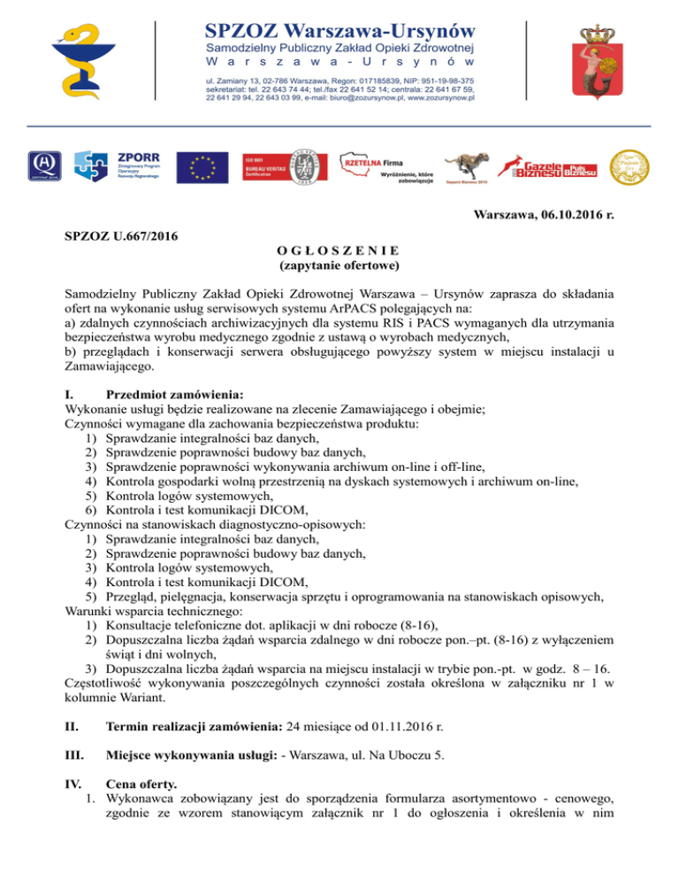 Warszawa, 06.10.2016 r. SPZOZ U.667/2016 OGŁOSZENIE (zapytanie ofertowe) Samodzielny Publiczny Zakład Opieki Zdrowotnej Warszawa – Ursynów zaprasza do składania ofert na wykonanie usług serwisowych systemu ArPACS polegających na: a) zdalnych czynnościach archiwizacyjnych dla systemu RIS i PACS wymaganych dla utrzymania bezpieczeństwa wyrobu medycznego zgodnie z ustawą o wyrobach medycznych, b) przeglądach i konserwacji serwera obsługującego powyższy system w miejscu instalacji u Zamawiającego. I. Przedmiot zamówienia: Wykonanie usługi będzie realizowane na zlecenie Zamawiającego i obejmie; Czynności wymagane dla zachowania bezpieczeństwa produktu: 1) Sprawdzanie integralności baz danych, 2) Sprawdzenie poprawności budowy baz danych, 3) Sprawdzenie poprawności wykonywania archiwum on-line i off-line, 4) Kontrola gospodarki wolną przestrzenią na dyskach systemowych i archiwum on-line, 5) Kontrola logów systemowych, 6) Kontrola i test komunikacji DICOM, Czynności na stanowiskach diagnostyczno-opisowych: 1) Sprawdzanie integralności baz danych, 2) Sprawdzenie poprawności budowy baz danych, 3) Kontrola logów systemowych, 4) Kontrola i test komunikacji DICOM, 5) Przegląd, pielęgnacja, konserwacja sprzętu i oprogramowania na stanowiskach opisowych, Warunki wsparcia technicznego: 1) Konsultacje telefoniczne dot. aplikacji w dni robocze (8-16), 2) Dopuszczalna liczba żądań wsparcia zdalnego w dni robocze pon.–pt. (8-16) z wyłączeniem świąt i dni wolnych, 3) Dopuszczalna liczba żądań wsparcia na miejscu instalacji w trybie pon.-pt. w godz. 8 – 16. Częstotliwość wykonywania poszczególnych czynności została określona w załączniku nr 1 w kolumnie Wariant. II. Termin realizacji zamówienia: 24 miesiące od 01.11.2016 r. III. Miejsce wykonywania usługi: - Warszawa, ul. Na Uboczu 5. IV. Cena oferty. 1. Wykonawca zobowiązany jest do sporządzenia formularza asortymentowo - cenowego, zgodnie ze wzorem stanowiącym załącznik nr 1 do ogłoszenia i określenia w nim abonamentu miesięcznego stanowiącego cenę oferty, o której mowa w pkt I ogłoszenia. 2. Ostateczna cena oferty winna być wyrażona w złotych polskich i zaokrąglona do dwóch miejsc po przecinku. Przy obliczaniu wartości brutto należy stosować zasadę obliczania wartości sprzedaży brutto zgodnie ze wzorem: 3. cena jednostkowa netto x ilość = wartość netto + podatek VAT = wartość brutto V. Wybór oferty najkorzystniejszej. 1. Przy wyborze oferty najkorzystniejszej Zamawiający będzie się kierował następującymi kryteriami: - kryterium CENA – waga 100, maksymalna ilość punktów 100; 2. W odniesieniu do kryterium CENA, przez „cenę” rozumie się całkowitą cenę badanej oferty o której mowa w pkt. IV niniejszego ogłoszenia. Oferta proponująca cenę najniższą w danym pakiecie otrzyma w kryterium CENA maksymalną liczbę punktów. Oferty proponujące ceny wyższe otrzymają proporcjonalnie mniej punktów. 3. Kryterium CENA będzie obliczane według następującego wzoru: cena najniższa x waga kryterium cena badana = uzyskana ilość punktów 4. Zamawiający udzieli zamówienia Wykonawcy, który złożył najkorzystniejszą ofertę w rozumieniu art. 2 pkt 5 ustawy PZP, tj. ofertę, której na podstawie kryteriów oceny ofert przyjętych w ogłoszeniu przyznano najwyższą sumę punktów spośród ofert nie podlegających odrzuceniu. 5. Zamawiający zawrze umowę w sprawie zamówienia publicznego o treści zgodnej z załączonym wzorem umowy – załącznik nr 2. VI. Składanie ofert. 1. Zainteresowanych prosimy o kontakt: z p. Jackiem Kozerskim nr tel. 22 641-67-59 wew. 45, w godzinach 10.00 – 14.00. 2. Oferty należy składać w terminie do dnia 24.10.2016r., do godziny 11.00 w następujący sposób: a. osobiście w siedzibie Zamawiającego, tj. 02-786 Warszawa, ul. Zamiany 13, pokój nr1 sekretariat Dyrektora b. fax na numer 22 641-52-14 c. poczta elektroniczna: [email protected]