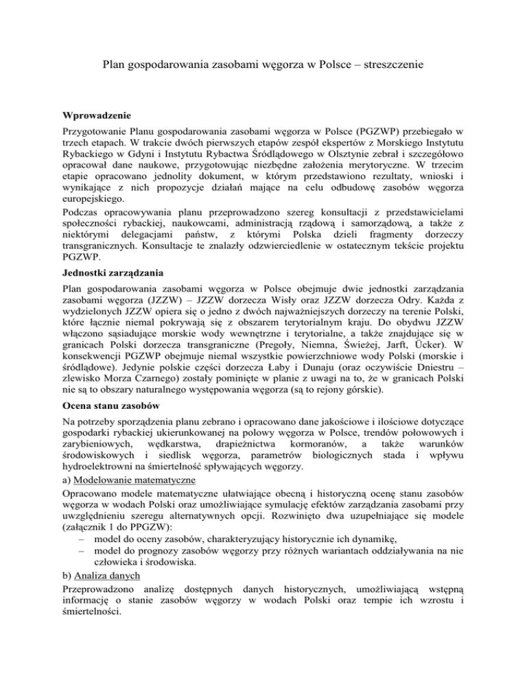 Plan gospodarowania zasobami wĊJRU]D w Polsce ± streszczenie Wprowadzenie 3U]\JRWRZDQLH3ODQXJRVSRGDURZDQLD]DVREDPLZĊJRU]DZ3ROVFH3*=:3SU]HELHJDáRZ WU]HFKHWDSDFK:WUDNFLHGZyFKSLHUZV]\FKHWDSyZ]HVSyáHNVSHUWyZ]0RUVNLHJR,QVW\WXWX RybackiHJRZ*G\QLL ,QVW\WXWX5\EDFWZDĝUyGOąGRZHJRZ2OV]W\QLH]HEUDáLV]F]HJyáRZR RSUDFRZDá GDQH QDXNRZH SU]\JRWRZXMąF QLH]EĊGQH ]DáRĪHQLD PHU\WRU\F]QH : WU]HFLP HWDSLH RSUDFRZDQR MHGQROLW\ GRNXPHQW Z NWyU\P SU]HGVWDZLRQR UH]XOWDW\ ZQLRVNL L Z\QLNDMąFH ] QLFK SURSR]\FMH G]LDáDĔ PDMąFH QD FHOX RGEXGRZĊ ]DVREyZ ZĊJRU]D europejskiego. Podczas opracowywania planu przeprowadzono szereg konsultacji z przedstawicielami VSRáHF]QRĞFL U\EDFNLHM QDXNRZFDPL DGPLQLVWUDFMą U]ąGRZą L VDPRU]ąGRZą D WDNĪH ] QLHNWyU\PL GHOHJDFMDPL SDĔVWZ ] NWyU\PL 3ROVND G]LHOL IUDJPHQW\ GRU]HF]\ WUDQVJUDQLF]Q\FK .RQVXOWDFMH WH ]QDOD]á\ RG]ZLHUFLHGOHQLH Z RVWDWHF]Q\P WHNĞFLH projektu PGZWP. -HGQRVWNL]DU]ąG]DQLD 3ODQ JRVSRGDURZDQLD ]DVREDPL ZĊJRU]D Z 3ROVFH REHMPXMH GZLH MHGQRVWNL ]DU]ąG]DQLD ]DVREDPL ZĊJRU]D -==: ± JZZW dRU]HF]D :LVá\ RUD] -==: dRU]HF]D 2GU\ .DĪGD ] Z\G]LHORQ\FK-==:RSLHUDVLĊRMHGQR]GZyFKQDMZDĪQLHMV]\FKGRU]HF]\QDWHUHQLH3ROVNL NWyUH áąF]QLH QLHPDO SRNU\ZDMą VLĊ ] REV]DUHP WHU\WRULDOQ\P NUDMX 'R RE\GZX -==W ZáąF]RQR VąVLDGXMąFH PRUVNLH ZRG\ ZHZQĊWU]QH L WHU\WRULDOQH D WDNĪH ]QDMGXMąFH VLĊ Z JUDQLFDFK 3ROVNL GRU]HF]D WUDQVJUDQLF]QH 3UHJRá\ 1LHPQD ĝZLHĪHM -DUIW hFNHU : konsekwencji PGZWP obejmuje niemal wszystkie powierzchniowe wody Polski (morskie i ĞUyGOąGRZH -HG\QLH SROVNLH F]ĊĞFL GRU]HF]D àDE\ L Dunaju (oraz RF]\ZLĞFLH 'QLHVWUX ± ]OHZLVNR0RU]D&]DUQHJR]RVWDá\SRPLQLĊWHZSODQLH]XZDJLQDWRĪH w granicach Polski QLHVąWRREV]DU\QDWXUDOQHJRZ\VWĊSRZDQLDZĊJRU]DVąWRUHMRQ\JyUVNLH OcenDVWDQX]DVREyZ Na potrzeby VSRU]ąG]HQLD pODQX]HEUDQRLRSUDFRZDQRGDQHMDNRĞFLRZHLLORĞFLRZHGRW\F]ąFH gospodarki rybackiej XNLHUXQNRZDQHM QD SRORZ\ ZĊJRU]D w Polsce, WUHQGyZ SRáRZRZ\FK L ]DU\ELHQLRZ\FK ZĊGNDUVWZD GUDSLHĪQLFWZD NRUPRUDQyZ D WDNĪH waruQNyZ ĞURGRZLVNRZ\FK L VLHGOLVN ZĊJRU]D SDUDPHWUyZ ELRORJLF]Q\FK VWDGD L ZSá\ZX K\GURHOHNWURZQLQDĞPLHUWHOQRĞüVSá\ZDMąF\FKZĊJRU]\ a) Modelowanie matematyczne Opracowano modele matematyczne XáDWZLDMąFe REHFQą L KLVWRU\F]Qą RFHQĊ VWDQX ]DVREyZ ZĊJRU]a ZZRGDFK3ROVNLRUD]XPRĪOLZLDMąFH symulacjĊ HIHNWyZ]DU]ąG]DQLD]DVREDPLSU]\ XZ]JOĊGQLHQLX V]HUHJX DOWHUQDW\ZQ\FK RSFML 5R]ZLQLĊWR GZD X]XSHáQLDMąFH VLĊ PRGHOH ]DáąF]QLNGR33*=:: PRGHOGRRFHQ\]DVREyZFKDUDNWHU\]XMąF\KLVWRU\F]QLHLFKG\QDPLNĊ mRGHOGRSURJQR]\]DVREyZZĊJRU]\SU]\UyĪQ\FKZDULDQWDFKRGG]LDá\ZDQLDQDQLH F]áRZLHNDLĞURGRZLVND b) Analiza danych PU]HSURZDG]RQR DQDOL]Ċ GRVWĊSQ\FK GDQ\FK KLVWRU\F]Q\FK XPRĪOLZLDMąFą ZVWĊSQą LQIRUPDFMĊ R VWDQLH ]DVREyZ ZĊJRU]\ Z ZRGDFK 3ROVNL RUD] tempie ich wzrostu i ĞPLHUWHOQRĞFL 'RFHORZ\ ZVSyáF]\QQLN VSá\ZDQLD ZĊJRU]\ REOLF]DQR ]JRGQLH ] art. 2 ust. 5 pkt. a rR]SRU]ąG]HQLa Rady (WE) nr 1100/2007. =D X]XSHáQLHQLH VWDGD GR RNUHVX UHIHUHQF\MQHJR SU]\MĊWR ĞUHGQLZVNDĨQLNX]XSHáQLHQLD]ODWL. c) ĝPLHUWHOQRĞüÄK\GURWHFKQLF]QD´ Na podstawie zastosowanej PHWRG\ ]DáąF]QLN PPGZW) w\OLF]RQR ĪH ĞPLHUWHOQRĞü ZĊJRU]\ ]ZLą]DQD]LVWQLHMąFD]DEXGRZąK\GURHQHUJHW\F]Qą jest bardzo wysoka. W wodach ĞUyGOąGRZ\FK wynosi odpowiednio, w przypadku dorzecza :LVá\ ± 60%, natomiast w dorzeczu Odry ± 44%. =DNáDGDMąF EUDN SU]HV]NyG K\GURWHFKQLF]Q\FK QD ZHZQĊWU]Q\FK wodach morskich L XZ]JOĊGQLDMąF SURSRUFMH ]DVREyZ Z wodach morskich oraz w wodach ĞUyGOąGRZ\FK obliczono, ĪH ĞPLHUWHOQRĞü ZĊJRU]\ spowodowana przeszkodami K\GURWHFKQLF]Q\PL Z REX MHGQRVWNDFK ]DU]ąG]DQLD ]DVREDPL ZĊJRU]D NV]WDáWXMH VLĊ QD poziomie, dla JZZW dorzecza :LVá\± 44%, a dla JZZW dorzecza Odry ± 30%. d) SSá\Z ZĊJRU]\VUHEU]\VW\FK :DUWRĞFL ZROQHJR VSá\ZX ZĊJRU]\ VUHEU]\VW\FK w okresie referencyjnym RNUHĞORQD QD SRGVWDZLHGRNRQDQ\FKREOLF]HĔNV]WDáWXMHVLĊGODSRV]F]HJyOQ\FK-==:QDVWĊSXMąFR dla JZZWD :LVá\ ± 2 102 tys. sztuk, z czego 40% wynosi ± 841 tys. sztuk, dla JZZWD Odry ± 2 522 tys. sztuk, z czego 40% wynosi ± 1 009 tys. sztuk. LiczbĊ ZĊJRU]\RVWDWQLRVSá\ZDMąF\FKGRPRU]DODWD-2007) RFHQLDVLĊQDSR]LRPLH dla JZZWD :LVá\ ± W\VV]WXNSRWHQFMDOQLHVSá\ZDMąF\FK]F]HJRSU]HV]NRG\ hydrotechniczne pokonuje ok. 56%, tj. 208 tys. sztuk, dla JZZWD Odry ± W\VV]WXNSRWHQFMDOQLHVSá\ZDMąF\FK]F]HJRSU]HV]NRG\ hydrotechniczne pokonuje ok. 70%, tj. 216 tys. sztuk. Dla obu dorzeczy REHFQLHVSá\ZDMąFHZĊJRU]HVWDQRZLąRGGR25VSá\ZXGRFHORZHJR Prognozowanie dynamiki stada Wyniki oceny stanu zaVREyZ SRVáXĪ\á\ MDNR SXQNW Z\MĞFLD do prognoz dynamiki stad przy UyĪQ\FKRSFMDFKLQWHQV\ZQRĞFLHNVSORDWDFMLLZVSRPDJDQLDRGEXGRZ\ ]DVREyZQSSRSU]H] zarybianie). Prognozy prowadzono do roku 2090. a) 2SFMH]DU]ąG]DQLD]DVREDPL Wybrane do realizacji opcMHSU]HGVWDZLDMąVLĊQDVWĊSXMąFR GOD-==:':LVá\± UHGXNFMDĞPLHUWHOQRĞFLSRáRZRZHMRSRSUDZDGURĪQRĞFL tras migracji o 34 %, zarybianie 7 mln sztuk narybku szklistego rocznie (lub HNZLZDOHQWQHMLORĞFLQDU\ENXpodchowanego); dla JZZWD Odry ± redukFMDĞPLHUWHOQRĞFLSRáRZRZHMR SRSUDZDGURĪQRĞFL tras migracji o 29 %, zarybianie 6 mln sztuk narybku szklistego rocznie (lub HNZLZDOHQWQHMLORĞFLQDU\ENXSRGFKRZDQHJR). b) Ramy czasowe :GURĪHQLHSURSRQRZDQ\FKopcji pozwoli na oVLąJQLĊFLH celu (40 % wLHONRĞFL potencjalnego VSá\ZXz okresu referencyjnHJRZQDVWĊSXMąF\FKRNUHVDFK GOD-==:':LVá\± od 2066 r.; dla JZZWD Odry ± od 2048 r. ĝURGNLVáXĪąFHUHDOL]DFMLFHOX Zgodnie z Z\EUDQ\PL RSFMDPL ]DU]ąG]DQLD ]DVREDPL ZĊJRU]D UHGXNFMĊ ĞPLHUWHOQRĞFL SRáRZRZHMQDNáDGXSRáRZRZHJRRUD]RVLąJQLĊFLH]DNáDGDQHJRSR]LRPX]DU\ELHĔSODQXMHVLĊ ZGURĪ\üMXĪRGOXEU1DWRPLDVWwymagany poziom GURĪQRĞFLU]HNWUDVPLJUDFML GODZĊGUyZHN]VWĊSXMąF\FK SODQXMĊVLĊRVLąJQąü do roku 2019. a) 8GURĪQLDQLHV]ODNyZmigracji Plan przewiduje NRQLHF]QRĞü UHJLRQDOQHJR RUD] LQG\ZLGXDOQHJR SRGHMĞFLD GR NZHVWLL ]PQLHMV]HQLD ĞPLHUWHOQRĞFL ]ZLą]DQHM ] SU]HJURGDPL U]HF]Q\PL =DNáDGD VLĊ ĪH FDáNRZLWH EąGĨF]ĊĞFLRZHXGURĪQLHQLHPRĪHE\