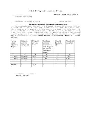 Świadectwo legalności pozyskania drewna ..................... pieczęć nagłówkowa Baranów, dnia 24.06.2012 r. Starostwo Powiatowe w Kępnie Gmina Baranów | Świadectwo legalności pozyskania drewna nr 5/2012 Na podstawie art. 14a ust. 1 i 3 ustawy z dnia 28 września 1991 r. o lasach (Dz. U. Nr 101, poz. 444, z 1992 r. Nr 21, poz. 85 i Nr 54, poz. 254, z 1994 r. Nr 1, poz. 3 i Nr 127, poz. 627, z 1995 r. Nr 147, poz. 713, z 1996 r. Nr 91, poz. 409 oraz z 1997 r. Nr 54, poz. 349, Nr 121, poz. 770 i Nr 160, poz. 1079) zaświadcza się, że wyszczególnione niżej drewno zostało pozyskane z lasu położonego we wsi Baranów na działce nr 555 oraz 536/26 stanowiących własność Gminy Baranów – UG Baranów, Rynek 21, 63-604 Baranów. Numer sztuki albo stosu drewna 1. 4447 4448 Razem: Długość drewna(w m) Wysokość stosu/szt 3. 19,98 3,51 Średnica drewna mierzona w 1/2 długości (w cm) lub szerokość stosu 4. 12,20 3,00 5. 1,20 1,20 6. 2,10 1,50 23,49 - - - Gatunek drewna, sortyment Objętość drewna w m3 2. So-S2b-1 So-S2b-1 - ...................... /podpis i pieczęć/
