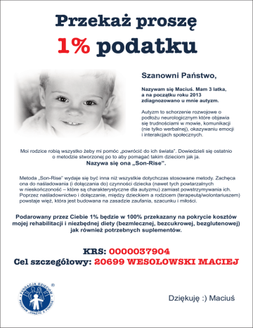 Przekaż proszę 1% podatku Szanowni Państwo, Nazywam się Maciuś. Mam 3 latka, a na początku roku 2013 zdiagnozowano u mnie autyzm. Autyzm to schorzenie rozwojowe o podłożu neurologicznym które objawia się trudnościami w mowie, komunikacji (nie tylko werbalnej), okazywaniu emocji i interakcjach społecznych. Moi rodzice robią wszystko żeby mi pomóc „powrócić do ich świata”. Dowiedzieli się ostatnio o metodzie stworzonej po to aby pomagać takim dzieciom jak ja. Nazywa się ona „Son-Rise”. Metoda „Son-Rise” wydaje się być inna niż wszystkie dotychczas stosowane metody. Zachęca ona do naśladowania (i dołączania do) czynności dziecka (nawet tych powtarzalnych w nieskończoność – które są charakterystyczne dla autyzmu) zamiast powstrzymywania ich. Poprzez naśladownictwo i dołączanie, między dzieckiem a rodzicem (terapeutą/wolontariuszem) powstaje więź, która jest budowana na zasadzie zaufania, szacunku i miłości. Podarowany przez Ciebie 1% będzie w 100% przekazany na pokrycie kosztów mojej rehabilitacji i niezbędnej diety (bezmlecznej, bezcukrowej, bezglutenowej) jak również potrzebnych suplementów. KRS: 0000037904 Cel szczegółowy: 20699 WESOŁOWSKI MACIEJ Dziękuję :) Maciuś