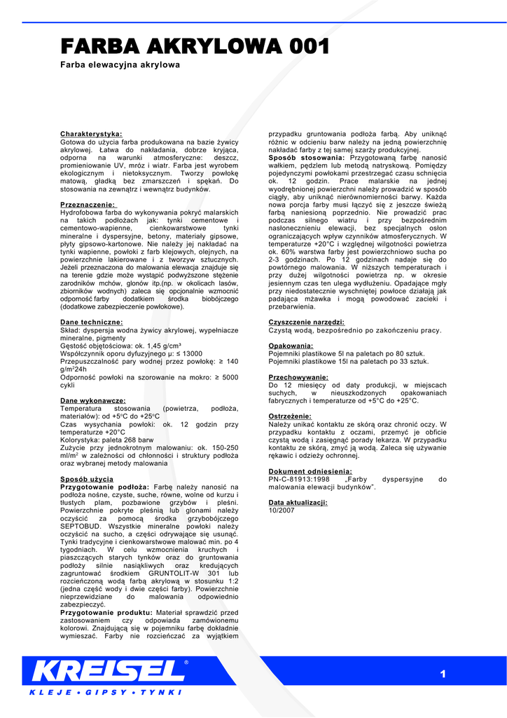 FARBA AKRYLOWA 001 Farba elewacyjna akrylowa Charakterystyka: Gotowa do użycia farba produkowana na bazie żywicy akrylowej. Łatwa do nakładania, dobrze kryjąca, odporna na warunki atmosferyczne: deszcz, promieniowanie UV, mróz i wiatr. Farba jest wyrobem ekologicznym i nietoksycznym. Tworzy powłokę matową, gładką bez zmarszczeń i spękań. Do stosowania na zewnątrz i wewnątrz budynków. Przeznaczenie: Hydrofobowa farba do wykonywania pokryć malarskich na takich podłożach jak: tynki cementowe i cementowo-wapienne, cienkowarstwowe tynki mineralne i dyspersyjne, betony, materiały gipsowe, płyty gipsowo-kartonowe. Nie należy jej nakładać na tynki wapienne, powłoki z farb klejowych, olejnych, na powierzchnie lakierowane i z tworzyw sztucznych. Jeżeli przeznaczona do malowania elewacja znajduje się na terenie gdzie może wystąpić podwyższone stężenie zarodników mchów, glonów itp.(np. w okolicach lasów, zbiorników wodnych) zaleca się opcjonalnie wzmocnić odporność farby dodatkiem środka biobójczego (dodatkowe zabezpieczenie powłokowe). Dane techniczne: Skład: dyspersja wodna żywicy akrylowej, wypełniacze mineralne, pigmenty Gęstość objętościowa: ok. 1,45 g/cm³ Współczynnik oporu dyfuzyjnego μ: ≤ 13000 Przepuszczalność pary wodnej przez powłokę: ≥ 140 g/m2 24h Odporność powłoki na szorowanie na mokro: ≥ 5000 cykli Dane wykonawcze: Temperatura stosowania (powietrza, podłoża, materiałów): od +5 o C do +25 o C Czas wysychania powłoki: ok. 12 godzin przy temperaturze +20°C Kolorystyka: paleta 268 barw Zużycie przy jednokrotnym malowaniu: ok. 150-250 ml/m2 w zależności od chłonności i struktury podłoża oraz wybranej metody malowania Sposób użycia Przygotowanie podłoża: Farbę należy nanosić na podłoża nośne, czyste, suche, równe, wolne od kurzu i tłustych plam, pozbawione grzybów i pleśni. Powierzchnie pokryte pleśnią lub glonami należy oczyścić za pomocą środka grzybobójczego SEPTOBUD. Wszystkie mineralne powłoki należy oczyścić na sucho, a części odrywające się usunąć. Tynki tradycyjne i cienkowarstwowe malować min. po 4 tygodniach. W celu wzmocnienia kruchych i piaszczących starych tynków oraz do gruntowania podłoży silnie nasiąkliwych oraz kredujących zagruntować środkiem GRUNTOLIT-W 301 lub rozcieńczoną wodą farbą akrylową w stosunku 1:2 (jedna część wody i dwie części farby). Powierzchnie nieprzewidziane do malowania odpowiednio zabezpieczyć. Przygotowanie produktu: Materiał sprawdzić przed zastosowaniem czy odpowiada zamówionemu kolorowi. Znajdującą się w pojemniku farbę dokładnie wymieszać. Farby nie rozcieńczać za wyjątkiem przypadku gruntowania podłoża farbą. Aby uniknąć różnic w odcieniu barw należy na jedną powierzchnię nakładać farby z tej samej szarży produkcyjnej. Sposób stosowania: Przygotowaną farbę nanosić wałkiem, pędzlem lub metodą natryskową. Pomiędzy pojedynczymi powłokami przestrzegać czasu schnięcia ok. 12 godzin. Prace malarskie na jednej wyodrębnionej powierzchni należy prowadzić w sposób ciągły, aby uniknąć nierównomierności barwy. Każda nowa porcja farby musi łączyć się z jeszcze świeżą farbą naniesioną poprzednio. Nie prowadzić prac podczas silnego wiatru i przy bezpośrednim nasłonecznieniu elewacji, bez specjalnych osłon ograniczających wpływ czynników atmosferycznych. W temperaturze +20°C i względnej wilgotności powietrza ok. 60% warstwa farby jest powierzchniowo sucha po 2-3 godzinach. Po 12 godzinach nadaje się do powtórnego malowania. W niższych temperaturach i przy dużej wilgotności powietrza np. w okresie jesiennym czas ten ulega wydłużeniu. Opadające mgły przy niedostatecznie wyschniętej powłoce działają jak padająca mżawka i mogą powodować zacieki i przebarwienia. Czyszczenie narzędzi: Czystą wodą, bezpośrednio po zakończeniu pracy. Opakowania: Pojemniki plastikowe 5l na paletach po 80 sztuk. Pojemniki plastikowe 15l na paletach po 33 sztuk. Przechowywanie: Do 12 miesięcy od daty produkcji, w miejscach suchych, w nieuszkodzonych opakowaniach fabrycznych i temperaturze od +5°C do +25°C. Ostrzeżenie: Należy unikać kontaktu ze skórą oraz chronić oczy. W przypadku kontaktu z oczami, przemyć je obficie czystą wodą i zasięgnąć porady lekarza. W przypadku kontaktu ze skórą, zmyć ją wodą. Zaleca się używanie rękawic i odzieży ochronnej. Dokument odniesienia: PN-C-81913:1998 „Farby dyspersyjne malowania elewacji budynków”. do Data aktualizacji: 10/2007 1
