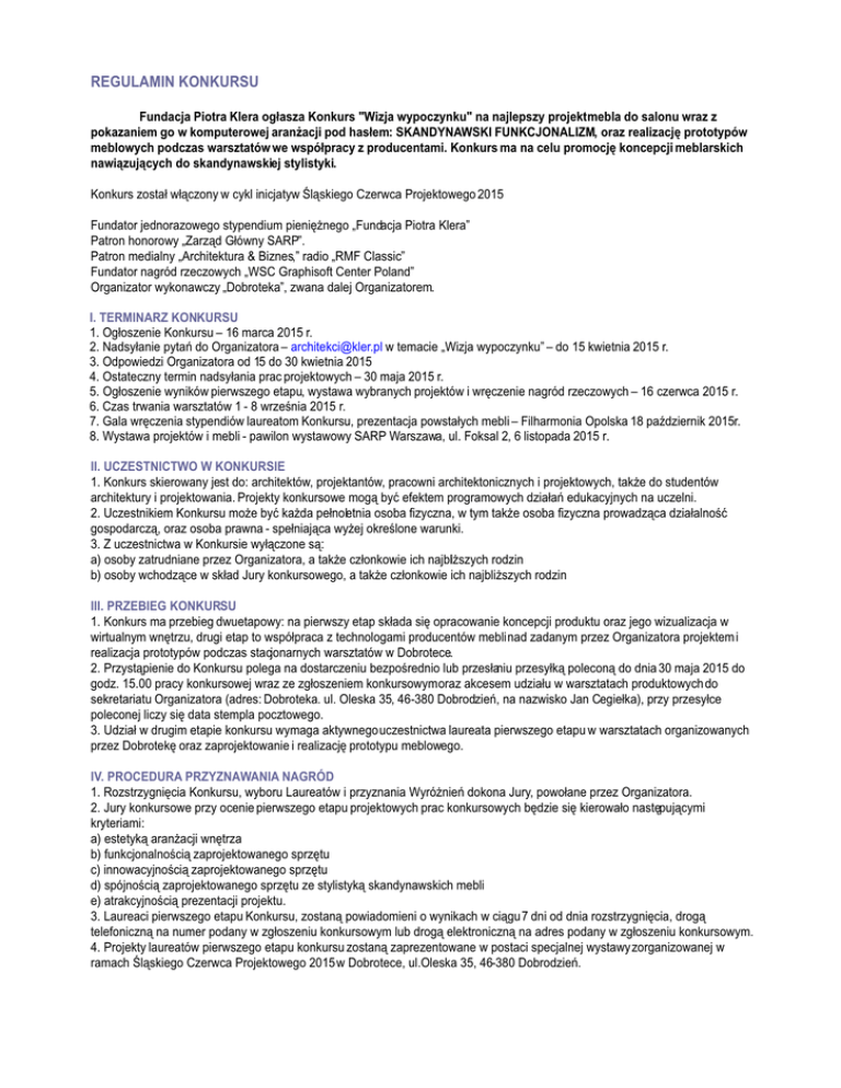 REGULAMIN KONKURSU Fundacja Piotra Klera ogłasza Konkurs "Wizja wypoczynku" na najlepszy projekt mebla do salonu wraz z pokazaniem go w komputerowej aranżacji pod hasłem: SKANDYNAWSKI FUNKCJONALIZM, oraz realizację prototypów meblowych podczas warsztatów we współpracy z producentami. Konkurs ma na celu promocję koncepcji meblarskich nawiązujących do skandynawskiej stylistyki. Konkurs został włączony w cykl inicjatyw Śląskiego Czerwca Projektowego 2015 Fundator jednorazowego stypendium pieniężnego „Fundacja Piotra Klera” Patron honorowy „Zarząd Główny SARP”. Patron medialny „Architektura & Biznes,” radio „RMF Classic” Fundator nagród rzeczowych „WSC Graphisoft Center Poland” Organizator wykonawczy „Dobroteka”, zwana dalej Organizatorem. I. TERMINARZ KONKURSU 1. Ogłoszenie Konkursu – 16 marca 2015 r. 2. Nadsyłanie pytań do Organizatora – [email protected] w temacie „Wizja wypoczynku” – do 15 kwietnia 2015 r. 3. Odpowiedzi Organizatora od 15 do 30 kwietnia 2015 4. Ostateczny termin nadsyłania prac projektowych – 30 maja 2015 r. 5. Ogłoszenie wyników pierwszego etapu, wystawa wybranych projektów i wręczenie nagród rzeczowych – 16 czerwca 2015 r. 6. Czas trwania warsztatów 1 - 8 września 2015 r. 7. Gala wręczenia stypendiów laureatom Konkursu, prezentacja powstałych mebli – Filharmonia Opolska 18 październik 2015r. 8. Wystawa projektów i mebli - pawilon wystawowy SARP Warszawa, ul. Foksal 2, 6 listopada 2015 r. II. UCZESTNICTWO W KONKURSIE 1. Konkurs skierowany jest do: architektów, projektantów, pracowni architektonicznych i projektowych, także do studentów architektury i projektowania. Projekty konkursowe mogą być efektem programowych działań edukacyjnych na uczelni. 2. Uczestnikiem Konkursu może być każda pełnoletnia osoba fizyczna, w tym także osoba fizyczna prowadząca działalność gospodarczą, oraz osoba prawna - spełniająca wyżej określone warunki. 3. Z uczestnictwa w Konkursie wyłączone są: a) osoby zatrudniane przez Organizatora, a także członkowie ich najbliższych rodzin b) osoby wchodzące w skład Jury konkursowego, a także członkowie ich najbliższych rodzin III. PRZEBIEG KONKURSU 1. Konkurs ma przebieg dwuetapowy: na pierwszy etap składa się opracowanie koncepcji produktu oraz jego wizualizacja w wirtualnym wnętrzu, drugi etap to współpraca z technologami producentów mebli nad zadanym przez Organizatora projektem i realizacja prototypów podczas stacjonarnych warsztatów w Dobrotece. 2. Przystąpienie do Konkursu polega na dostarczeniu bezpośrednio lub przesłaniu przesyłką poleconą do dnia 30 maja 2015 do godz. 15.00 pracy konkursowej wraz ze zgłoszeniem konkursowym oraz akcesem udziału w warsztatach produktowych do sekretariatu Organizatora (adres: Dobroteka. ul. Oleska 35, 46-380 Dobrodzień, na nazwisko Jan Cegiełka), przy przesyłce poleconej liczy się data stempla pocztowego. 3. Udział w drugim etapie konkursu wymaga aktywnego uczestnictwa laureata pierwszego etapu w warsztatach organizowanych przez Dobrotekę oraz zaprojektowanie i realizację prototypu meblowego. IV. PROCEDURA PRZYZNAWANIA NAGRÓD 1. Rozstrzygnięcia Konkursu, wyboru Laureatów i przyznania Wyróżnień dokona Jury, powołane przez Organizatora. 2. Jury konkursowe przy ocenie pierwszego etapu projektowych prac konkursowych będzie się kierowało następującymi kryteriami: a) estetyką aranżacji wnętrza b) funkcjonalnością zaprojektowanego sprzętu c) innowacyjnością zaprojektowanego sprzętu d) spójnością zaprojektowanego sprzętu ze stylistyką skandynawskich mebli e) atrakcyjnością prezentacji projektu. 3. Laureaci pierwszego etapu Konkursu, zostaną powiadomieni o wynikach w ciągu 7 dni od dnia rozstrzygnięcia, drogą telefoniczną na numer podany w zgłoszeniu konkursowym lub drogą elektroniczną na adres podany w zgłoszeniu konkursowym. 4. Projekty laureatów pierwszego etapu konkursu zostaną zaprezentowane w postaci specjalnej wystawy zorganizowanej w ramach Śląskiego Czerwca Projektowego 2015 w Dobrotece, ul.Oleska 35, 46-380 Dobrodzień. V. JURY KONKURSOWE 1. W skład Jury konkursowego wejdą: Stowarzyszenie Architektów Polskich - przedstawiciel Arch. Ewa Kuryłowicz Kler S.A. - przedstawiciel Piotr Kler Zamek Cieszyn - przedstawiciel Ewa Gołębiowska Architektura & Biznes - przedstawiciel Arch. Romuald Loegler WSC Graphisoft Center Poland - przedstawiciel Arch. Witold Szymanik Colorofon - przedstawiciel Magdalena Kiełkiewicz - przewodnicząca jury Wzorro - przedstawiciel Katarzyna Pełka 2. Dodatkowo w pracach Jury weźmie udział sekretarz konkursu Jan Cegiełka, przedstawiciel Organizatora bez prawa głosu. VI. WARUNKI PIERWSZEGO ETAPU KONKURSU 1. Projekt produktu i aranżacji wnętrza, przedstawiony w pracy konkursowej, musi spełniać następujące warunki: a) dotyczyć wskazanej przez organizatora kategorii – projektu mebla lub zestawu mebli oraz aranżacji wnętrza salonu. Salon stanowi fragment budowli i może być otwarty na inne przestrzenie użytkowe, które mogą być zaaranżowane dowolnymi sprzętami z oferty skandynawskich producentów, opisanych na projekcie nazwą własną i nazwą producenta. c) zawierać rzut i przekrój opracowywanego fragmentu budowli wraz z salonem w skali 1:20 lub 1:50 oraz wizualizację przestrzeni wewnętrznej zawierającą projektowany element lub zestaw elementów wykonaną techniką komputerową z dowolnym ustawieniem punktu obserwatora. d) zawierać rzuty płaskie projektowanego elementu lub zestawu elementów w skali 1:5 lub 1:10. 2. Prace konkursowe należy dostarczyć łącznie: a) na minimum 2 a maksimum 4 planszach w rozmiarze A2 b) w wersjach elektronicznych zapisanych na płycie CD lub innym nośniku elektronicznym w formatach JPG(200 DPI rozmiar A3), wizualizacje mogą być dodatkowo zapisane w postaci animacji w formacie AVI, MPG z informacją na planszach o załączonej takiej prezentacji projektu 