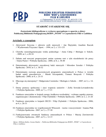 STAROŚĆ I STARZENIE SIĘ Zestawienie bibliograficzne w wyborze sporządzone w oparciu o zbiory Publicznej Biblioteki Pedagogicznej RODN „WOM” w Częstochowie Filii w Lublińcu Artykuły z czasopism 1. Aktywność fizyczna i zdrowie osób starszych / Jan Ślężyński, Joachim Raczek // Wychowanie Fizyczne i Sport. – 1994, nr 2, s. 131-133 2. Choroby neurodegeneracyjne wieku podeszłego / Anna Cabaj // Biologia w Szkole. – 2009, nr 1, s.28-34 3. Debata nad nowymi propozycjami zmian systemu rent z tyłu niezdolności do pracy / Edyta Pastor // Polityka Społeczna.- 2008, nr 8, s. 38-40 4. Determinanty aktywności zawodowej ludzi starszych / Mirosław Szreder // Polityka Społeczna.- 2010, nr 3, s. 30-32 5. Determinanty rozwoju pracowniczych programów emerytalnych w Polsce w świetle badań opinii pracodawców / Marek Szczepański, Tomasz Brzęczek // Polityka Społeczna.- 2008, nr 8, s. 25-31 6. Dlaczego się starzejemy? / Małgorzata Czernicka // Biologia w Szkole. – 2007, nr 2, s. 1418 7. Domy pomocy społecznej i sieci wsparcia seniorów / Zofia Szweda-Lewandowska // Polityka Społeczna.- 2009, nr 7, s. 17-21 8. Fundusze emerytalne w krajach europy środkowo-wschodniej : wybrane aspekty prawne, organizacyjne i ekonomiczne / Filip Chybalski // Polityka Społeczna.- 2009, nr 2, s. 21-26 9. Fundusze emerytalne w krajach OECD / Filip Chybalski // Polityka Społeczna.- 2006, nr 4, s. 26-31 10. Fundusze emerytalne we współczesnych Włoszech – teoria i rzeczywistość / Joanna Plak // Polityka Społeczna.- 2007, nr 3, s. 27-30 11. Funkcjonowanie otwartych funduszy emerytalnych w Polsce / Maciej Zawistowski // Polityka Społeczna.- 2007, nr 9, s. 12-15 Oprac. Elżbieta Kulisz, Iwona Dudzic – Publiczna Biblioteka Pedagogiczna RODN „WOM” w Częstochowie Filia w Lublińcu 1 12. Instytucja nowego systemu emerytalnego a realizacja celu reformy emerytalnej / Zofia Czepulis-Rutkowska // Polityka Społeczna.- 2002, nr 10, s. 21-24 13. Jak zestarzeć się z godnością? / Anna Zawada // Praca Socjalna. - 2009, nr 5, s. 104-114 14. Japonia : problem starzejącego się społeczeństwa / Dorota Głogosz // Polityka Społeczna.2001, nr 2, s. 15-18 15. Jesień przy otwartych drzwiach : wywiad / Ira Rosofsky rozm. przepr. Agnieszka Chrzanowska // Charaktery. – 2009, nr 6, s. 42-45 16. Kanadyjski system ubezpieczeń emerytalnych / Społeczna.- 2005, nr 10, s. 18-22 Sylwia Pieńkowska // Polityka 17. Konsekwencje ekonomiczne starzenia się ludności Polski : konferencja w Warszawie / oprac. Paweł Kubicki // Polityka Społeczna.- 2009, nr 4, s. 29-32 18. Koordynacja wspólnotowa emerytur i rent / Izabela Kryśpiak // Polityka Społeczna. - 2008, nr 11-12, s. 36-41 19. Ludzie starsi za wschodnią granicą : Lwów, Brześć, Grodno / Danuta M. Piekut-Brodzka // Polityka Społeczna.- 2003, nr 11-12, s. 28-31 20. Mózg w opałach / Sharon Begley // Newsweek Polska.- 2010, nr 27, s. 72-75 21. Na tropie matuzalema / Grażyna Mosieniak // Charaktery. – 2009, nr 2, s. 80-84 22. Nauczyciele kończący karierę zawodową / Bohumira Lazarova ; tł. Danuta Elsner // Dyrektor Szkoły. – 2007, nr 3, s. 14-18 23. Nowe kwestie społeczne : znęcania się nad osobami najbliższymi, zależnymi, małoletnimi i nieporadnymi / Monika Teterycz // Polityka Społeczna.- 2003, nr 10, s. 13-16 24. Odprawa rentowa lub emerytalna w świetle orzecznictwa sądu najwyższego / Irena Sawa // Polityka Społeczna.- 2007, nr 3, s. 12-16 25. Osoby najstarsze w Polsce / Piotr Szukalski // Polityka Społeczna.- 2001, nr 9, s. 30-34 26. Państwu już dziękujemy : natychmiast zacznij oszczędzać na starość. Opowieści o przyzwoitej emeryturze możesz między bajki włożyć / Miłosz Węglewski // Newsweek Polska.- 2010, nr 25, s. 47-49 27. Poziomy polskiego systemu zabezpieczania emerytalnego / Paweł Zieliński // Polityka Społeczna.- 2009, nr 2, s. 10-14 28. Problemy zdrowotne ludzi starych : wybrane zagadnienia / Arkadiusz Przybyłka // Polityka Społeczna.- 2002, nr 8, s. 12-16 Oprac. Elżbieta Kulisz, Iwona Dudzic – Publiczna Biblioteka Pedagogiczna RODN „WOM” w Częstochowie Filia w Lublińcu 2 29. Proces starzenia się ludności – potrzeby i wyzwania : ogólna konferencja w Łodzi / Artur Laskowski // Polityka Społeczna.- 2002, nr 10, s. 35-37 30. Proponowane zmiany w publicznym systemie emerytalnym w Polsce : głos w dyskusji / Marek Szczepański // Polityka Społeczna.- 2010, nr 5-6, s.18-23 31. Przeciwdziałanie skutkom starzenia się społeczeństw w krajach wysoko rozwiniętych / Małgorzata Sulmicka // Polityka Społeczna.- 2003, nr 4, s. 24-29 32. Przemiany wieku emerytalnego / Wojciech Muszalski // Polityka Społeczna.- 2009, nr 3, s. 7-11 33. Przestępstwa na tle majątkowym popełniane na szkodę osób starszych / Zygmunt Kukała // Praca Socjalna. - 2009, nr 3, s. 94-114 34. Przyszłość ludzi starych / Rodger Doyle // Świat Nauki. – 1998, nr 7, s. 15 35. Przyszłość systemu emerytalnego w Polsce / Aleksandra Wiktorow // Polityka Społeczna.2005, nr 3, s. 15-17 36. Publiczny system emerytalny w Wielkiej Brytanii / Sylwia Pieńkowska // Polityka Społeczna.- 2007, nr 2, s. 20-26 37. Reforma Amato i Diniego we Włoszech – w poszukiwaniu idealnego systemu emerytalnego / Joanna Plak // Polityka Społeczna.- 2006, nr 10, s. 18-22 38. Reformy emerytalna w Niemczech (z 2001r.) i w Wielkiej Brytanii (w latach 90.) : stabilność finansowa systemów emerytalnych a adekwatność emerytur / Zofia Czajka // Polityka Społeczna.- 2004, nr 1, s. 17-22 39. Ręce precz od mojej składki : premier powinien przeciąć spór o reformę emerytalną / Piotr Aleksandrowicz // Newsweek Polska.- 2010, nr 25, s. 50 40. Rola i zadania osób starszych w środowisku lokalnym : konferencja w Łodzi / Beata Ziębińska // Polityka Społeczna.- 2004, nr 7, s. 37-39 41. Rola lamin w fizjologicznym i przedwczesnym starzeniu / Małgorzata Alicja Śliwińska // Biologia w Szkole. – 2008, nr 2, s. 19-27 42. Rola pa