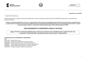 Załącznik nr 1b do SIWZ ……………………………………… (pieczęć firmowa Wykonawcy) Dotyczy postępowania o udzielenie zamówienia publicznego o wartości szacunkowej przekraczającej 207 000 EURO prowadzonego w trybie przetargu nieograniczonego pn.: Dostawa i instalacja spektrometru mas wraz z wyposażeniem i akcesoriami oraz kompleksowego systemu do przechowywania i obróbki danych ze spektrometrów mas dla Pracowni Zastosowań Metod Separacji i Spektroskopii Katolickiego Uniwersytetu Lubelskiego Jana Pawła II w ramach realizacji projektu „Budowa i wyposażenie Interdyscyplinarnego Centrum Badań Naukowych KUL” OPIS PRZEDMIOTU ZAMÓWIENIA WRAZ Z WYCENĄ Część 2: Dostawa i instalacja kompleksowego systemu do przechowywania i obróbki danych ze spektrometrów mas, co najmniej 5-stanowiskowego z oprogramowaniem, bazami danych i wyposażeniem I. SZCZEGÓŁOWY OPIS PRZEDMIOTU ZAMÓWIENIA CPV: 38433100-0 - Spektrometry masy 30233100-2 - Komputerowe jednostki do przechowywania 48000000-8 - Pakiety oprogramowania i systemy informatyczne 48900000-7 - Różne pakiety oprogramowania i systemy informatyczne 51900000-1 - Usługi instalowania systemów sterowania i kontroli 38540000-2 - Maszyny i aparatura badawcza i pomiarowa 1 Wykonawca: Nazwa urządzenia: model, typ aparatu, nr katalogowy Producent: pełna nazwa, adres, strona www Kraj pochodzenia: Rok produkcji (wymagany:2014 lub 2015) A. PARAMETRY TECHNICZNE I EKSPLOATACYJNE URZADZENIA Lp Parametr wymagany Parametr oferowany ZASTOSOWANIE 1. System musi współpracować z chromatografem cieczowym sprzężonym ze spektrometrem mas typu potrójny kwadrupol - Aglient Technologies LC-QQQ 6460 oraz chromatografem cieczowym sprzężonym ze spektrometrem mas typu kwadrupol czas przelotu Agilent Technologies Q/TOF 6538 LC/MS, których właścicielem jest Zamawiający. Oba spektrometry mas posiadane przez Zamawiającego mają zainstalowane oprogramowanie Agilent Technologies Mass Hunter, które steruje urządzeniem i służy do obróbki danych. SKŁADOWE SYSTEMU Oprogramowanie do zbierania danych oraz zaawansowanej obróbki danych jakościowych i ilościowych – 7 licencji 2. Oprogramowanie do zbierania danych oraz zaawansowanej obróbki danych jakościowych i ilościowych musi umożliwiać: 2 – natywną obsługę (odczyt i zapis) danych zbieranych za pomocą detektorów masowych (spektrometrów masowych), bez konieczności ich translacji i eksportu, za pomocą programów narzędziowych będących produktem firmy, której przedstawicielem jest oferent lub tez oprogramowania firm trzecich. – bezproblemową współpracę z dostarczonym serwerem plików, na którym będzie prowadzony odczyt i zapis: danych, plików wynikowych analiz, metod akwizycyjnych, analizy jakościowej i ilościowej, raportów z analizy jakościowej i ilościowej. – wykonywanie analizy na dowolnym komputerze do obróbki danych offline (bez kontroli nad instrumentem), zarówno dla danych uzyskanych z tandemowego spektrometru masowego, jak też ze spektrometru czasu przelotu - bez względu na rodzaj danych zależny od trybu ich akwizycji SCAN, SIM, Production, MRM itp. Komunikacja pomiędzy stacjami roboczymi do zbierania i/lub obróbki danych z ze wszystkimi modułami, jak również serwerem plików, musi się odbywać za pośrednictwem sieci LAN bez konieczności stosowania jakichkolwiek adapterów interfejs modułu - siec LAN. Dostarczone uaktualnienie oprogramowania do akwizycji i obróbki danych: – musi zapewniać pełną współpracę z posiadanymi zestawami chromatografu cieczowego z detektorem mas (tandemowym lub czasu przelotu), – musi zapewniać pełną wsteczną kompatybilność z danymi zebranymi za pomocą starszych wersji oprogramowania sterującego posiadanymi przez Zamawiającego spektrometrami mas. 3. Dostarczone uaktualnienie oprogramowania musi zawierać licencje dla zestawów: chromatograf cieczowy sprzężony z analizatorem czasu przelotu, chromatograf cieczowy sprzężony z tandemowym detektorem mas oraz 5 licencji offline do stacji roboczych. Serwer plików – 1 sztuka 3 4. Oferowany serwer plików powinien być wyposażony w: – obudowę umożliwiającą montaż do szafy rack o wysokości do 2U – płytę główną – procesor zgodny z architekturą x86 i x64; osiągający co najmniej 6000 punktów w teście wydajnościowym PassMark PerformanceTest wg. kolumny Passmark CPU Mark, którego wyniki są publikowane na stronie http://cpubenchmark.net/cpu_list.php, (stan na 16.12.2014); – co najmniej 2GB z mozliwoscia rozbudowy do 4 GB pamięci RAM z możliwością rozbudowy – zainstalowany system operacyjny – zasilacz o mocy niezbędnej do prawidłowej pracy serwera; – możliwość montażu co najmniej 8 dysków oraz zapewniać łatwą rozbudowę w wypadku konieczności zwiększenia ilości dysków poprzez dedykowane moduły – 8 dysków klasy Enterprise o pojemności nie mniejszej niż 4TB, zaprojektowanych/przeznaczonych do pracy w macierzy. – dwie karty sieciowe w celu zapewnienia nadmiarowości i/lub zarządzania obciążeniem – co najmniej dwa porty USB 3.0, dwa porty USB 2.0 oraz 1 port eSATA umożliwiające podłączenie dysku zewnętrznego, drukarek itp. – funkcję hot swap RAID 0/1/5/6/10/5+spare z funkcją auto-rebuild i rozbudową w locie – pełne wsparcie dla wykorzystywanego przez Zamawiającego mechanizmu usługi katalogowej Active Directory – obsługę protokołu iSCSI – współdzielenie zasobów np. drukarki USB - panel użytkownika i oprogramowanie dostępne w języku polskim – oferować funkcje uwierzytelniania użytkowników, pełną kontrolę dostępu do danych. Zarządzalny przełącznik sieciowy – 2 sztuki co najmniej 16portowy przełącznik sieciowy warstwy 2. - 10/100/1000Mbit wraz ze wszystkimi niezbędnymi akcesoriami do montażu w szafie rack. Przełączniki sieciowe powinny zostać połączone za pomocą łącza światłowodowego, które zostanie dostarczone i zainstalowane pr
