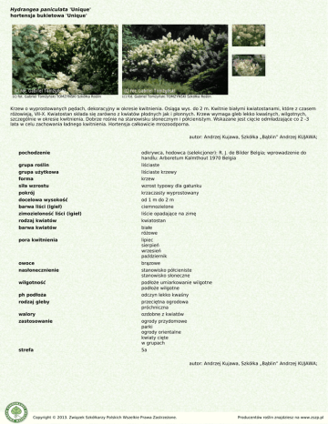 Hydrangea paniculata 'Unique' hortensja bukietowa 'Unique' (c) fot. Gabriel Tomżyński TOMŻYŃSKI Szkółka Roślin (c) fot. Gabriel Tomżyński TOMŻYŃSKI Szkółka Roślin Krzew o wyprostowanych pędach, dekoracyjny w okresie kwitnienia. Osiąga wys. do 2 m. Kwitnie białymi kwiatostanami, które z czasem różowieją, VII-X. Kwiatostan składa się zarówno z kwiatów płodnych jak i płonnych. Krzew wymaga gleb lekko kwaśnych, wilgotnych, szczególnie w okresie kwitnienia. Dobrze rośnie na stanowisku słonecznym i półcienistym. Wskazane jest cięcie odmładzające co 2 -3 lata w celu zachowania ładnego kwitnienia. Hortensja całkowicie mrozoodporna. autor: Andrzej Kujawa, Szkółka „Bąblin” Andrzej KUJAWA; pochodzenie odkrywca, hodowca (selekcjoner): R. J. de Bilder Belgia; wprowadzenie do handlu: Arboretum Kalmthout 1970 Belgia grupa roślin liściaste grupa użytkowa liściaste krzewy forma krzew siła wzrostu wzrost typowy dla gatunku pokrój krzaczasty wyprostowany docelowa wysokość od 1 m do 2 m barwa liści (igieł) ciemnozielone zimozieloność liści (igieł) liście opadające na zimę rodzaj kwiatów kwiatostan barwa kwiatów białe różowe pora kwitnienia lipiec sierpień wrzesień październik owoce brązowe nasłonecznienie stanowisko półcieniste stanowisko słoneczne wilgotność podłoże umiarkowanie wilgotne podłoże wilgotne ph podłoża odczyn lekko kwaśny rodzaj gleby przeciętna ogrodowa próchniczna walory ozdobne z kwiatów zastosowanie ogrody przydomowe parki ogrody orientalne kwiaty cięte w grupach strefa 5a autor: Andrzej Kujawa, Szkółka „Bąblin” Andrzej KUJAWA; Copyright © 2013. Związek Szkółkarzy Polskich Wszelkie Prawa Zastrzeżone. Producentów roślin znajdziesz na www.zszp.pl